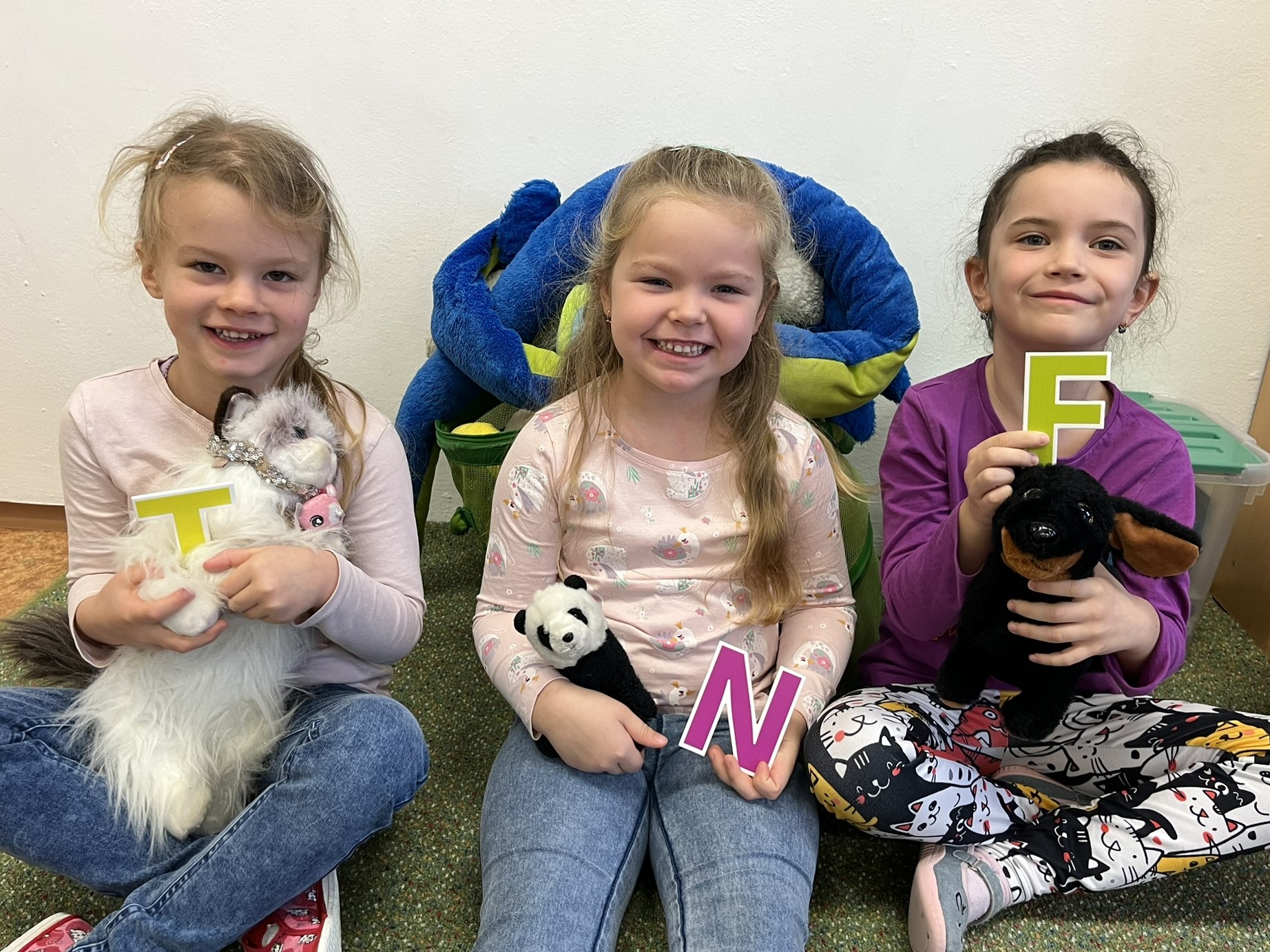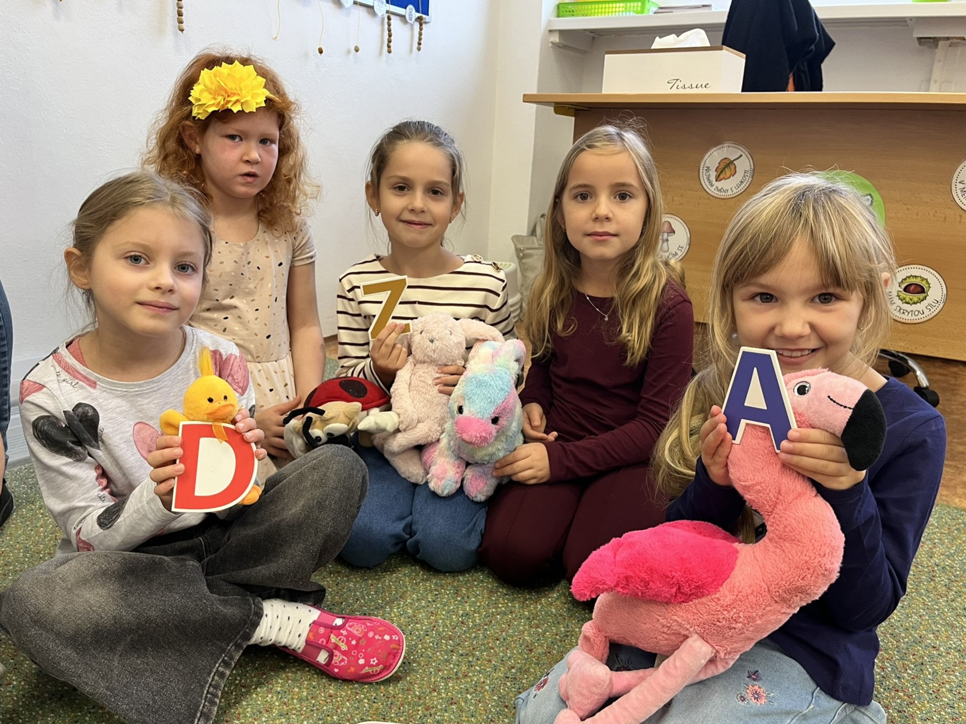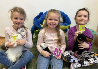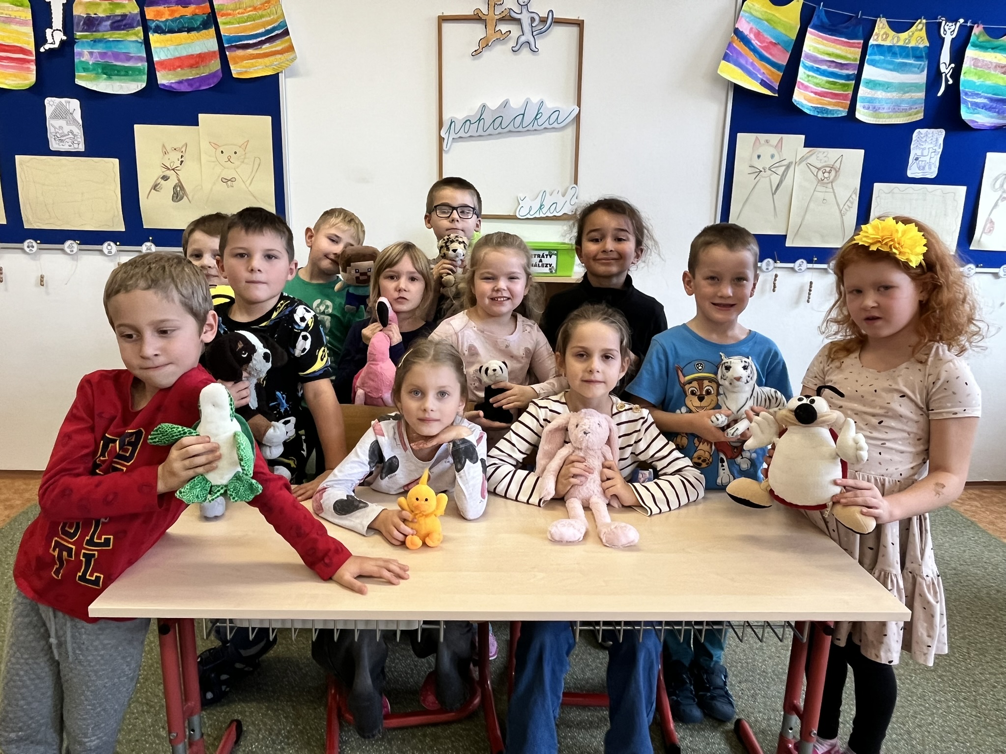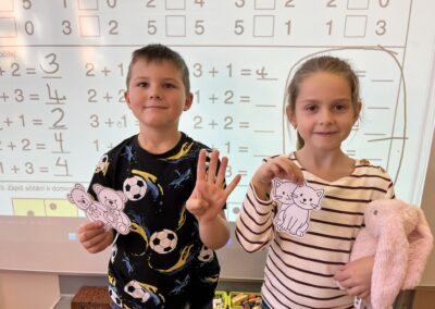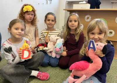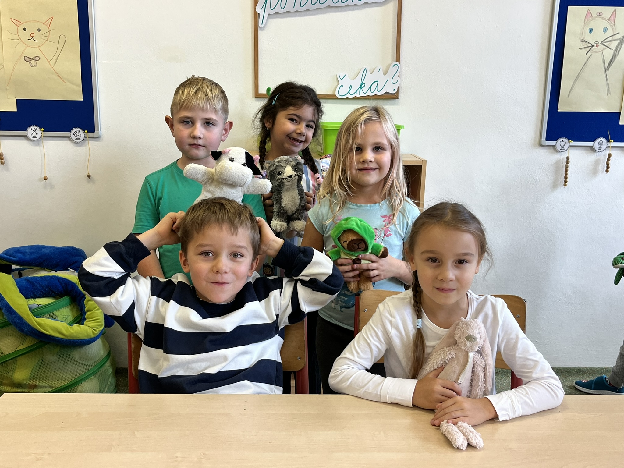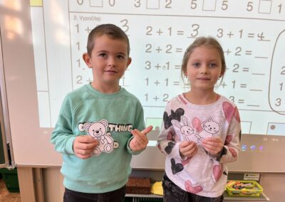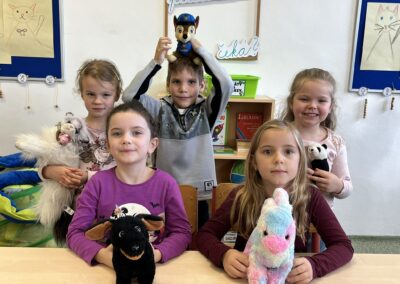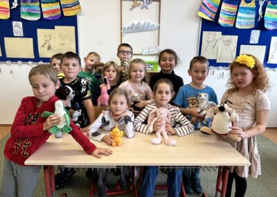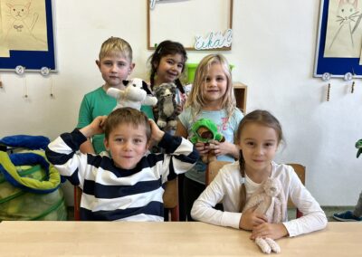 Ráno jsme si v kruhu na koberci povídali o tom, jakého plyšáka jsme si přinesli a jak se jmenuje. Ke jménu jsme také přiřazovali první písmenko. V hodině českého jazyka jsme plyšáky pozorovali, popisovali a zahráli si běhací hru se slabikami. V matematice jsme vytvořili graf četnosti plyšáků a ukazovali jim, jak už umíme sčítat do čtyř.