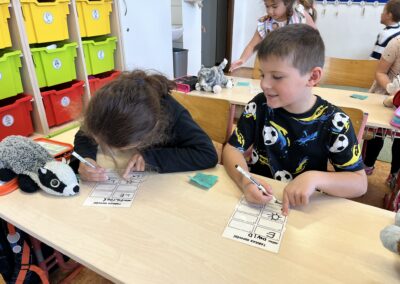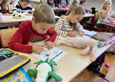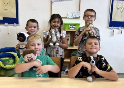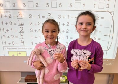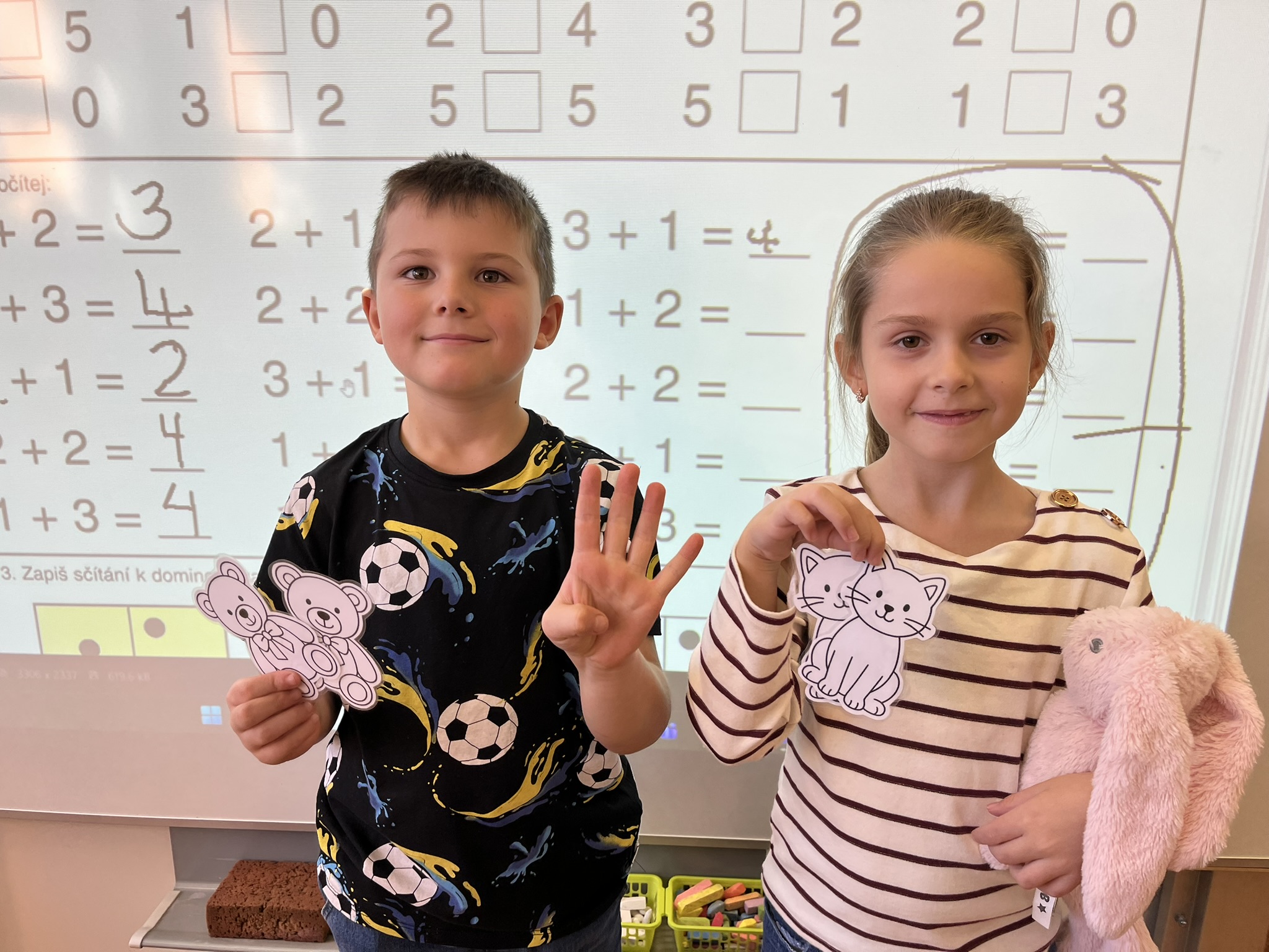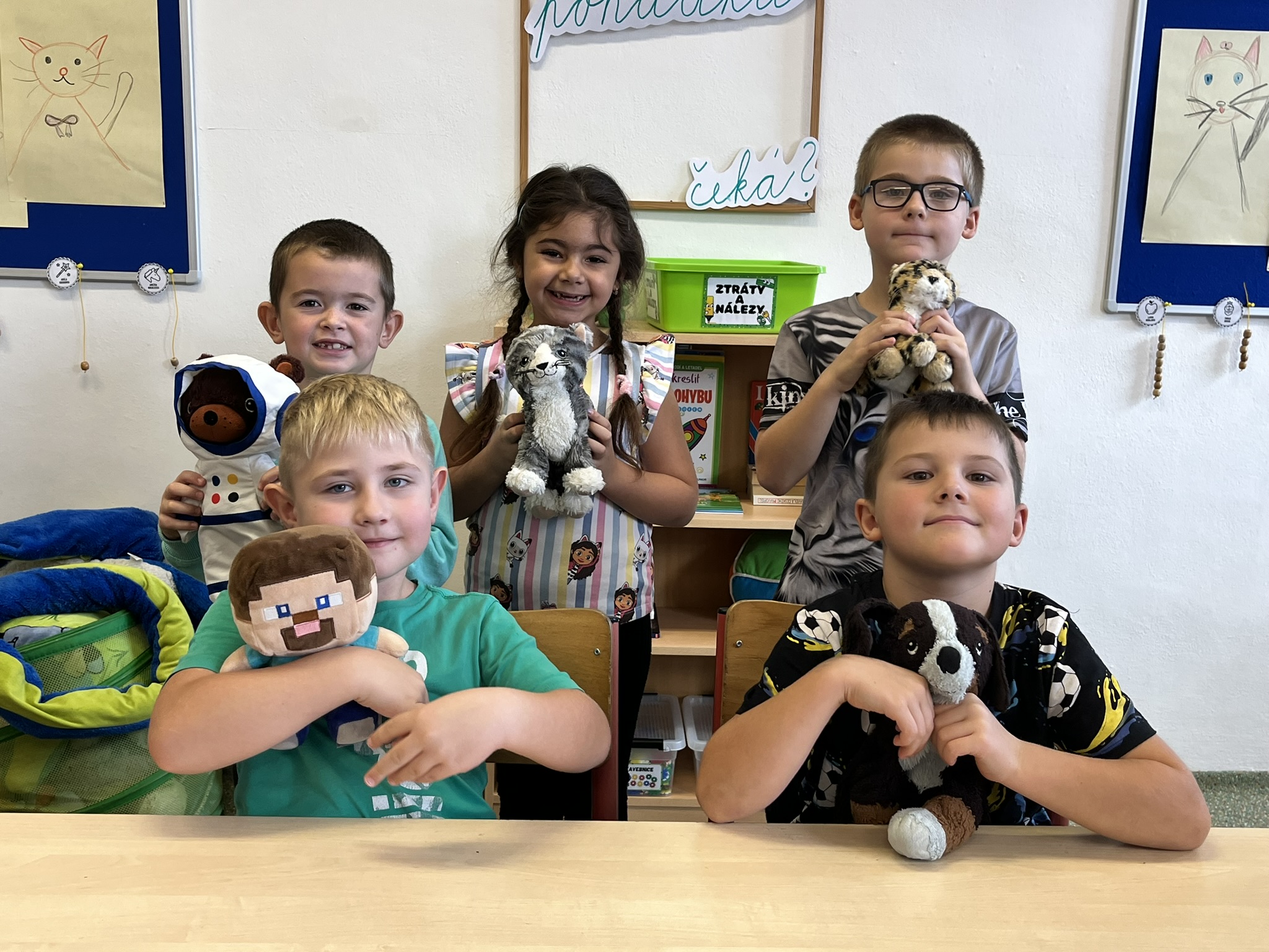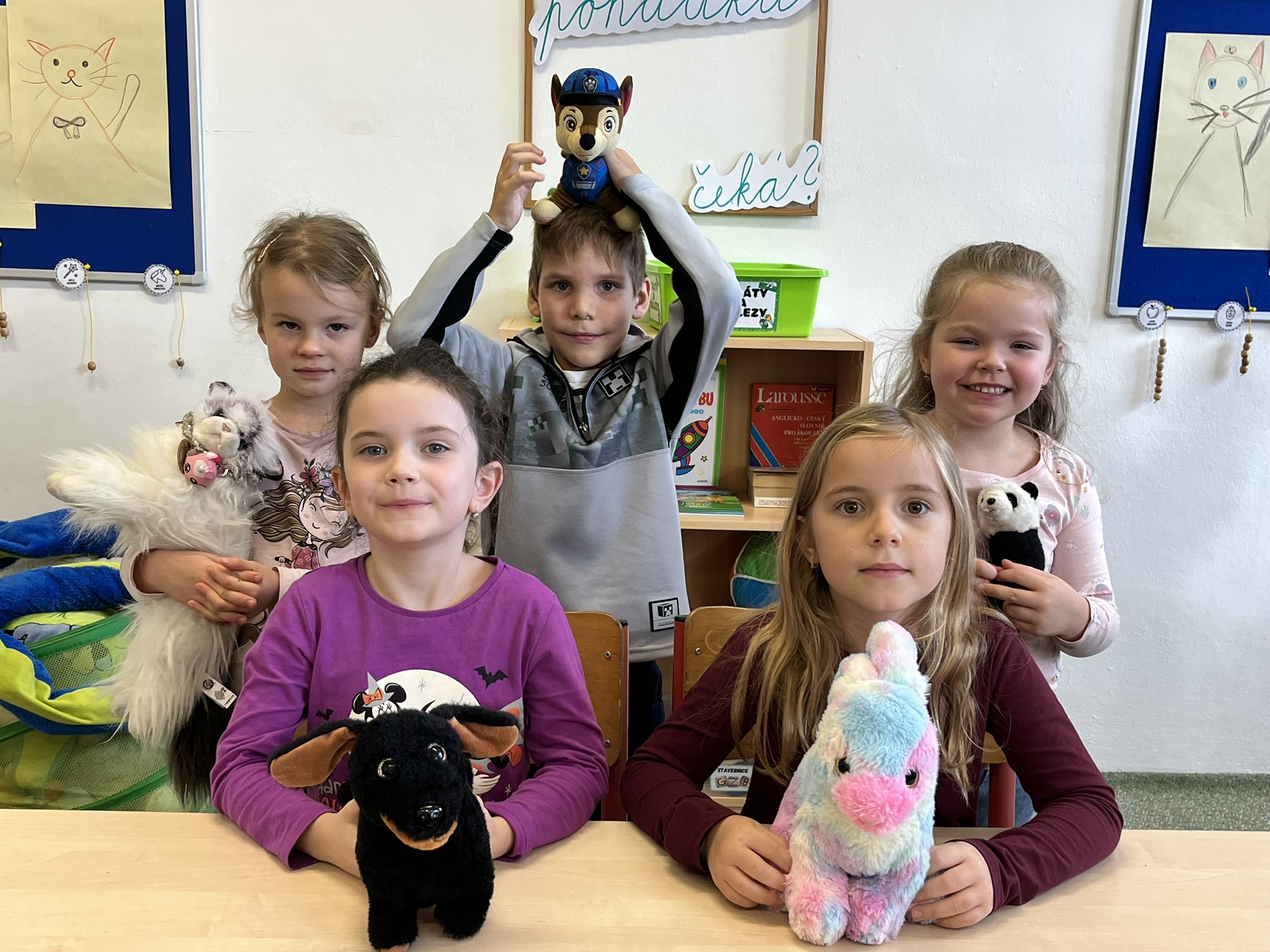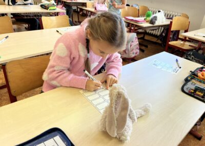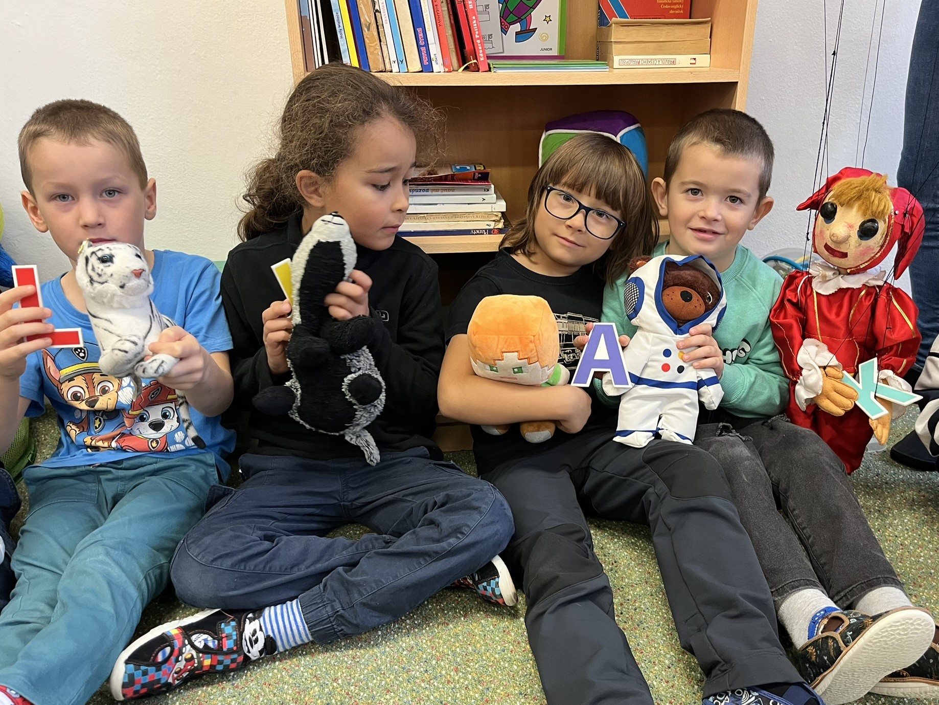 Ráno jsme si v kruhu na koberci povídali o tom, jakého plyšáka jsme si přinesli a jak se jmenuje. Ke jménu jsme také přiřazovali první písmenko. V hodině českého jazyka jsme plyšáky pozorovali, popisovali a zahráli si běhací hru se slabikami. V matematice jsme vytvořili graf četnosti plyšáků a ukazovali jim, jak už umíme sčítat do čtyř.