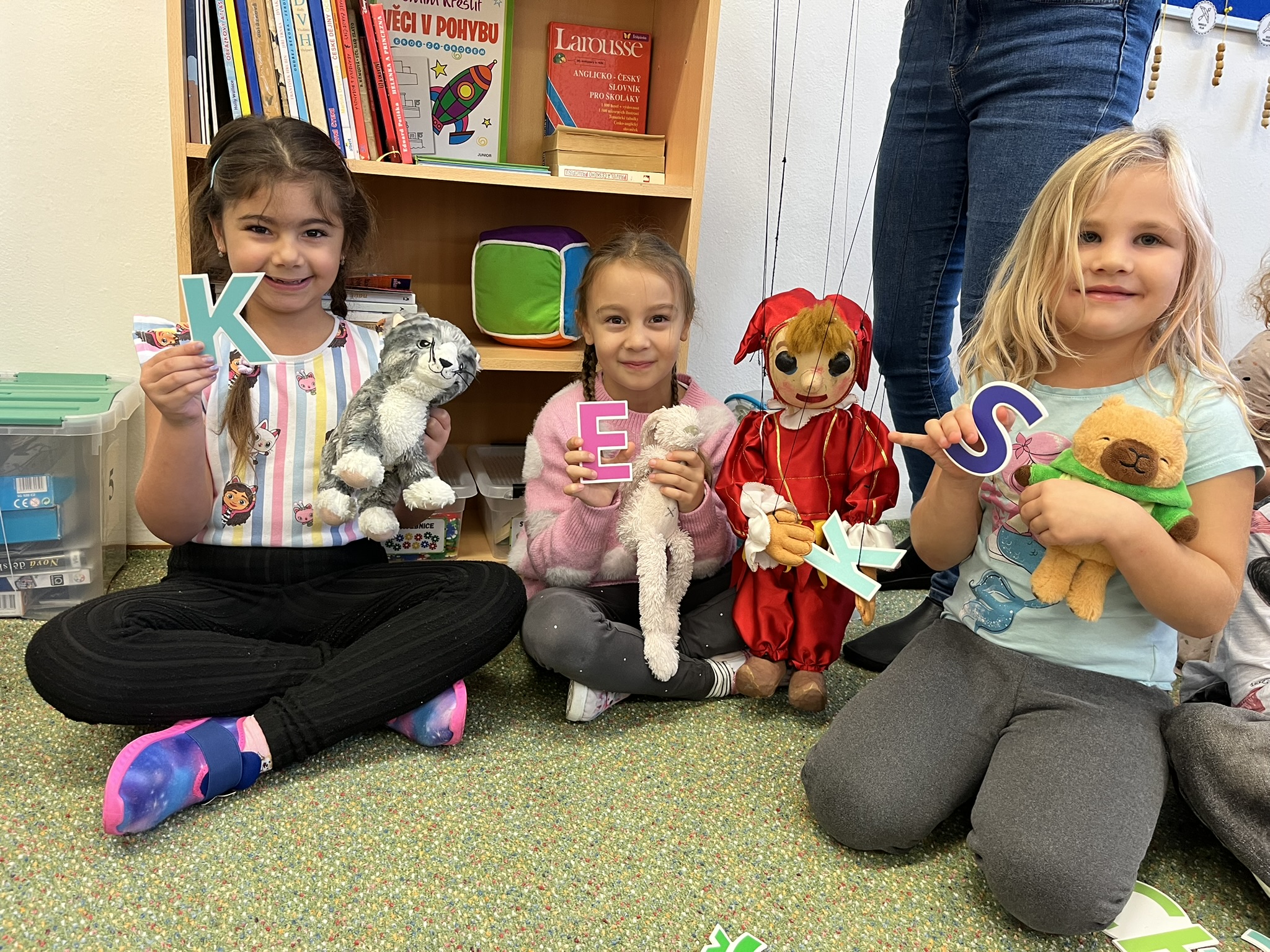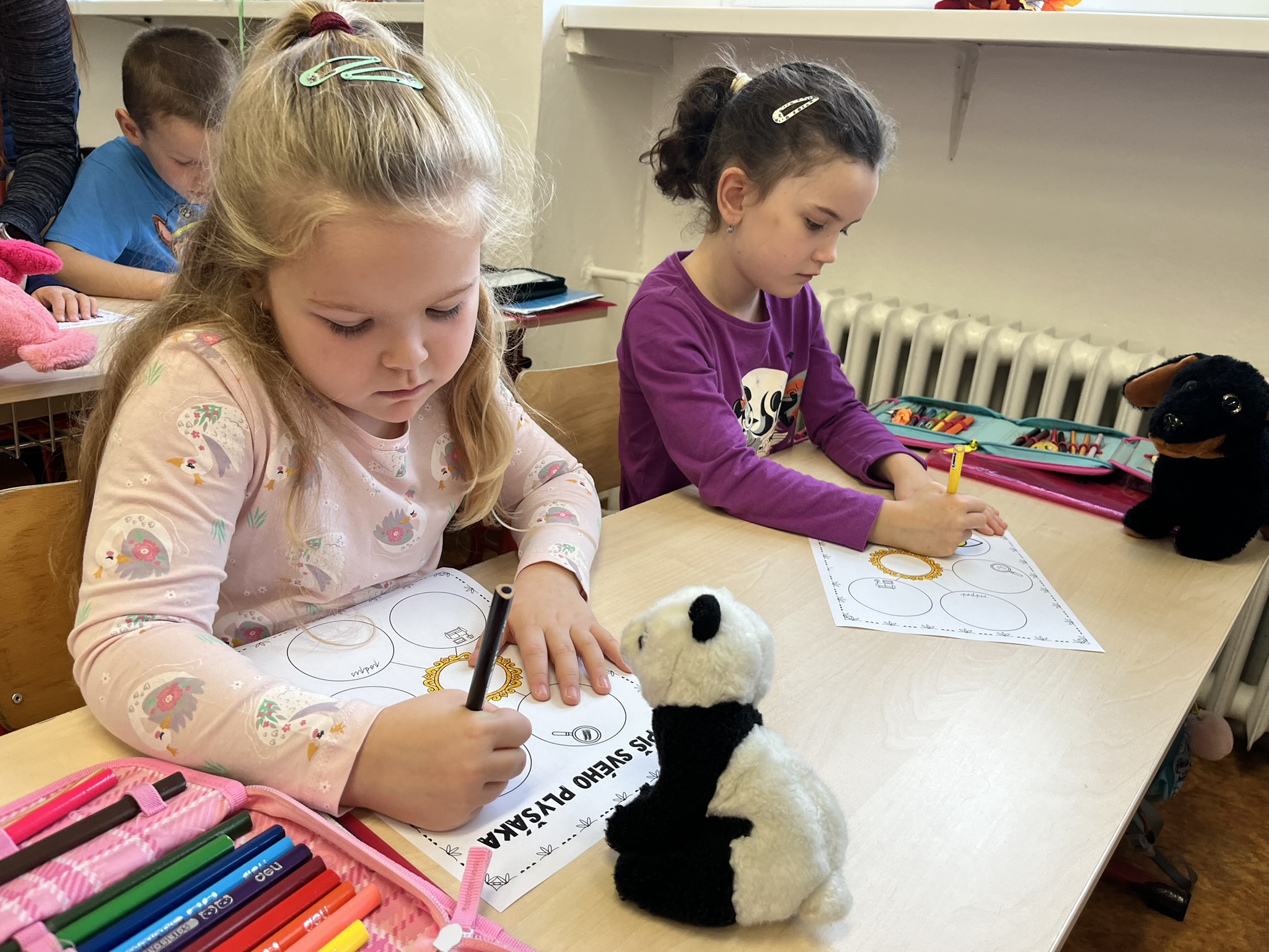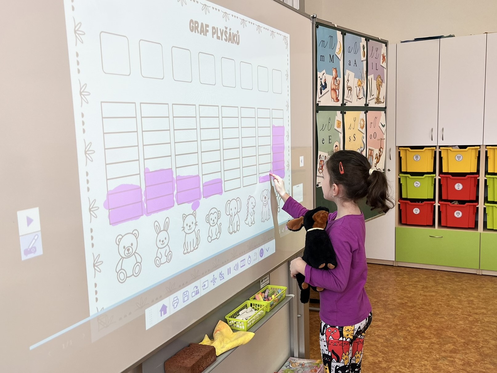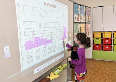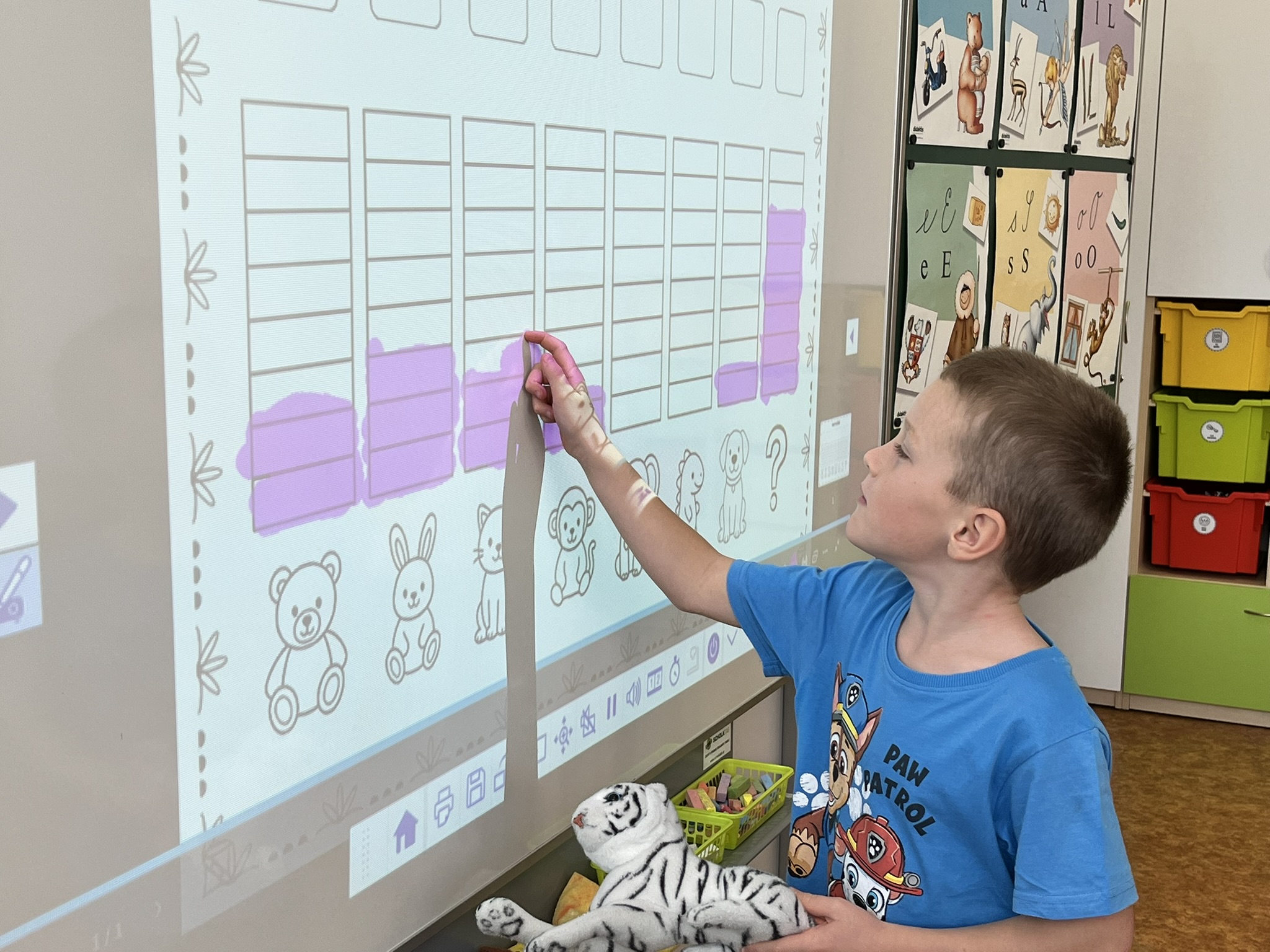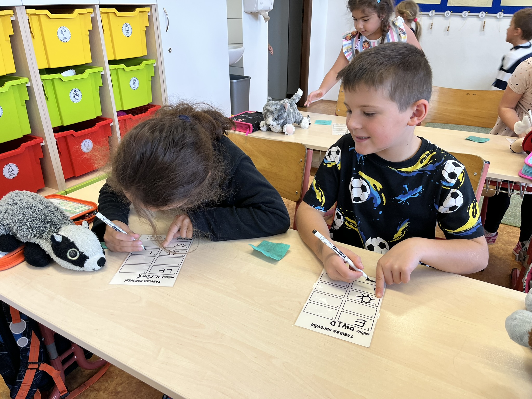 Ráno jsme si v kruhu na koberci povídali o tom, jakého plyšáka jsme si přinesli a jak se jmenuje. Ke jménu jsme také přiřazovali první písmenko. V hodině českého jazyka jsme plyšáky pozorovali, popisovali a zahráli si běhací hru se slabikami. V matematice jsme vytvořili graf četnosti plyšáků a ukazovali jim, jak už umíme sčítat do čtyř.