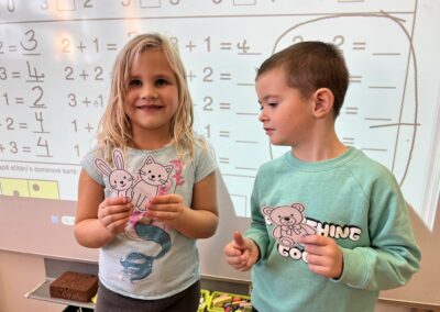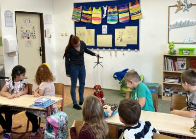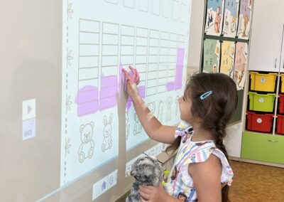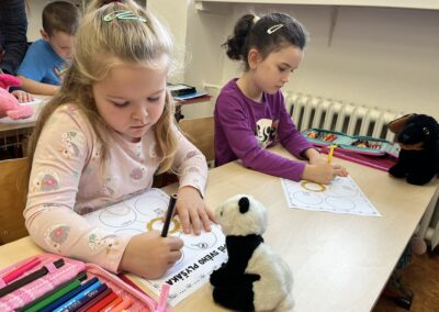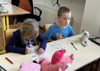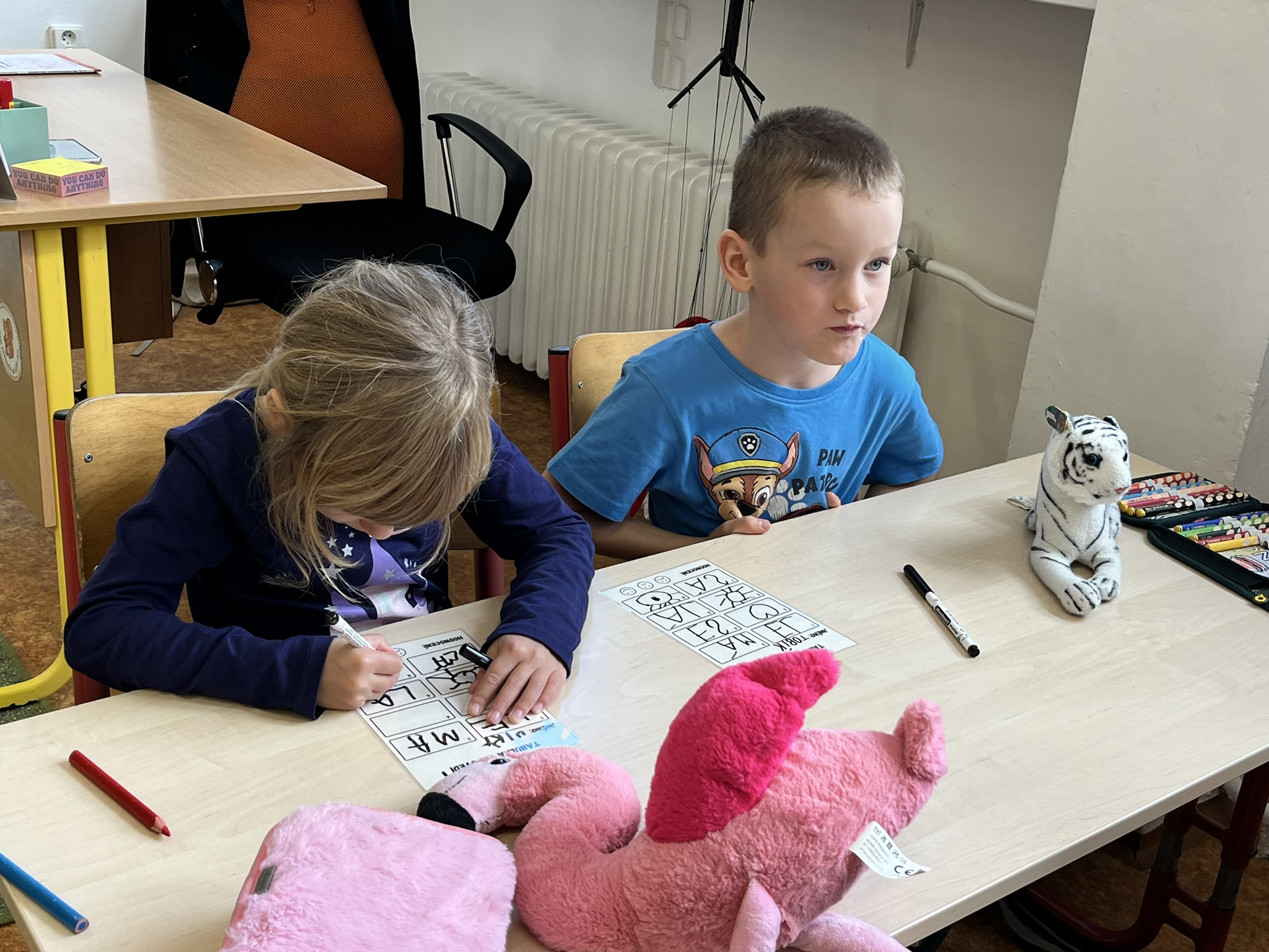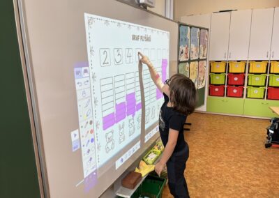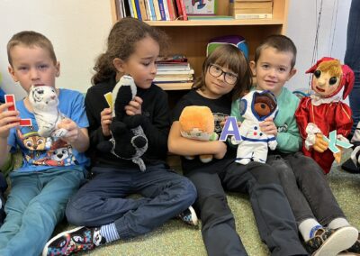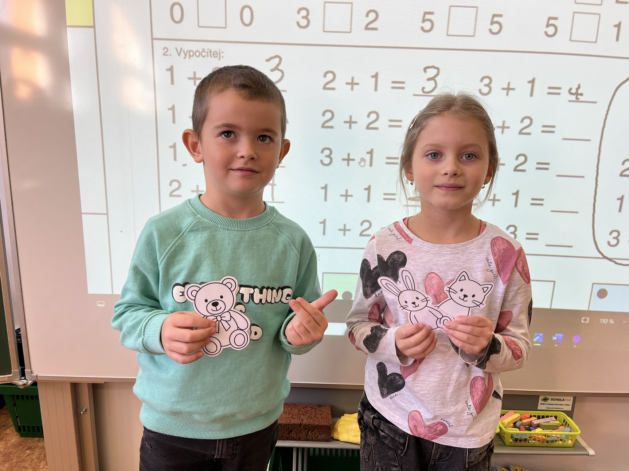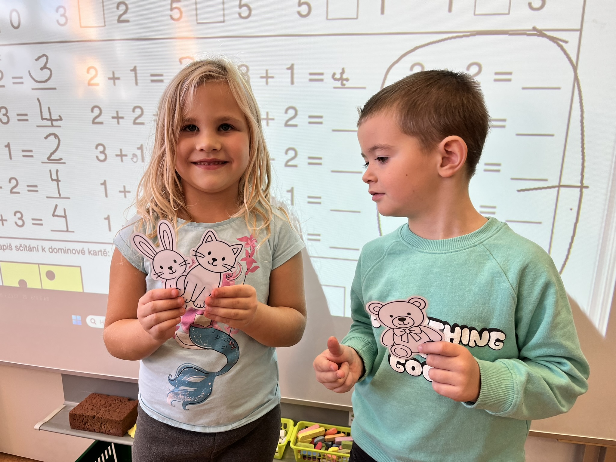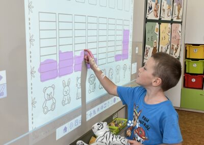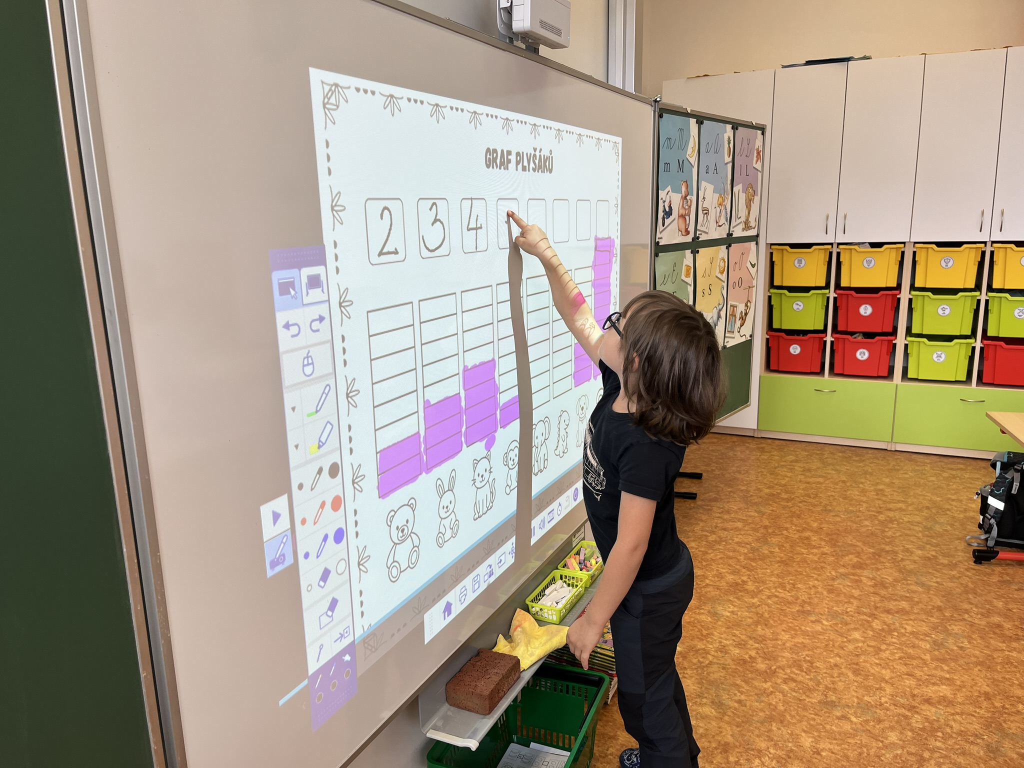 Ráno jsme si v kruhu na koberci povídali o tom, jakého plyšáka jsme si přinesli a jak se jmenuje. Ke jménu jsme také přiřazovali první písmenko. V hodině českého jazyka jsme plyšáky pozorovali, popisovali a zahráli si běhací hru se slabikami. V matematice jsme vytvořili graf četnosti plyšáků a ukazovali jim, jak už umíme sčítat do čtyř.