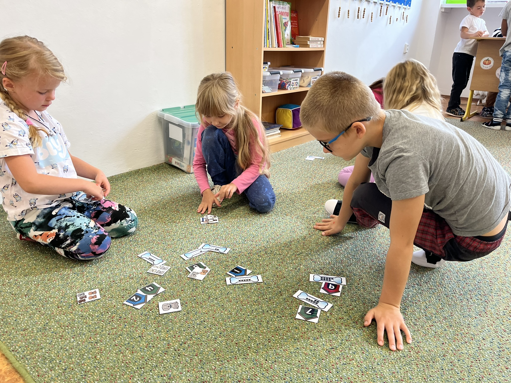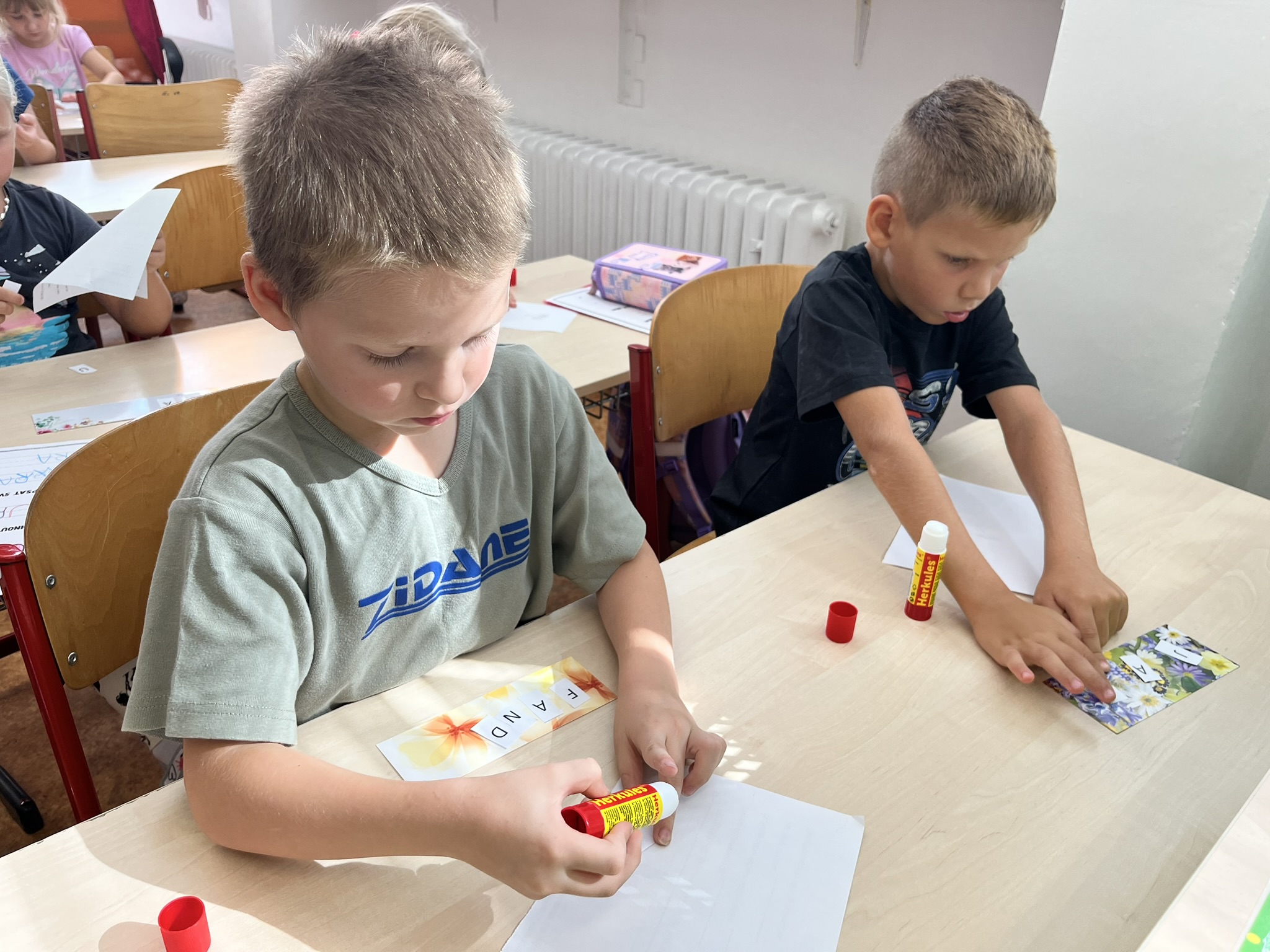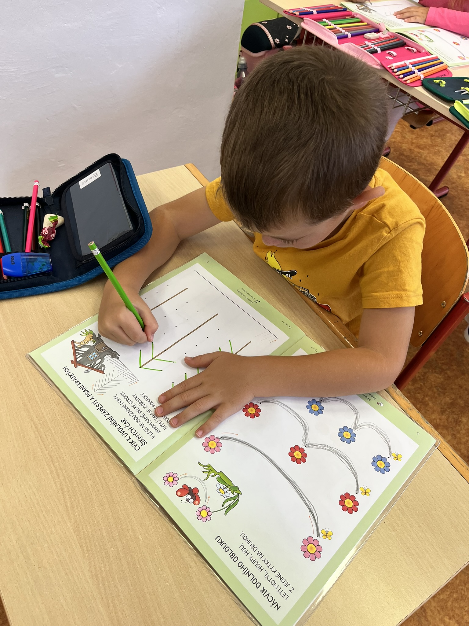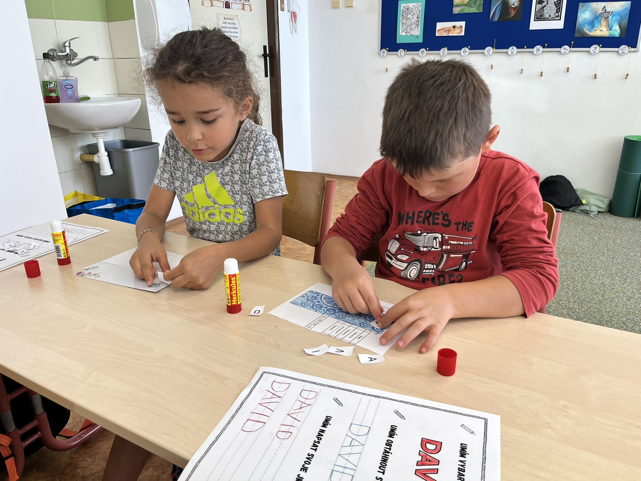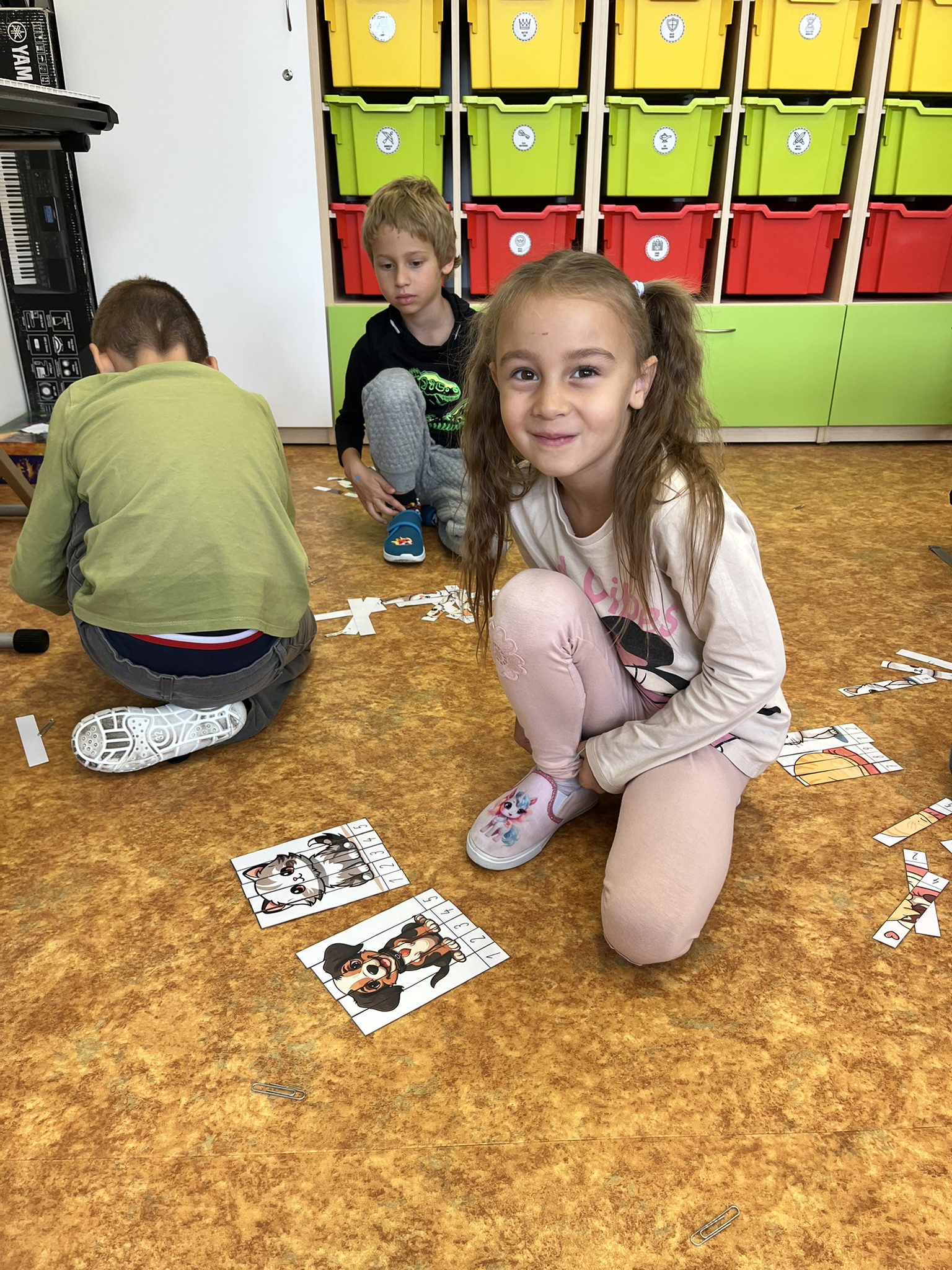 Společně jsme skládali obrázky s čísly, vyhledávali první hlásky na ilustracích z knihy a stavěli domečky podle jejich představ a návrhů. To nás moc bavilo! Paní učitelka nám přečetla příběh o tom, jak si pejsek roztrhl kalhoty a my jsme mu pomohli je znovu zašít. Během výtvarné výchovy jsme pak ozdobili košilku barvami, aby se jí pyšná košilka už nesmála.