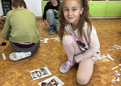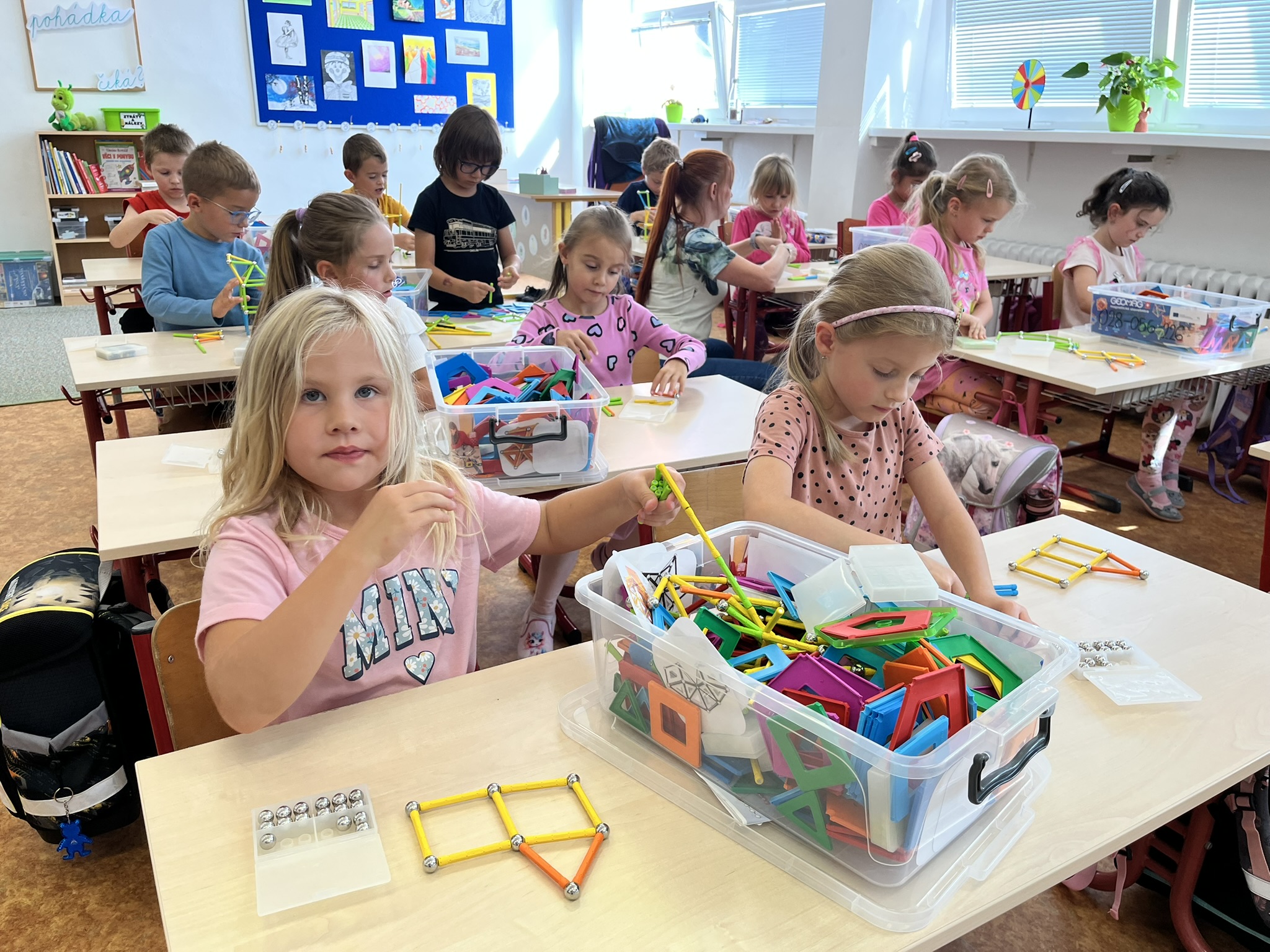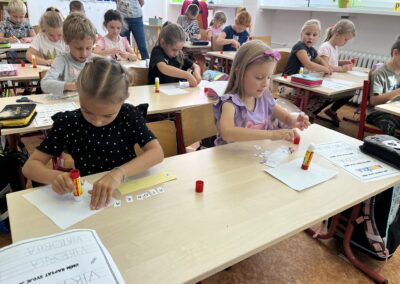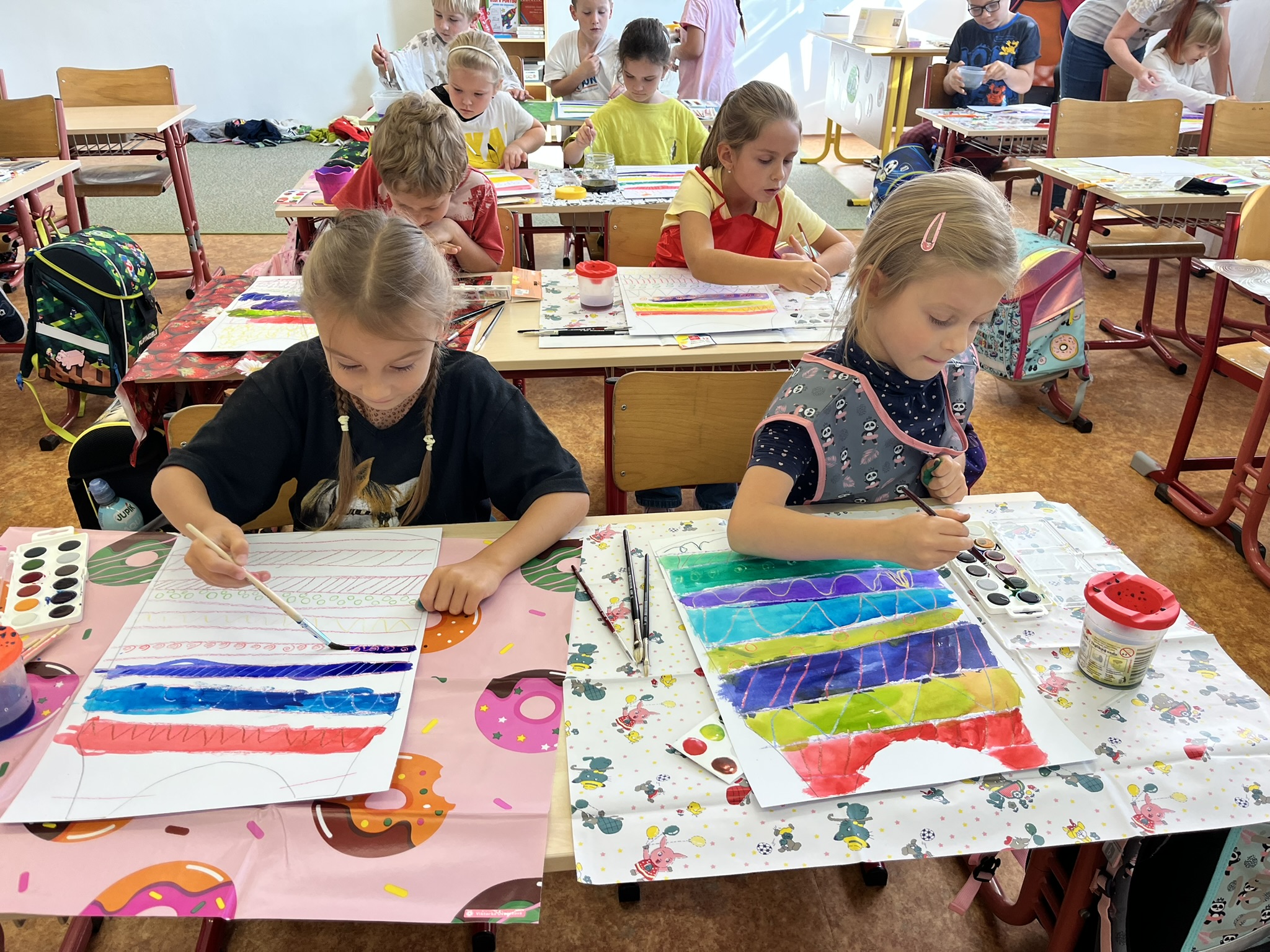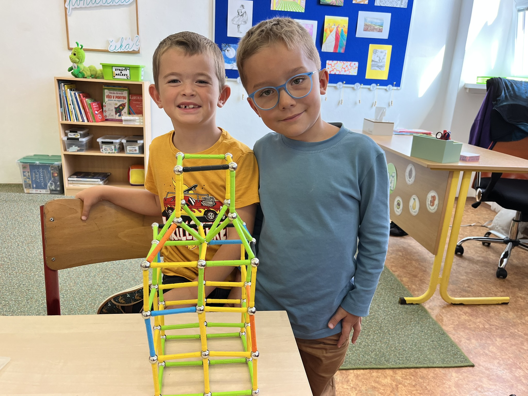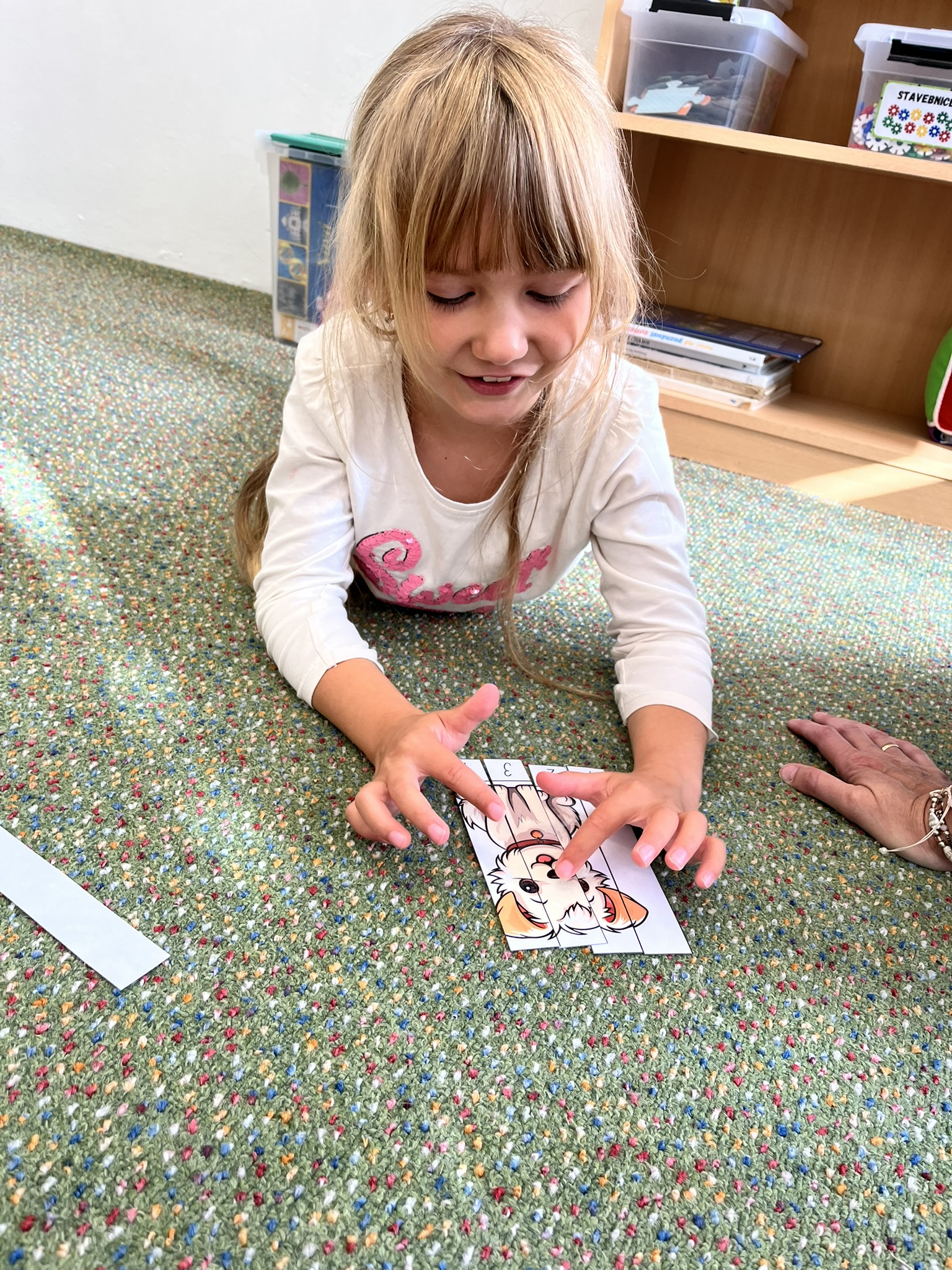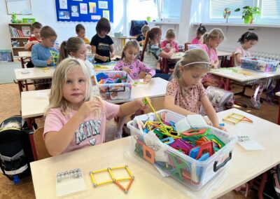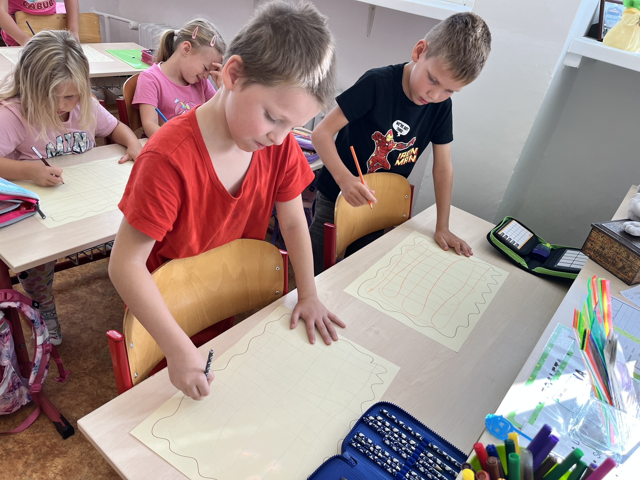 Společně jsme skládali obrázky s čísly, vyhledávali první hlásky na ilustracích z knihy a stavěli domečky podle jejich představ a návrhů. To nás moc bavilo! Paní učitelka nám přečetla příběh o tom, jak si pejsek roztrhl kalhoty a my jsme mu pomohli je znovu zašít. Během výtvarné výchovy jsme pak ozdobili košilku barvami, aby se jí pyšná košilka už nesmála.