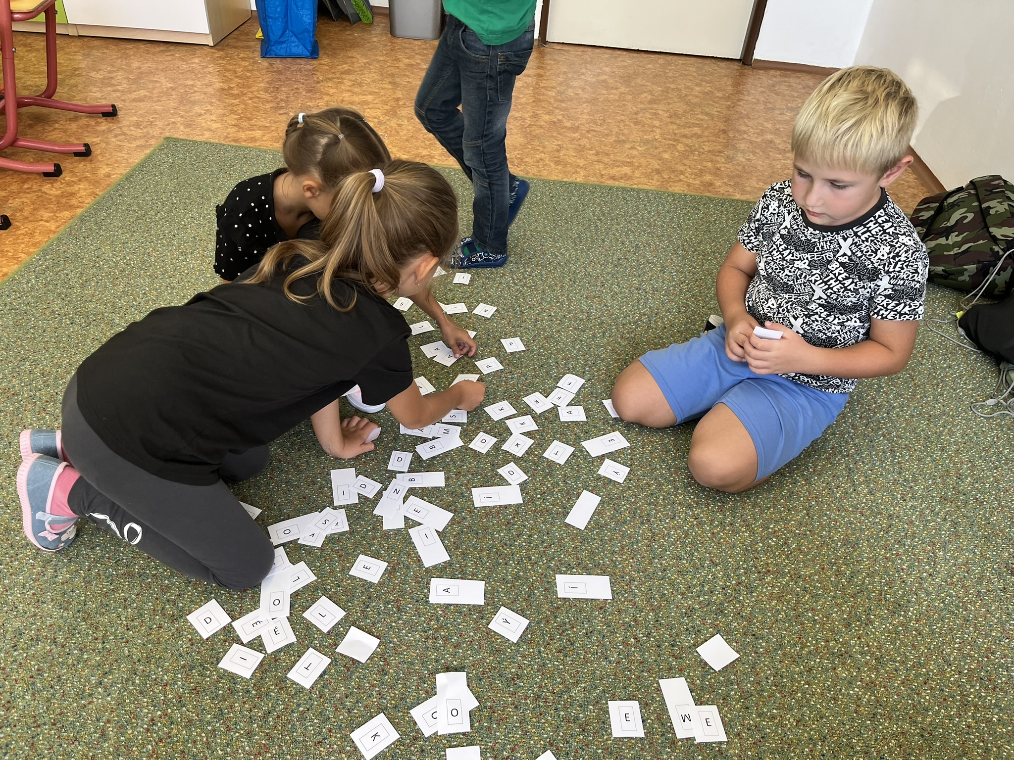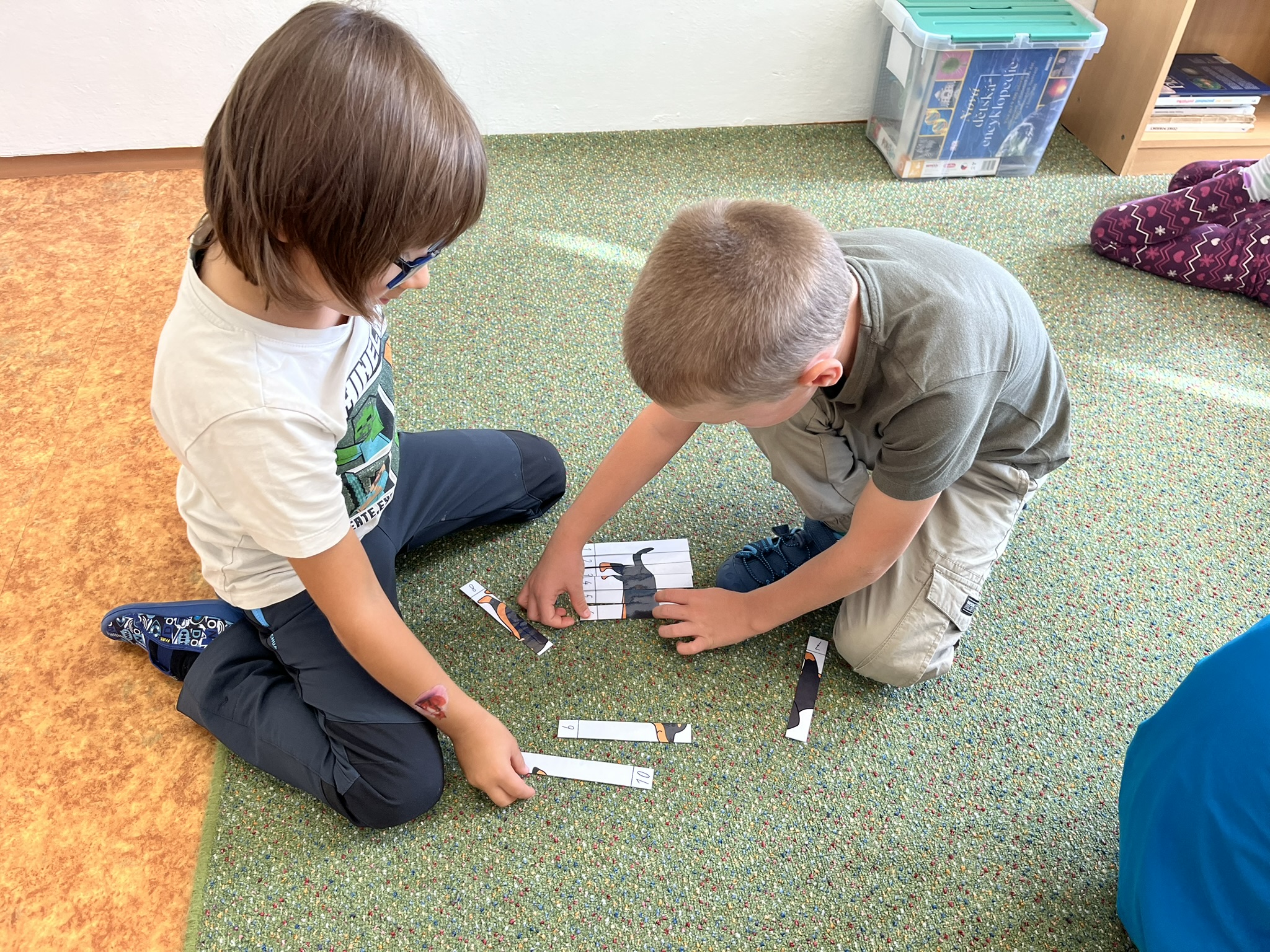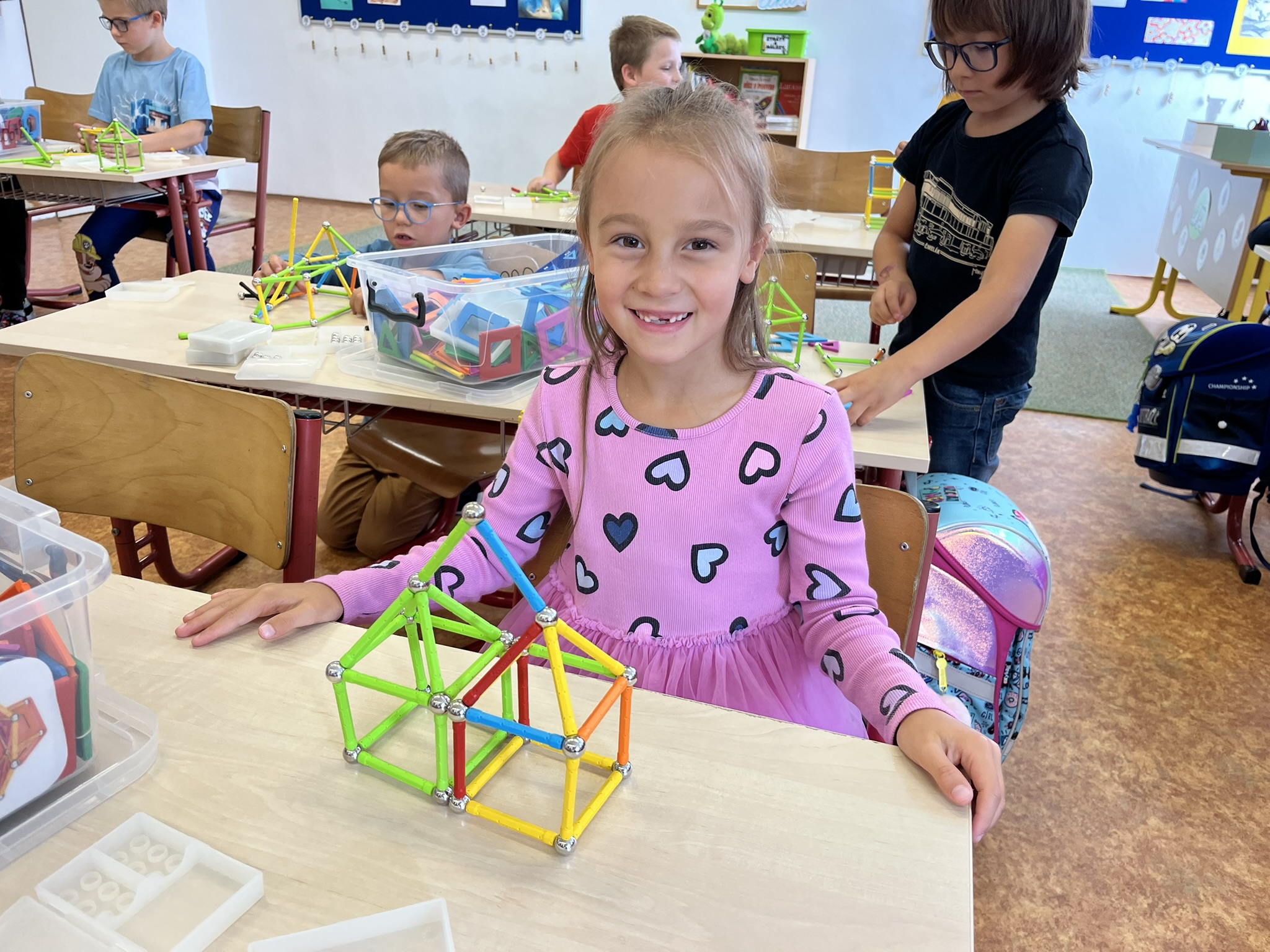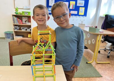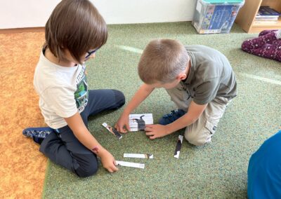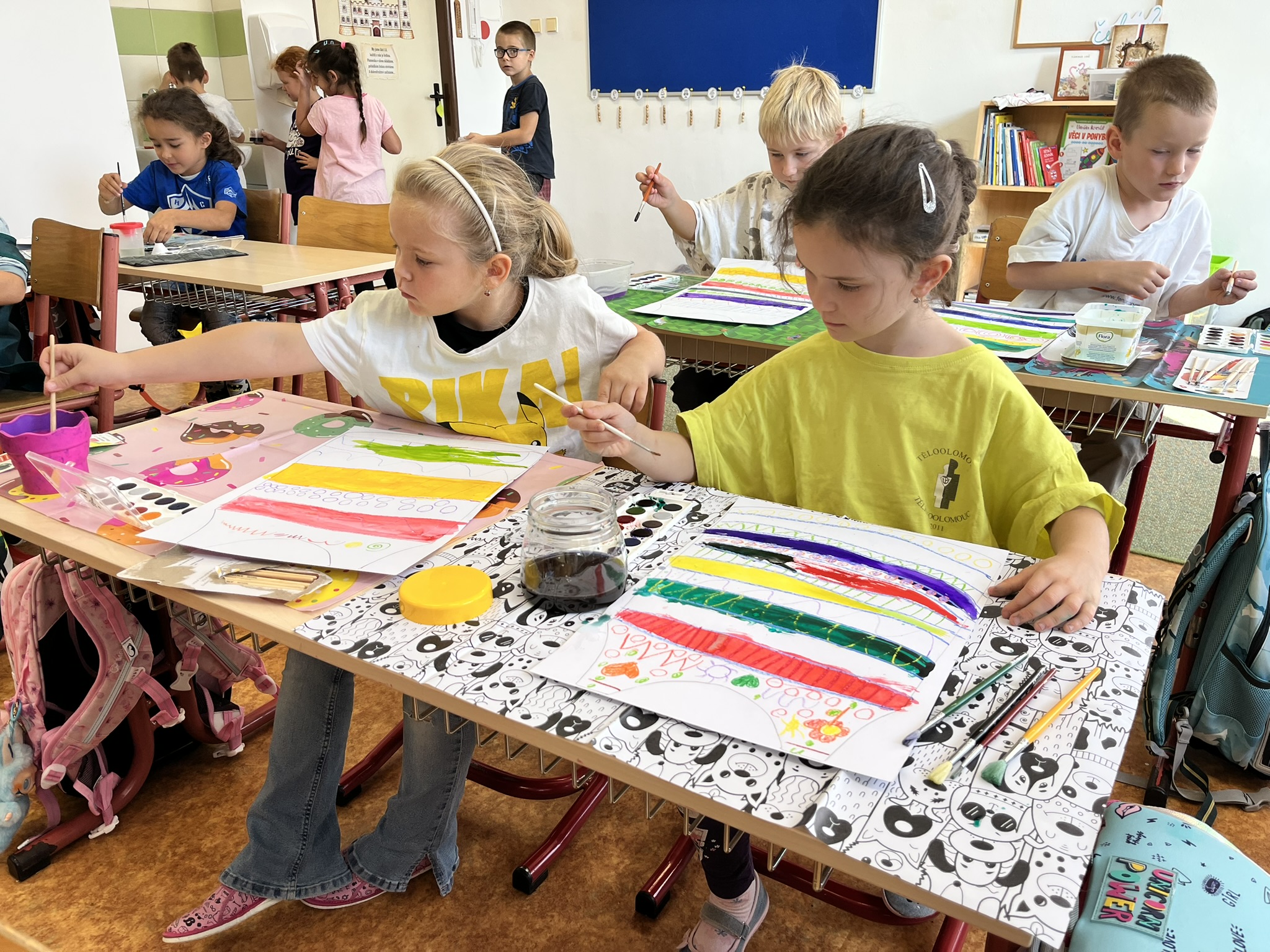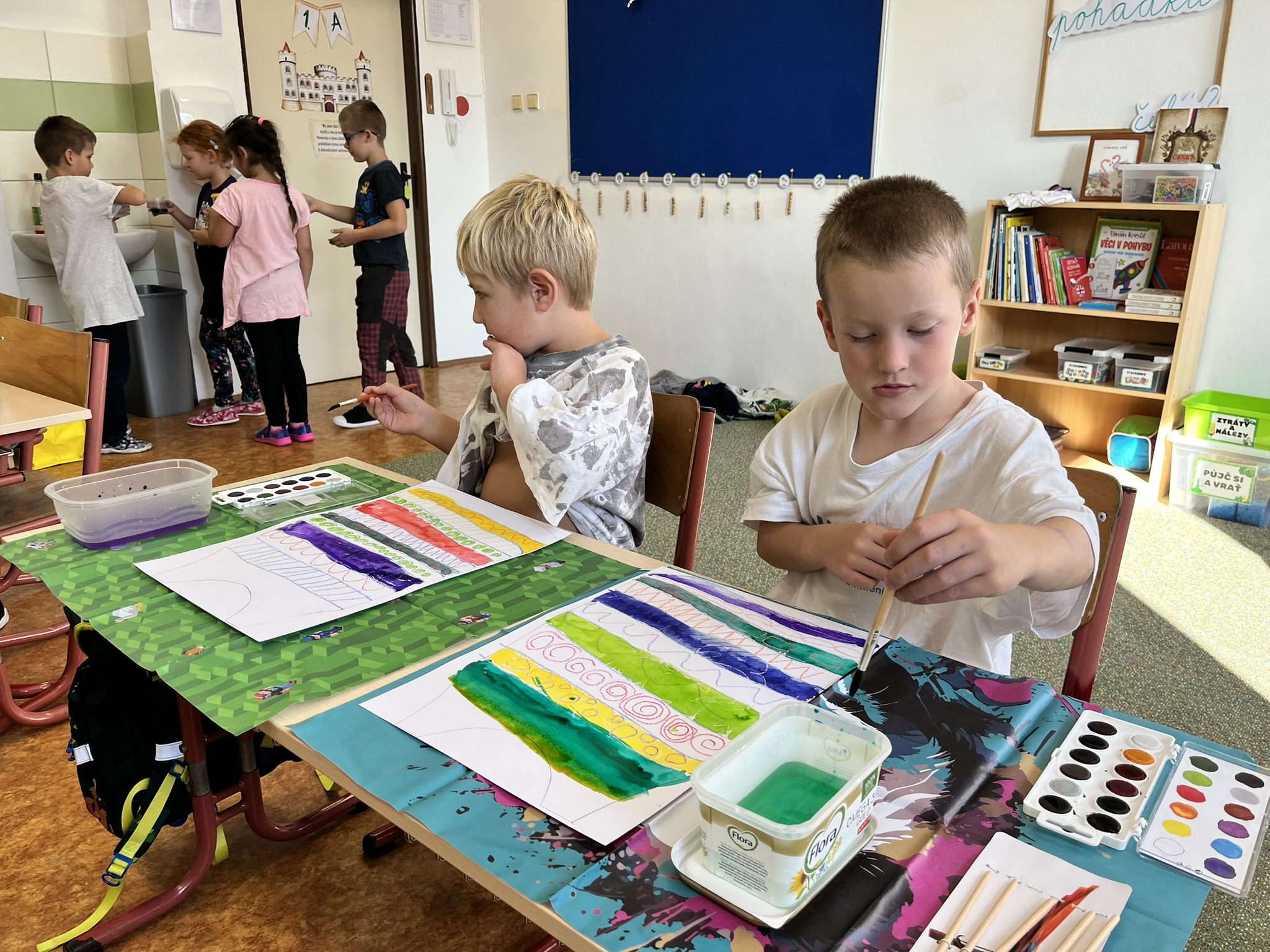 Společně jsme skládali obrázky s čísly, vyhledávali první hlásky na ilustracích z knihy a stavěli domečky podle jejich představ a návrhů. To nás moc bavilo! Paní učitelka nám přečetla příběh o tom, jak si pejsek roztrhl kalhoty a my jsme mu pomohli je znovu zašít. Během výtvarné výchovy jsme pak ozdobili košilku barvami, aby se jí pyšná košilka už nesmála.