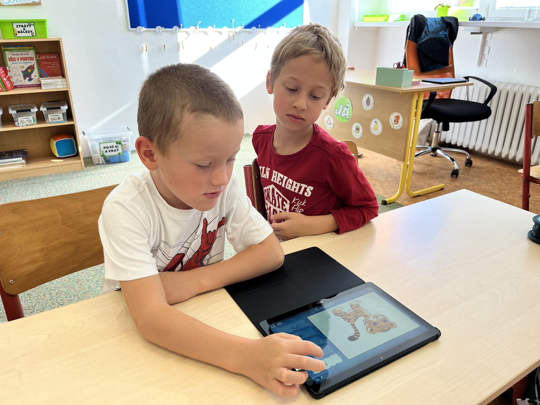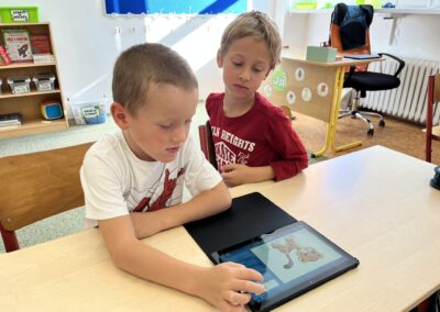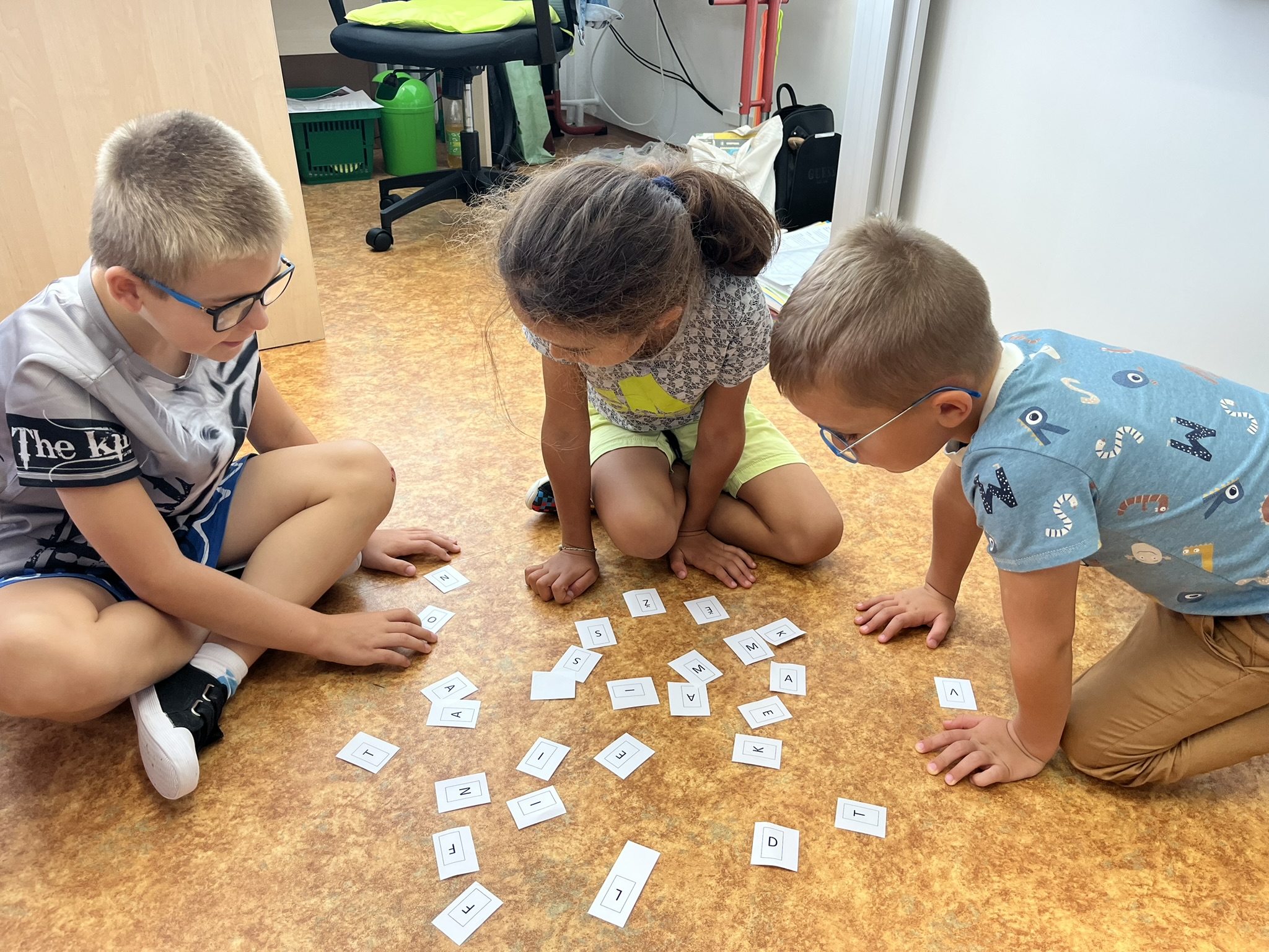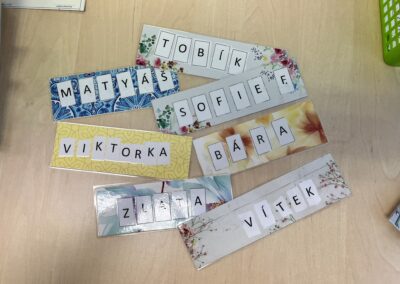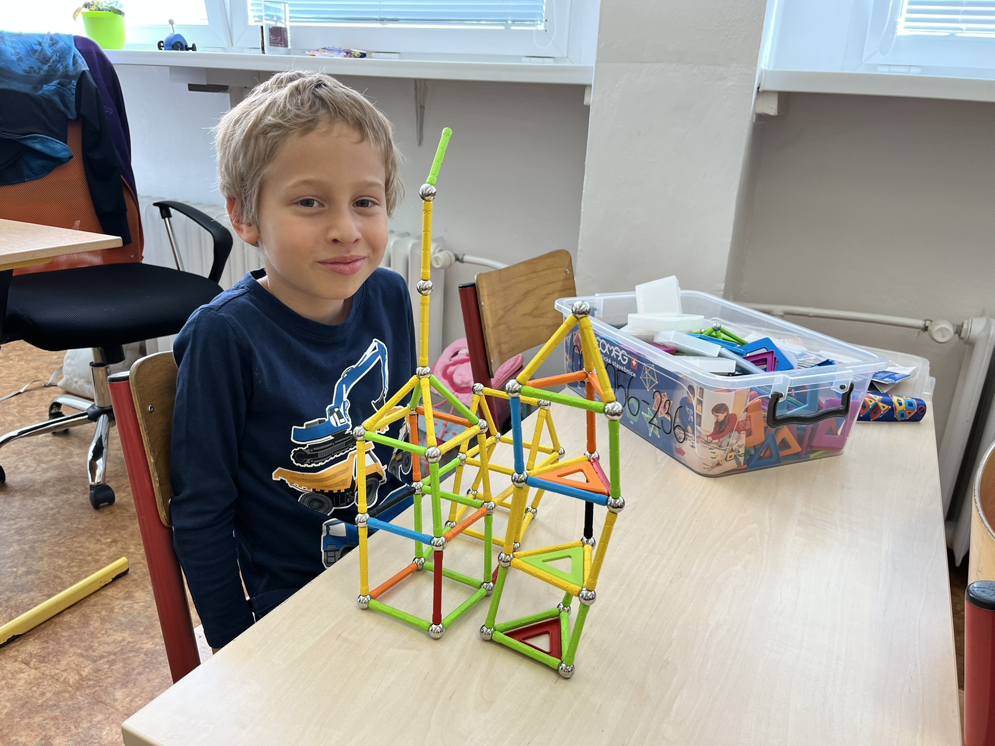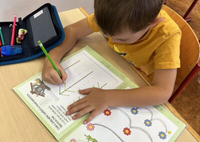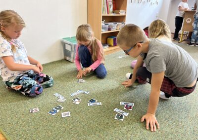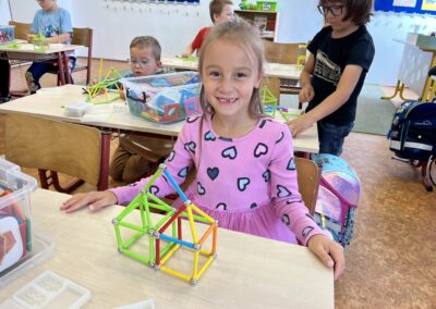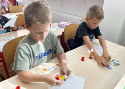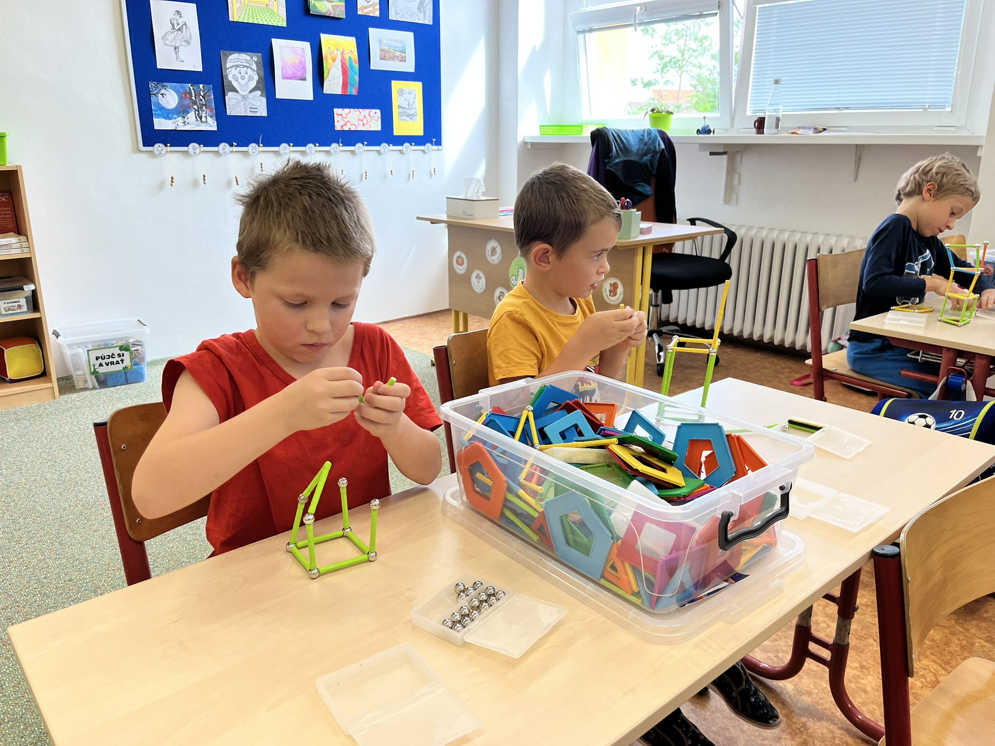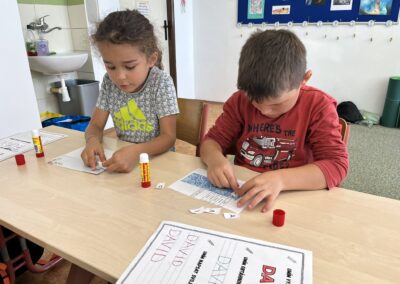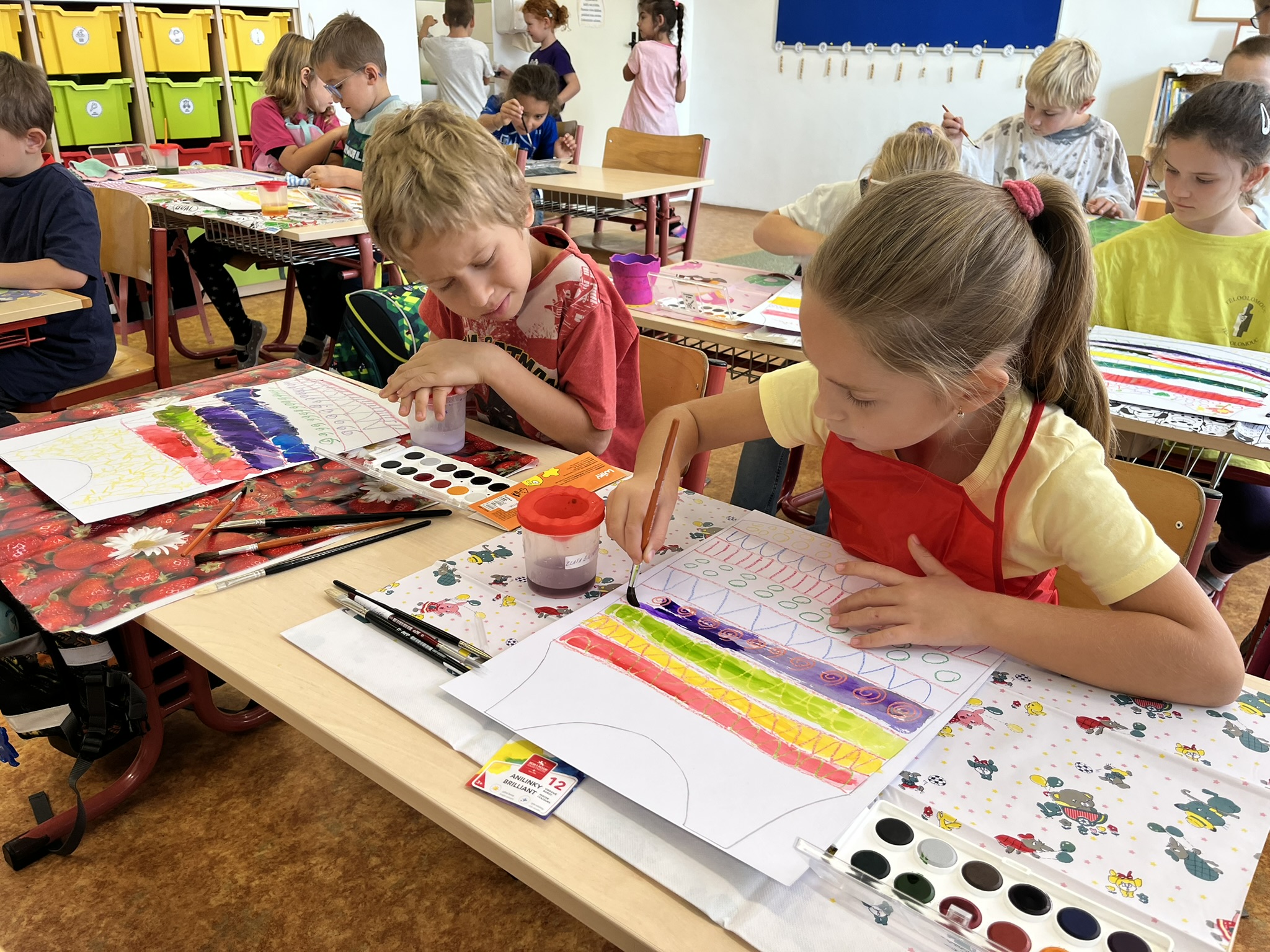 Společně jsme skládali obrázky s čísly, vyhledávali první hlásky na ilustracích z knihy a stavěli domečky podle jejich představ a návrhů. To nás moc bavilo! Paní učitelka nám přečetla příběh o tom, jak si pejsek roztrhl kalhoty a my jsme mu pomohli je znovu zašít. Během výtvarné výchovy jsme pak ozdobili košilku barvami, aby se jí pyšná košilka už nesmála.