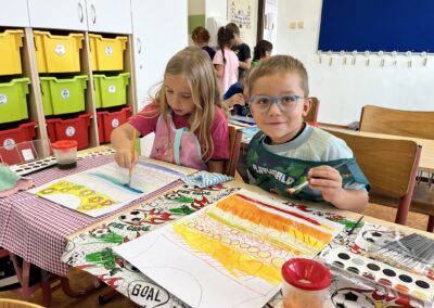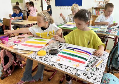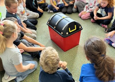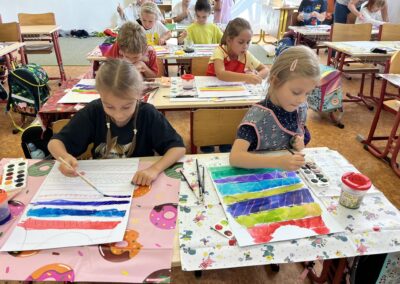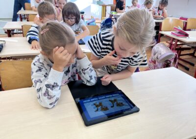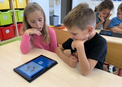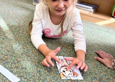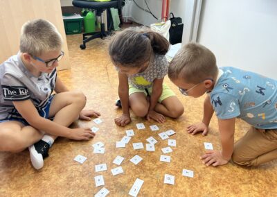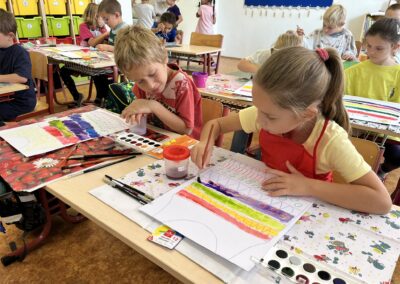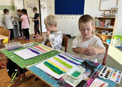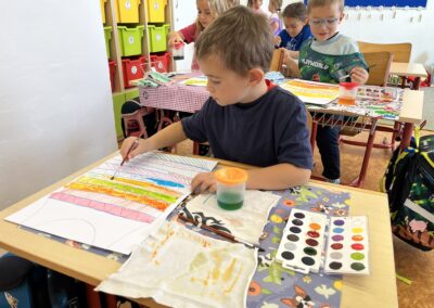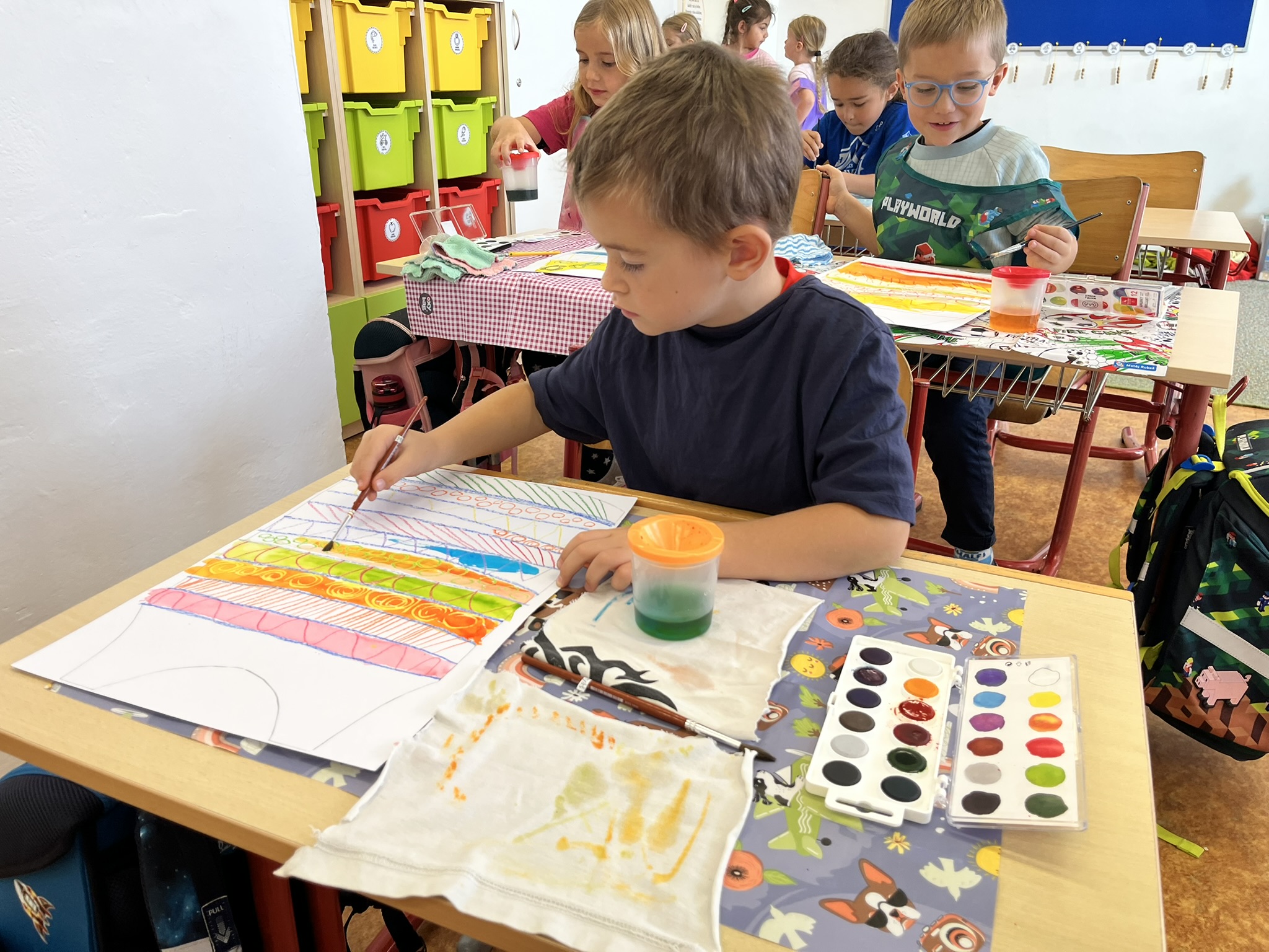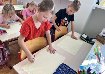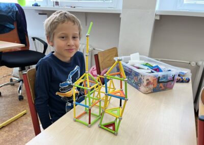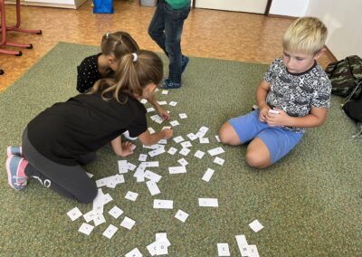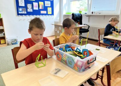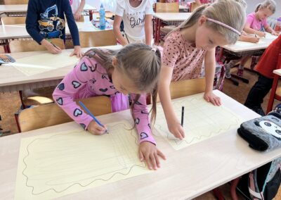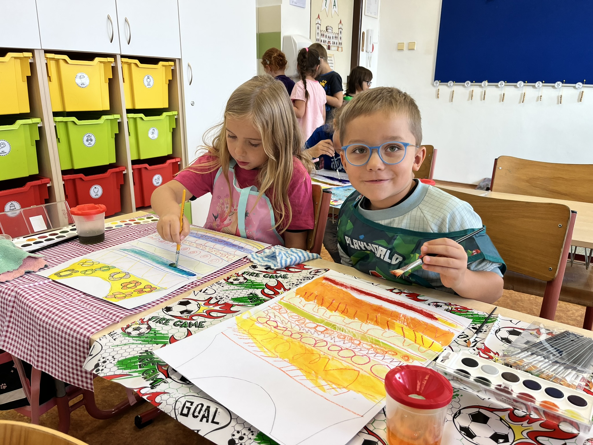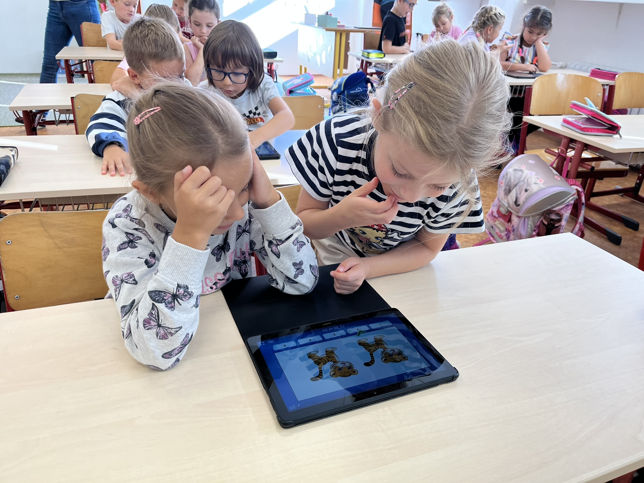 Společně jsme skládali obrázky s čísly, vyhledávali první hlásky na ilustracích z knihy a stavěli domečky podle jejich představ a návrhů. To nás moc bavilo! Paní učitelka nám přečetla příběh o tom, jak si pejsek roztrhl kalhoty a my jsme mu pomohli je znovu zašít. Během výtvarné výchovy jsme pak ozdobili košilku barvami, aby se jí pyšná košilka už nesmála.