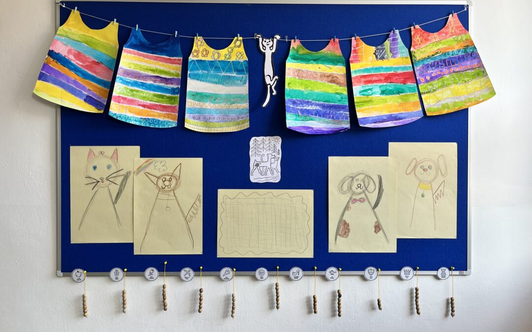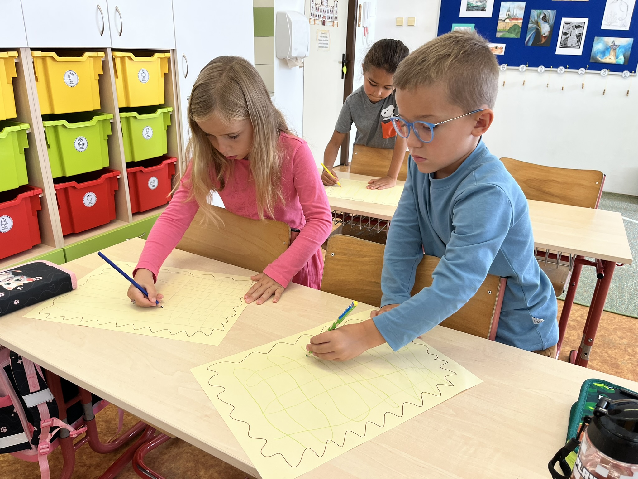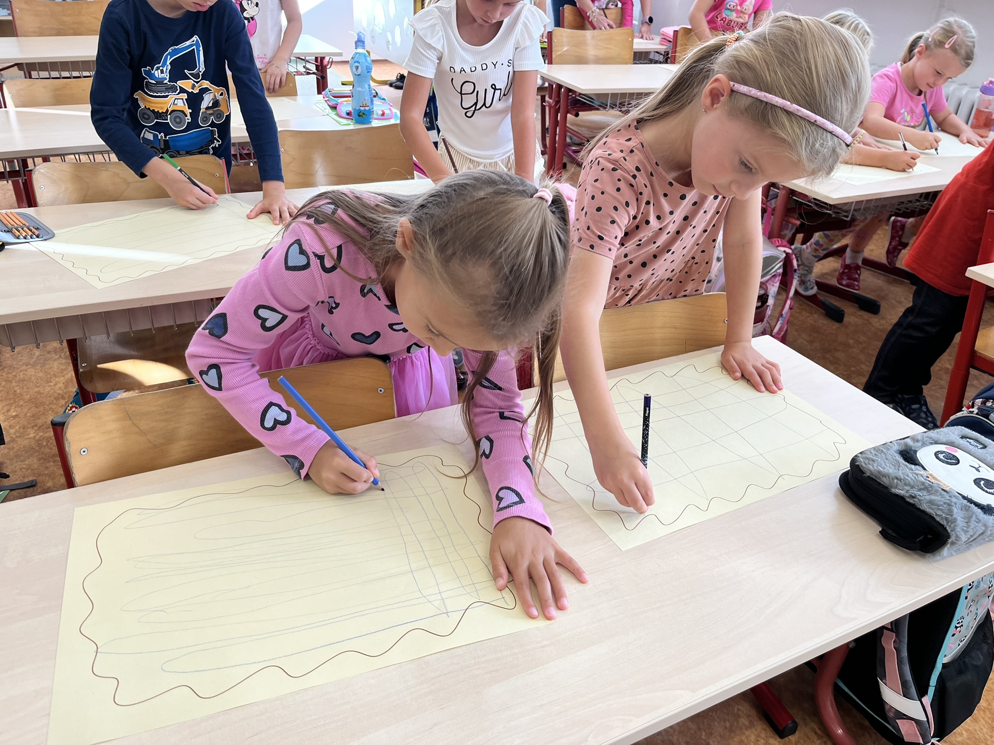 V rámci třídního projektu nás navštívili z pohádkové říše pejsek a kočička. Nejprve jsme se jim představili a naučili se psát svá jména. Potom jsme při uvolňovacích cvicích zkusili nakreslit jejich portrét.
