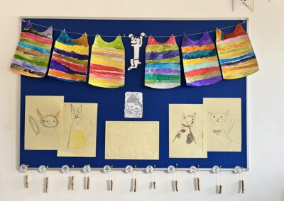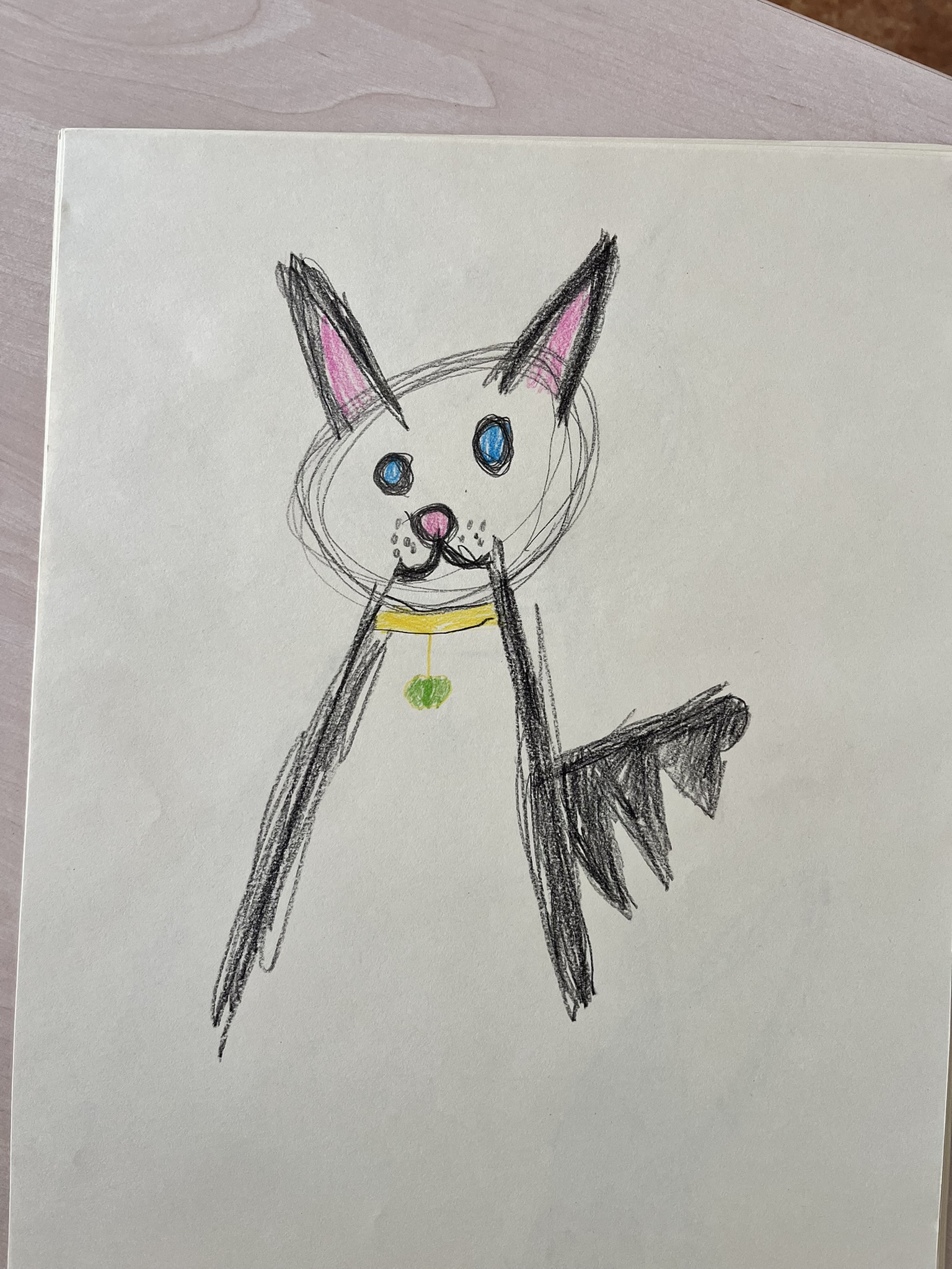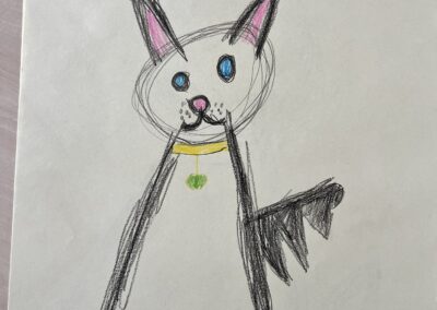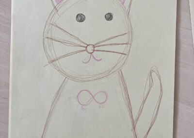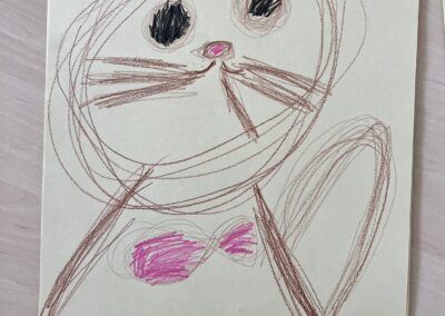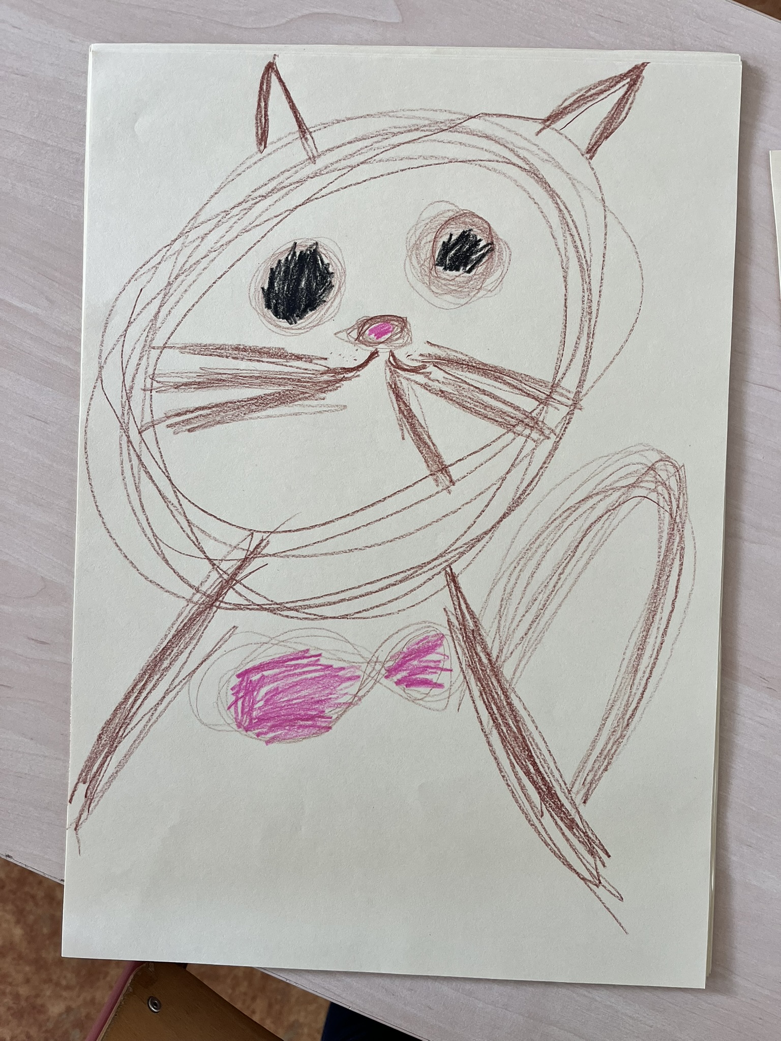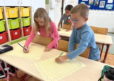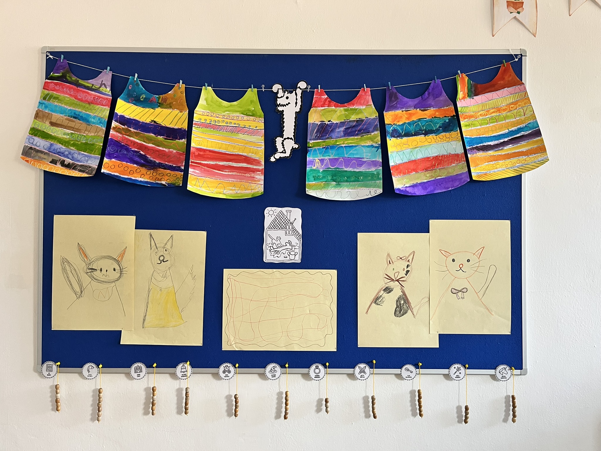 V rámci třídního projektu nás navštívili z pohádkové říše pejsek a kočička. Nejprve jsme se jim představili a naučili se psát svá jména. Potom jsme při uvolňovacích cvicích zkusili nakreslit jejich portrét.
