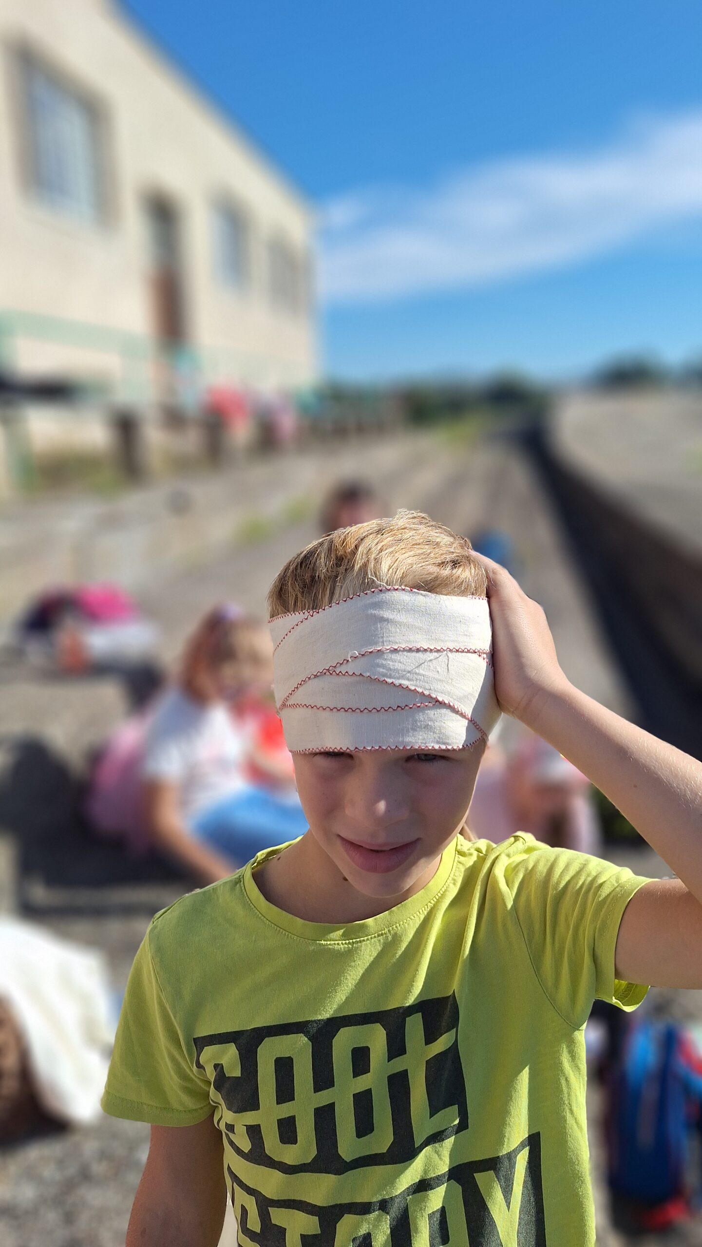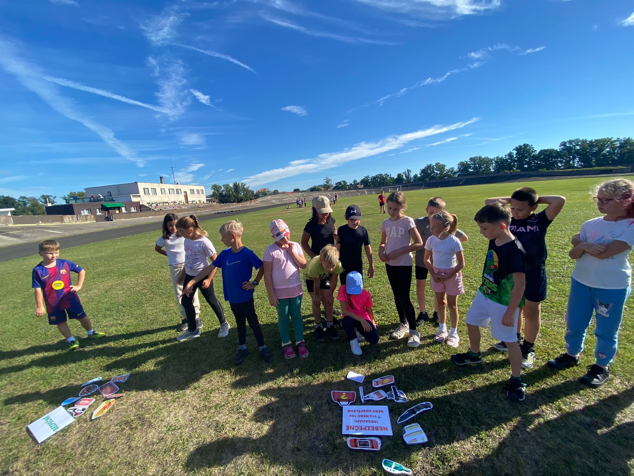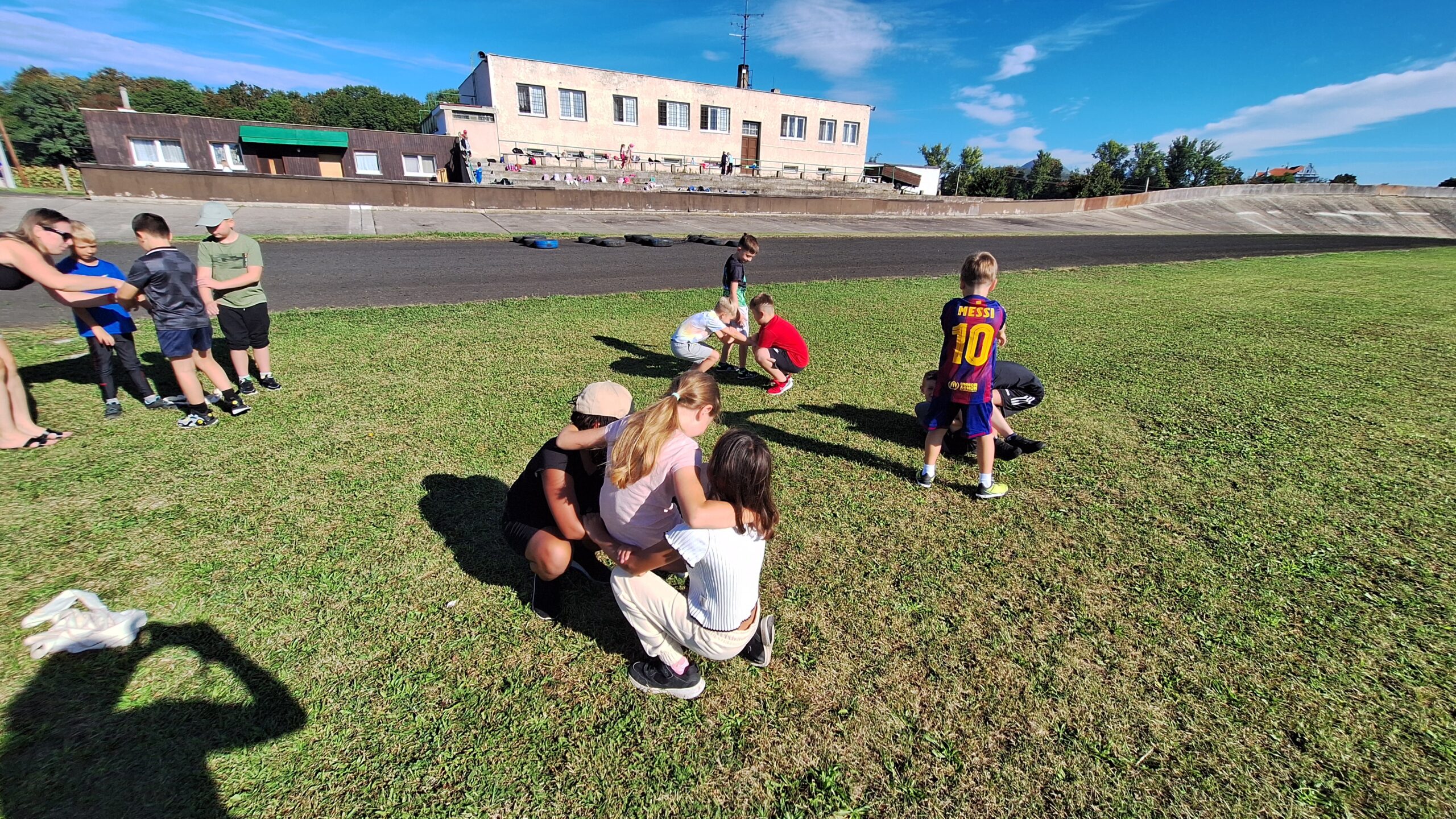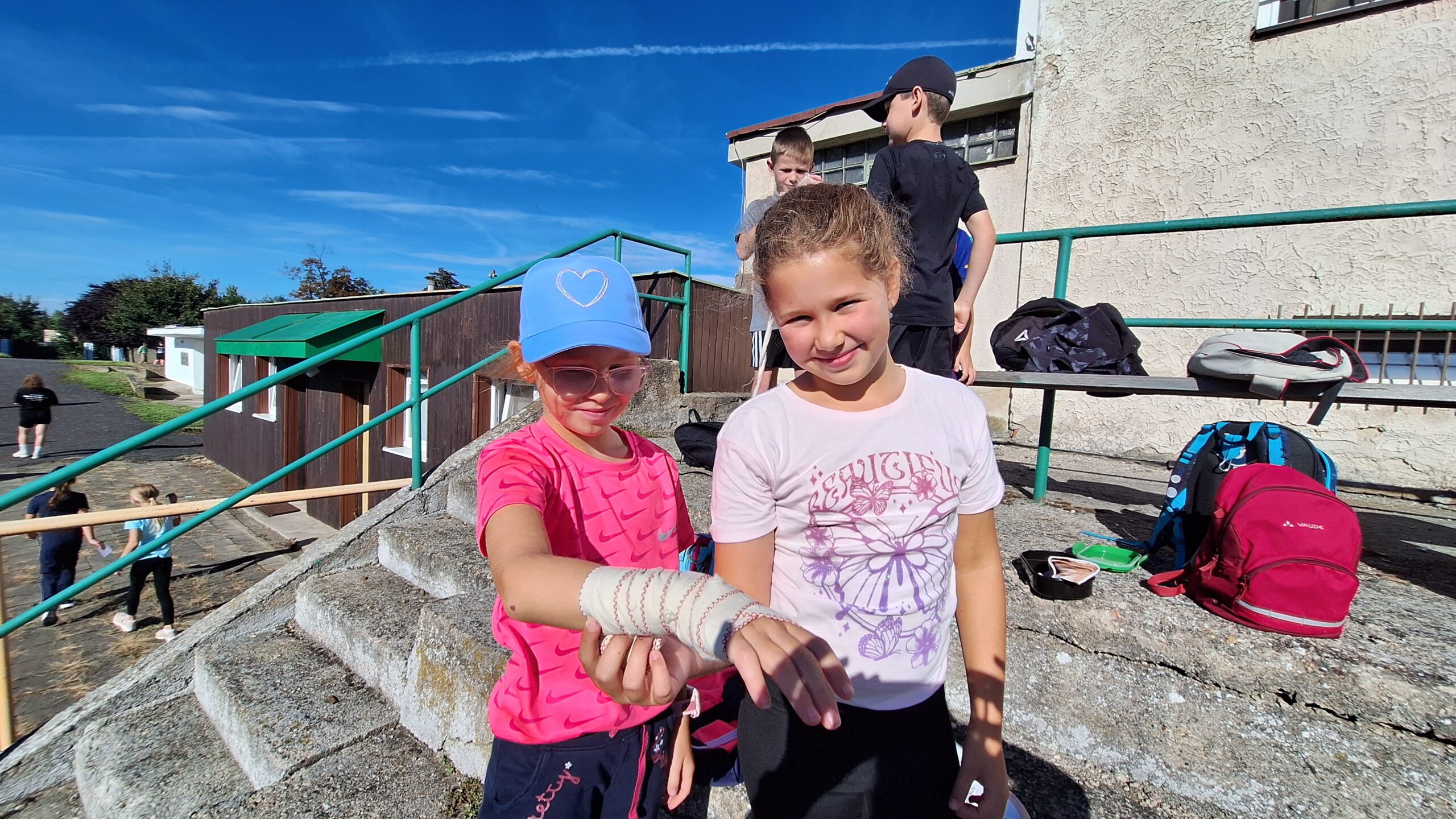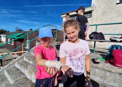 Poté jsme se společně přesunuli na Velodrom v Lounech, kde na ně čekala řada stanovišť s praktickými úkoly. Děti si vyzkoušely, jak správně obvázat a přenést zraněného, zopakovaly si zásady první pomoci a připomněly důležitá telefonní čísla tísňových linek. Další aktivitou bylo také poznávání a třídění různých druhů odpadu.