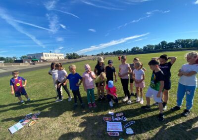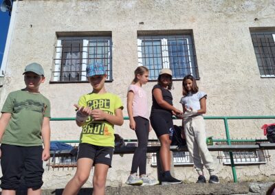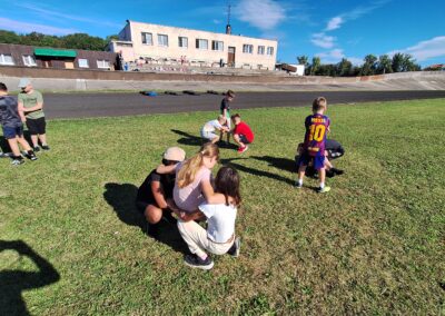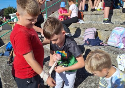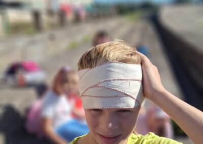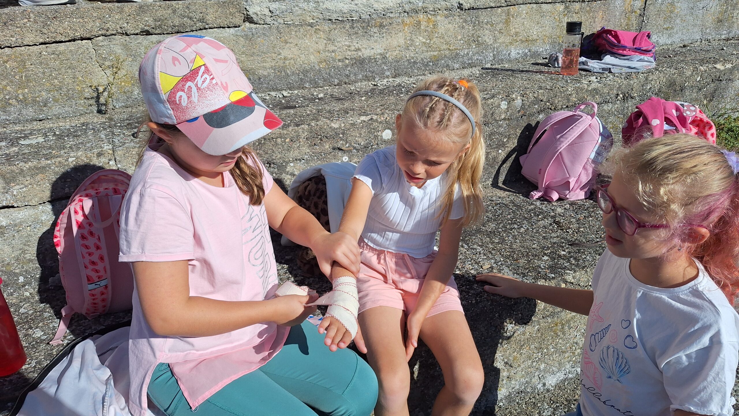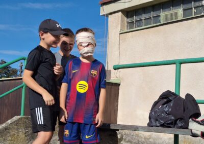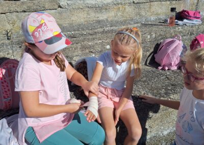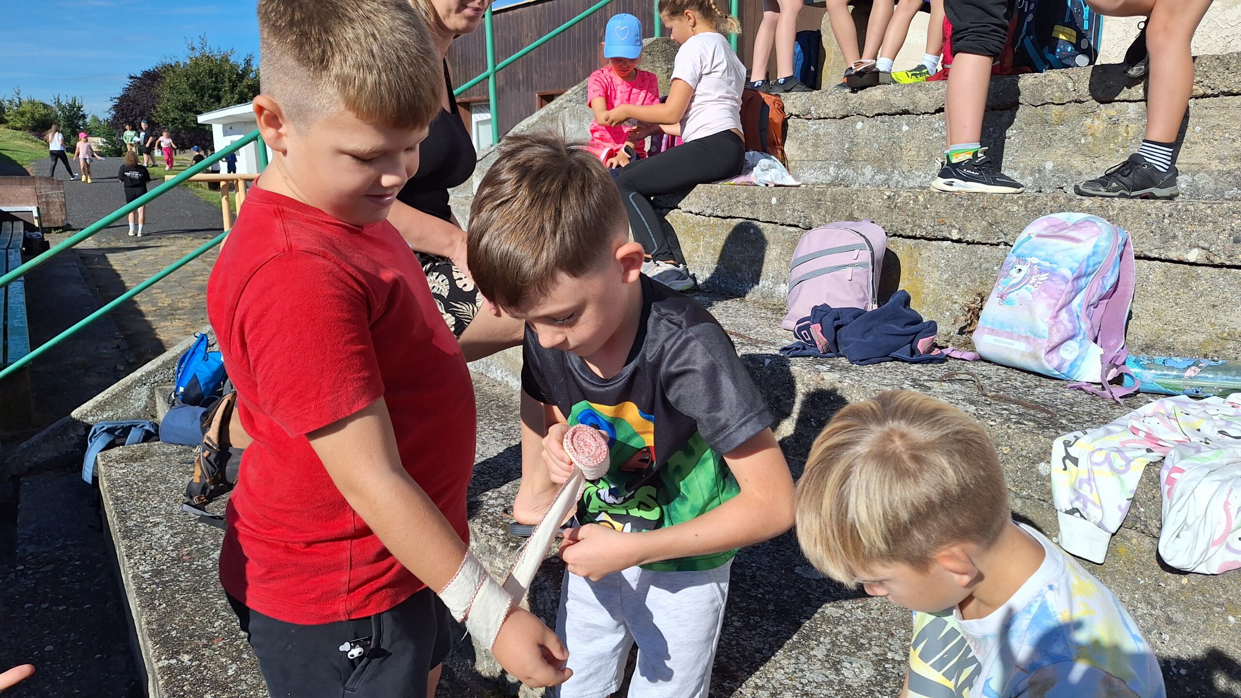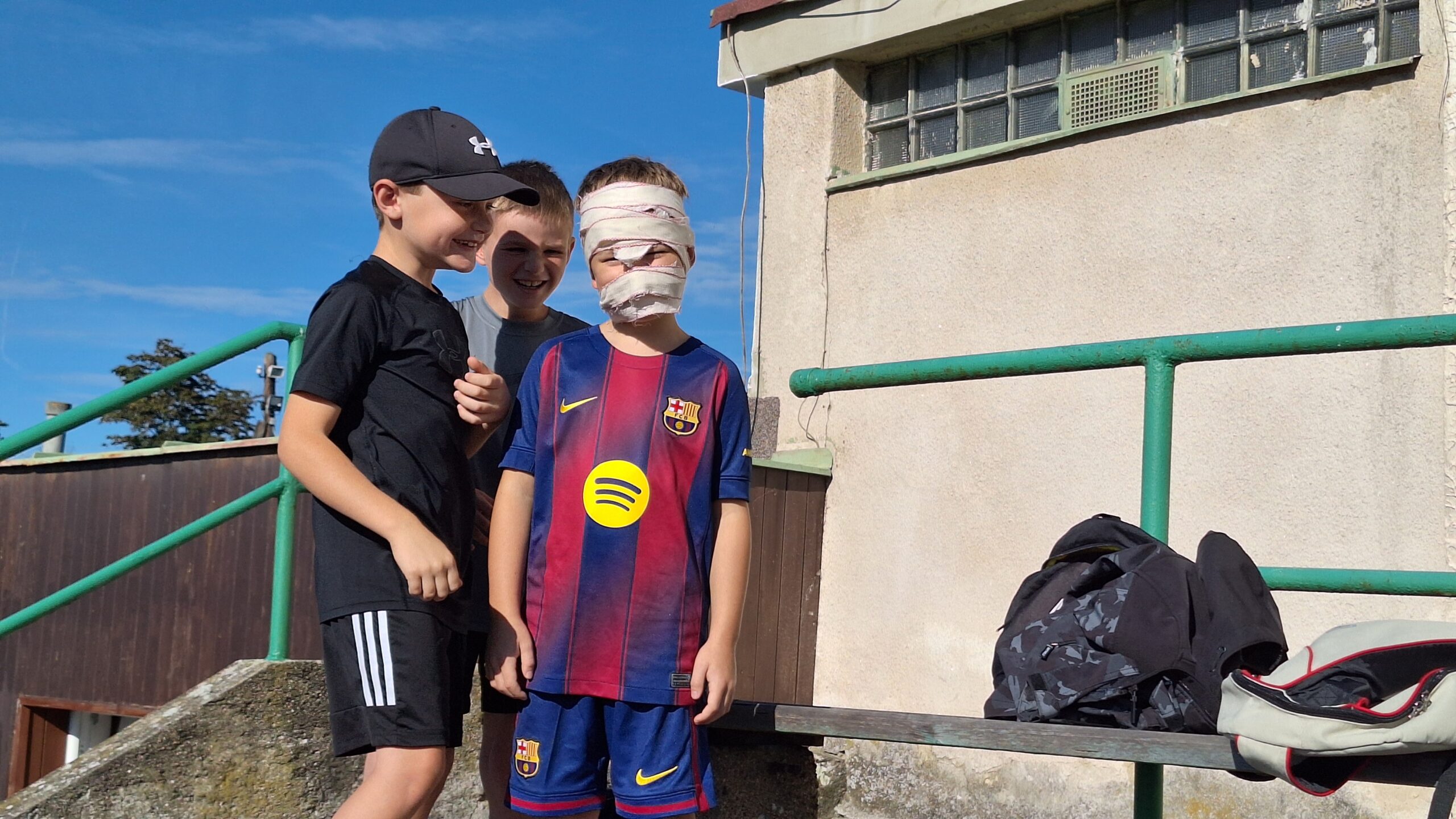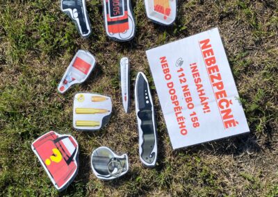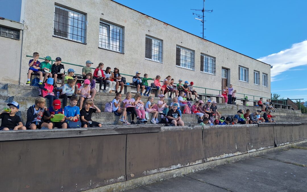 Poté jsme se společně přesunuli na Velodrom v Lounech, kde na ně čekala řada stanovišť s praktickými úkoly. Děti si vyzkoušely, jak správně obvázat a přenést zraněného, zopakovaly si zásady první pomoci a připomněly důležitá telefonní čísla tísňových linek. Další aktivitou bylo také poznávání a třídění různých druhů odpadu.