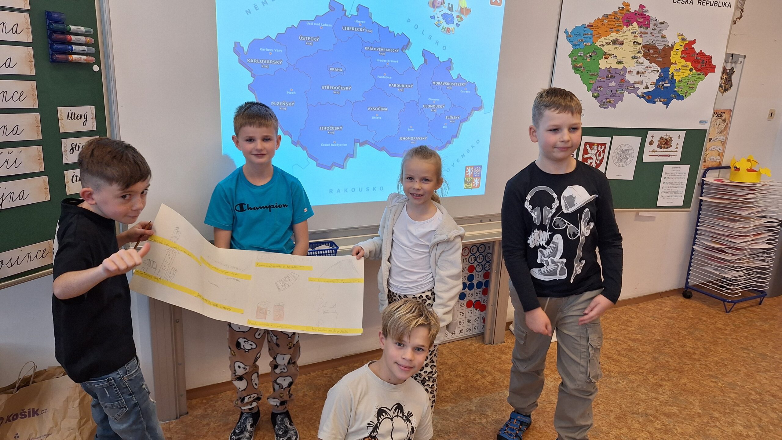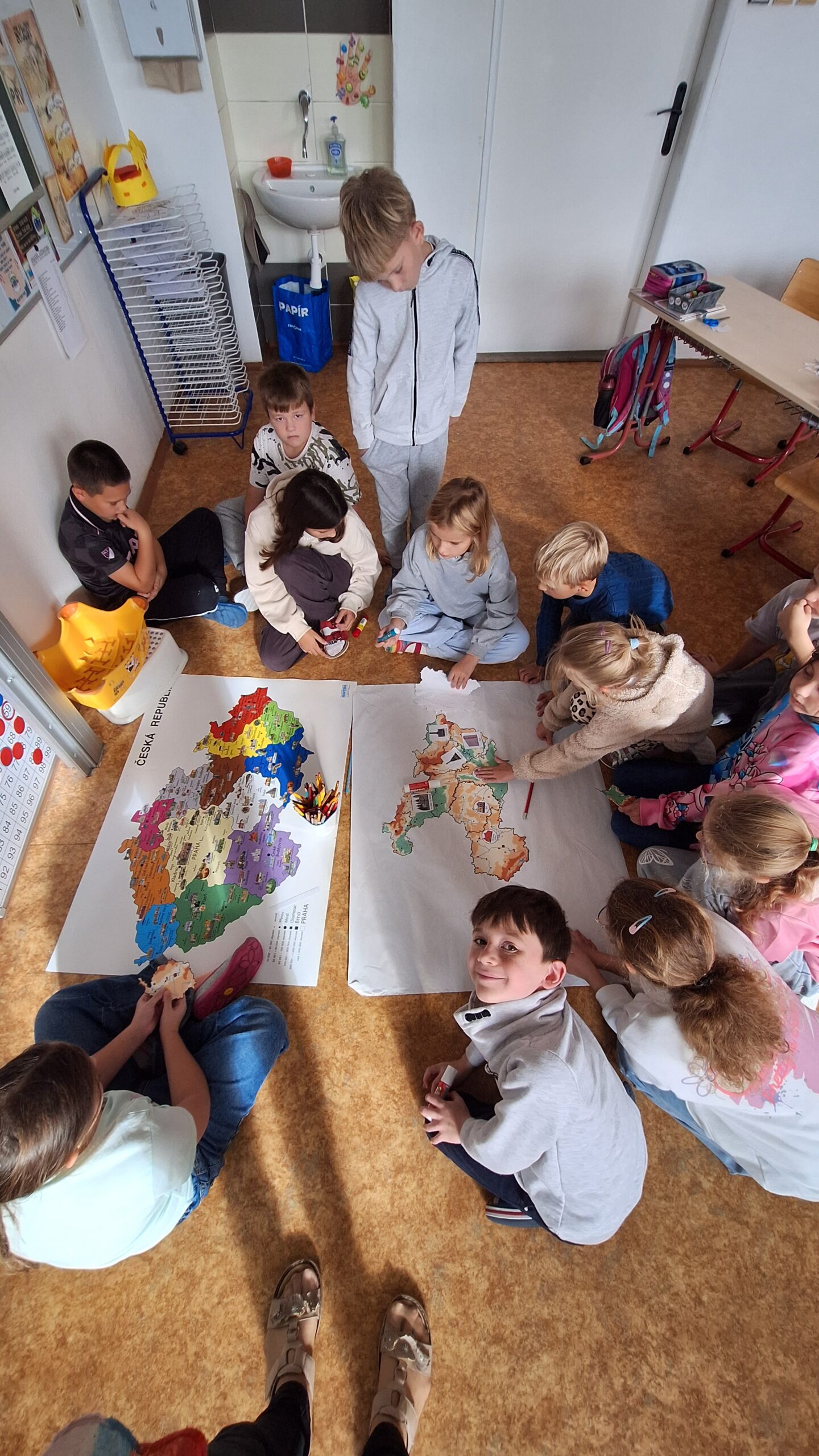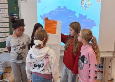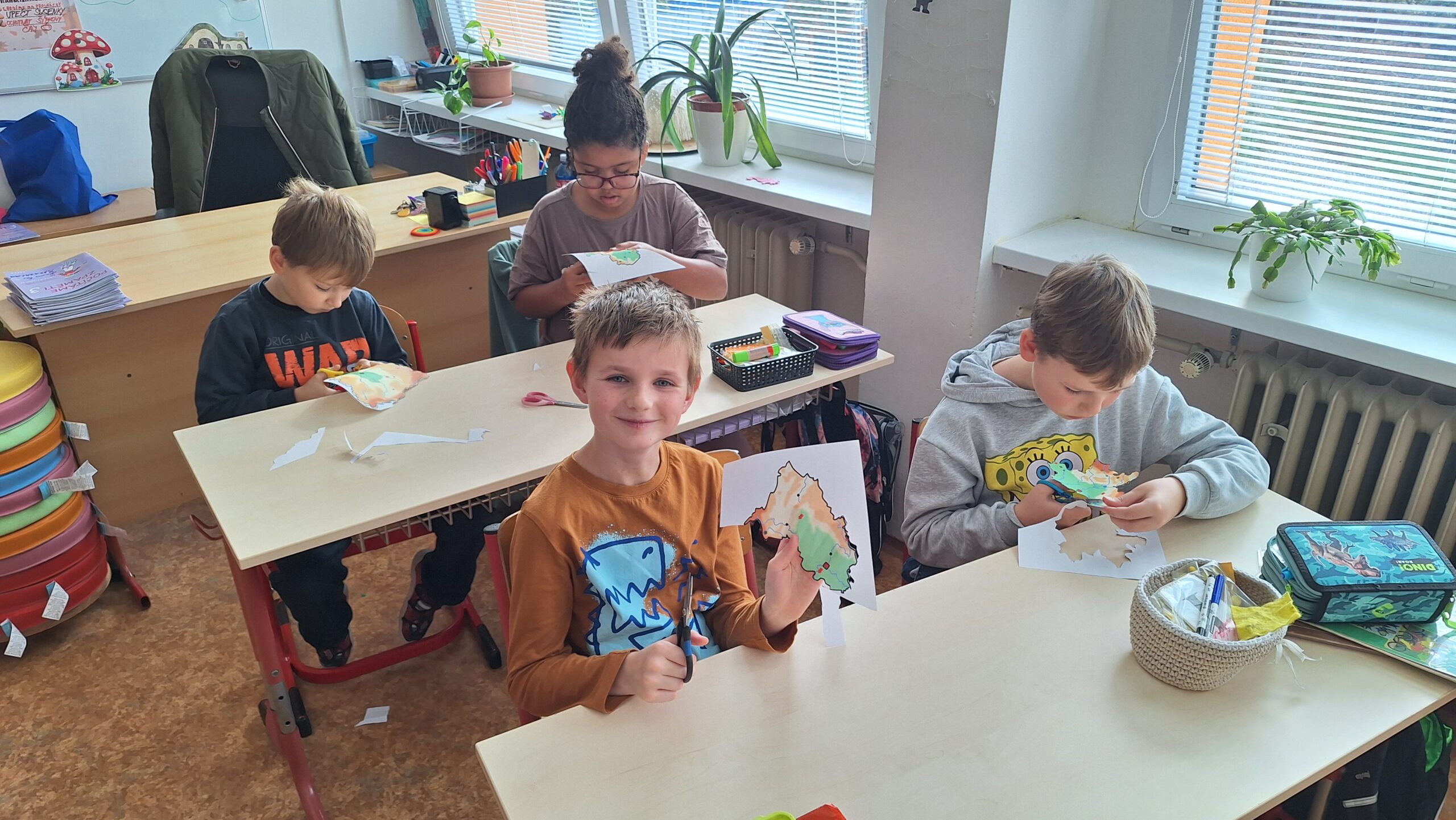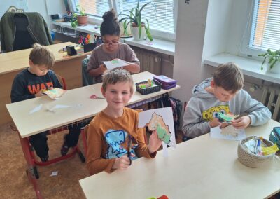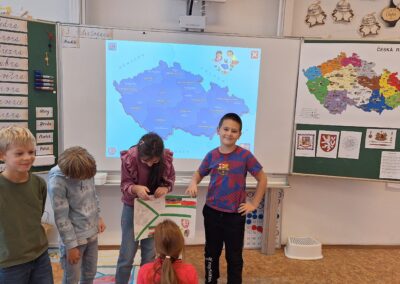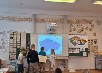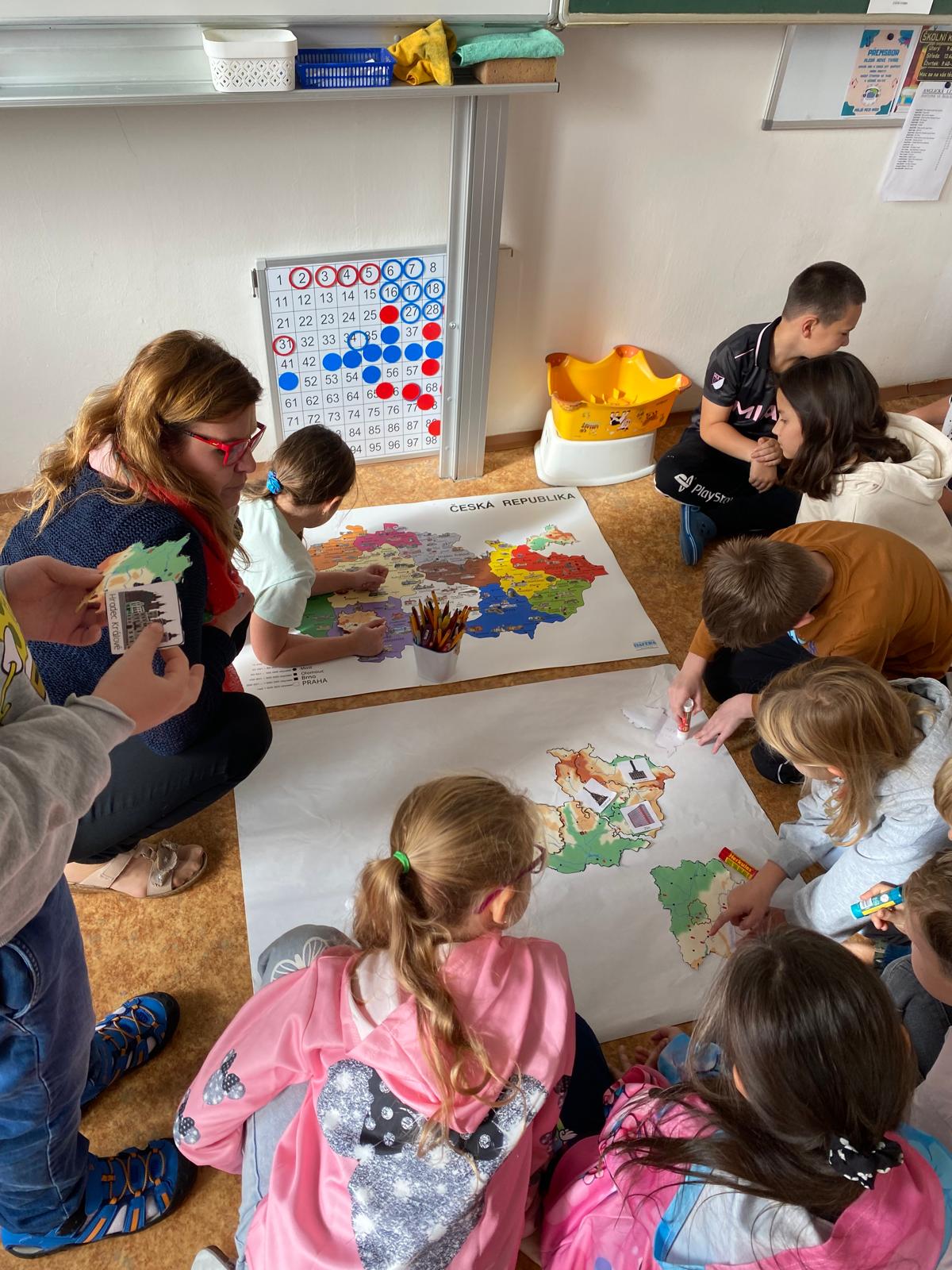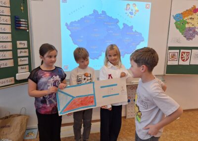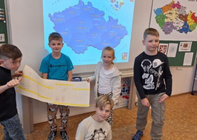 V hodinách prvouky se žáci pustili do skupinové práce zaměřené na poznávání povrchu České republiky. Každá skupina obdržela část mapy jednoho kraje s vyznačeným povrchem. Úkolem dětí bylo samostatně porovnávat tvary, vyhledávat a určit, o který kraj se jedná. Poté svůj kraj popsaly – zaměřily se na zajímavosti, významné body i charakteristické rysy krajiny.