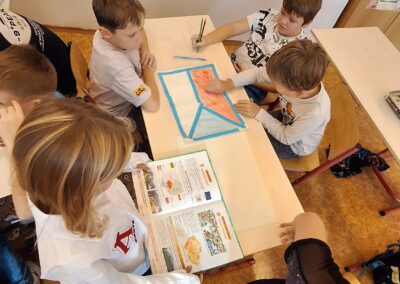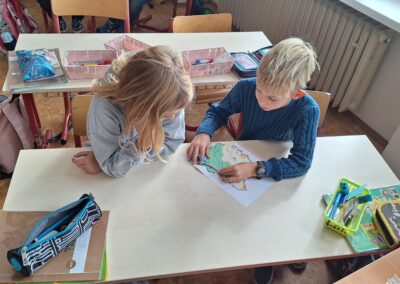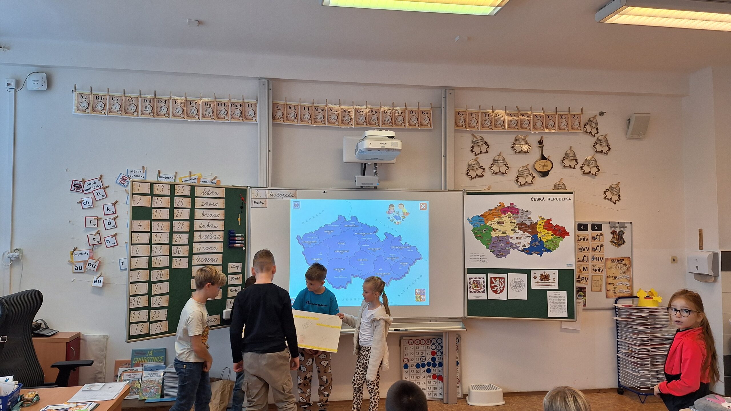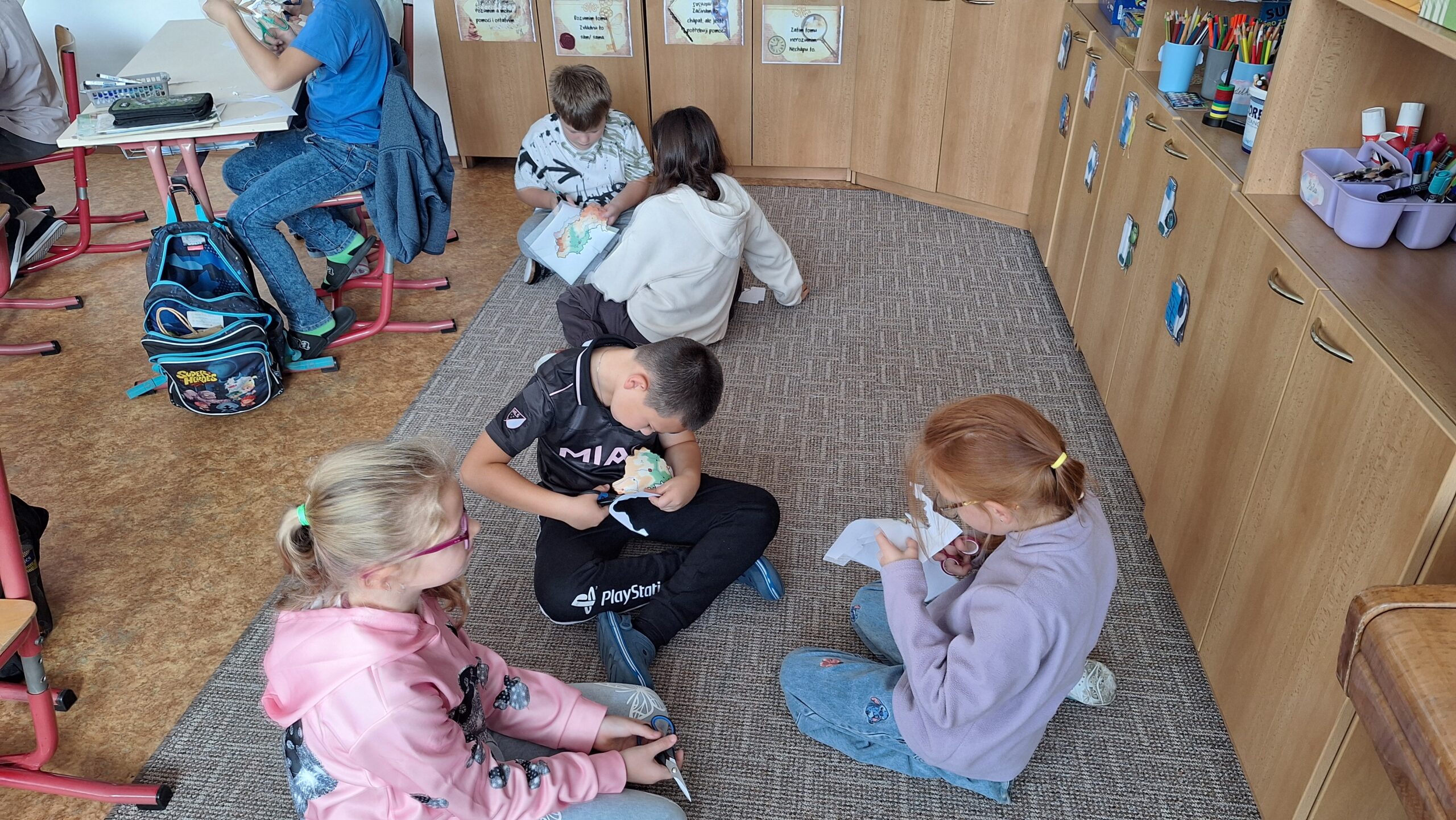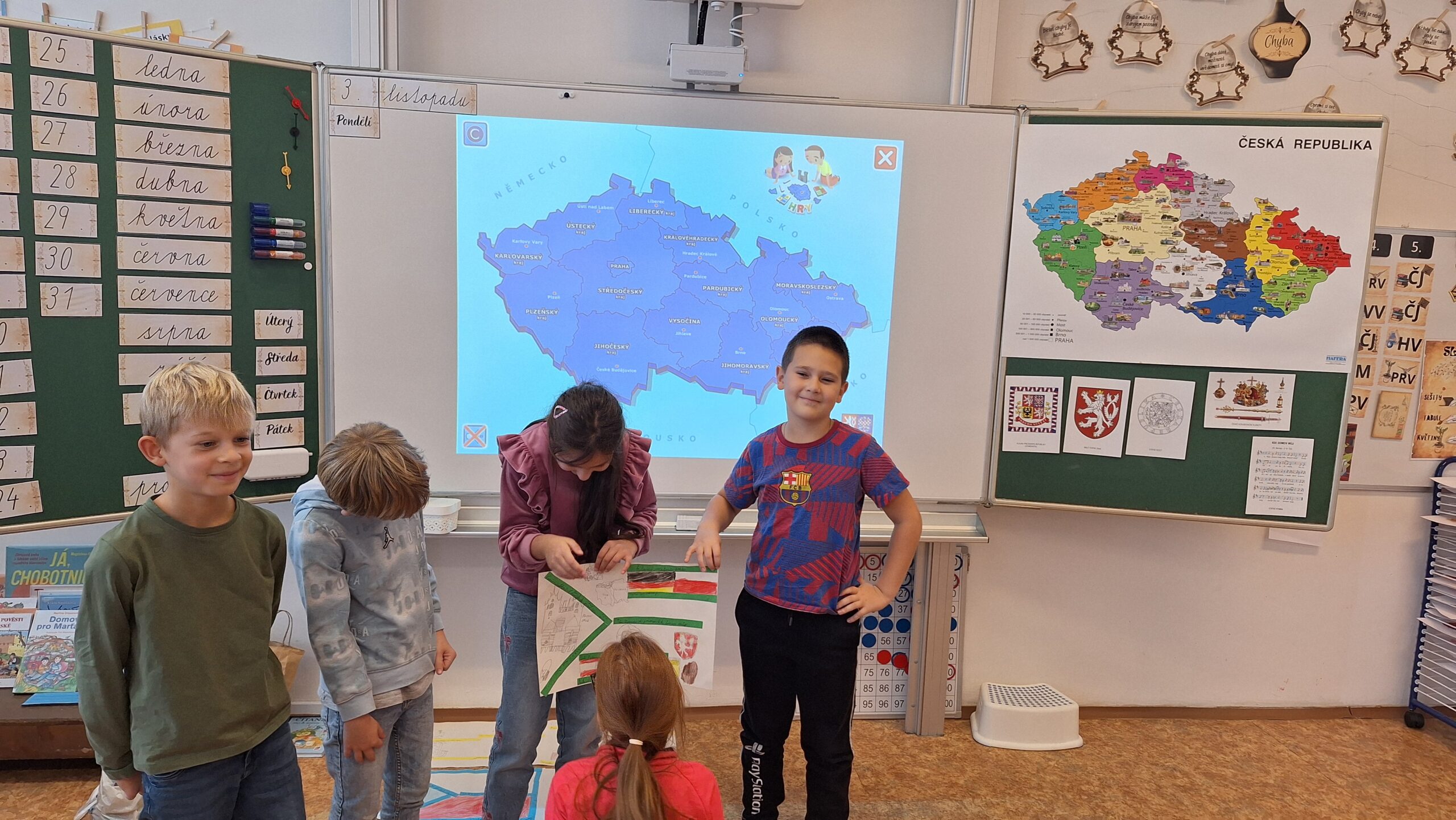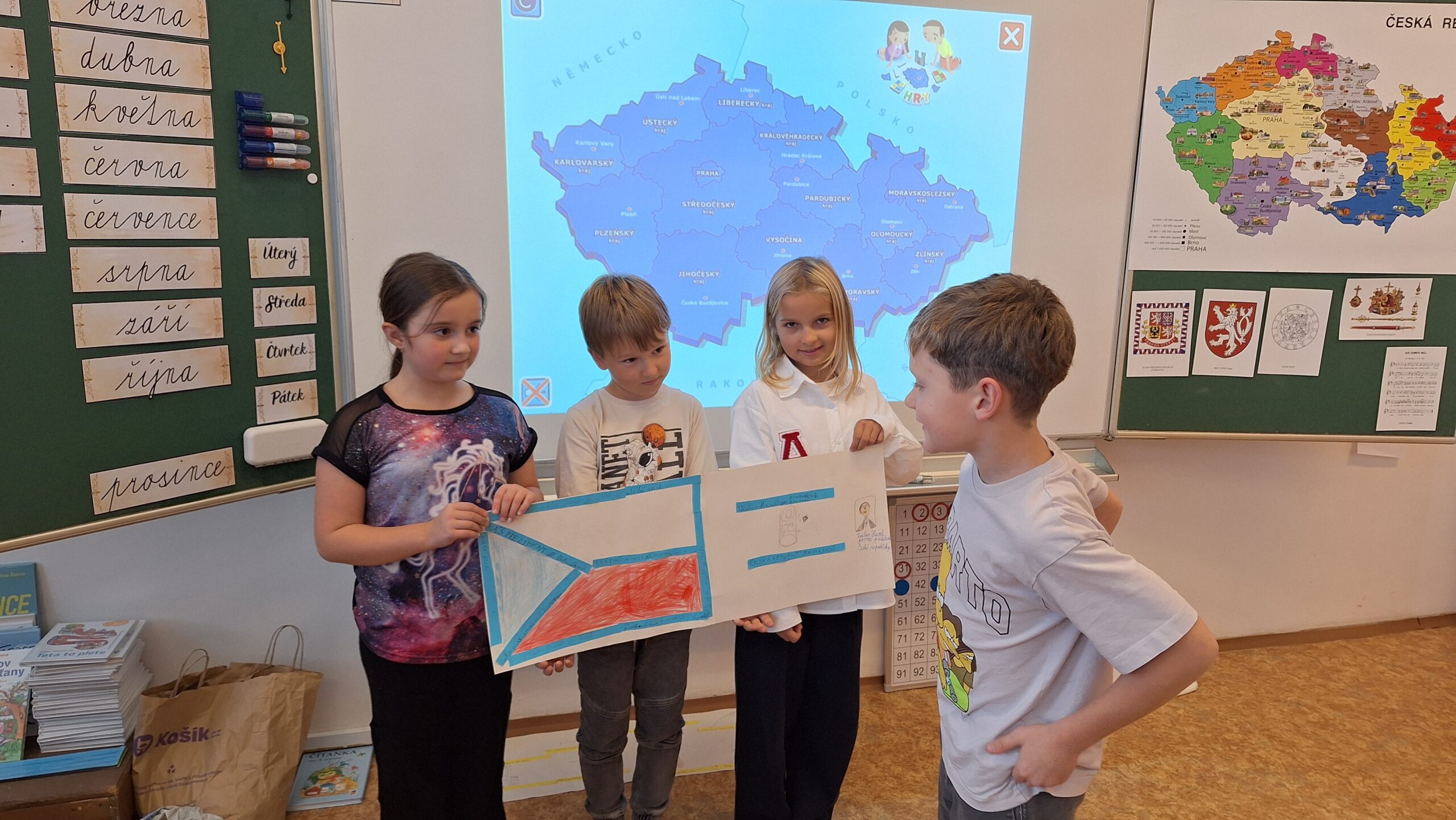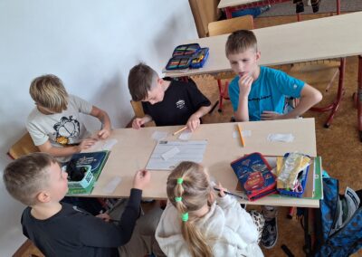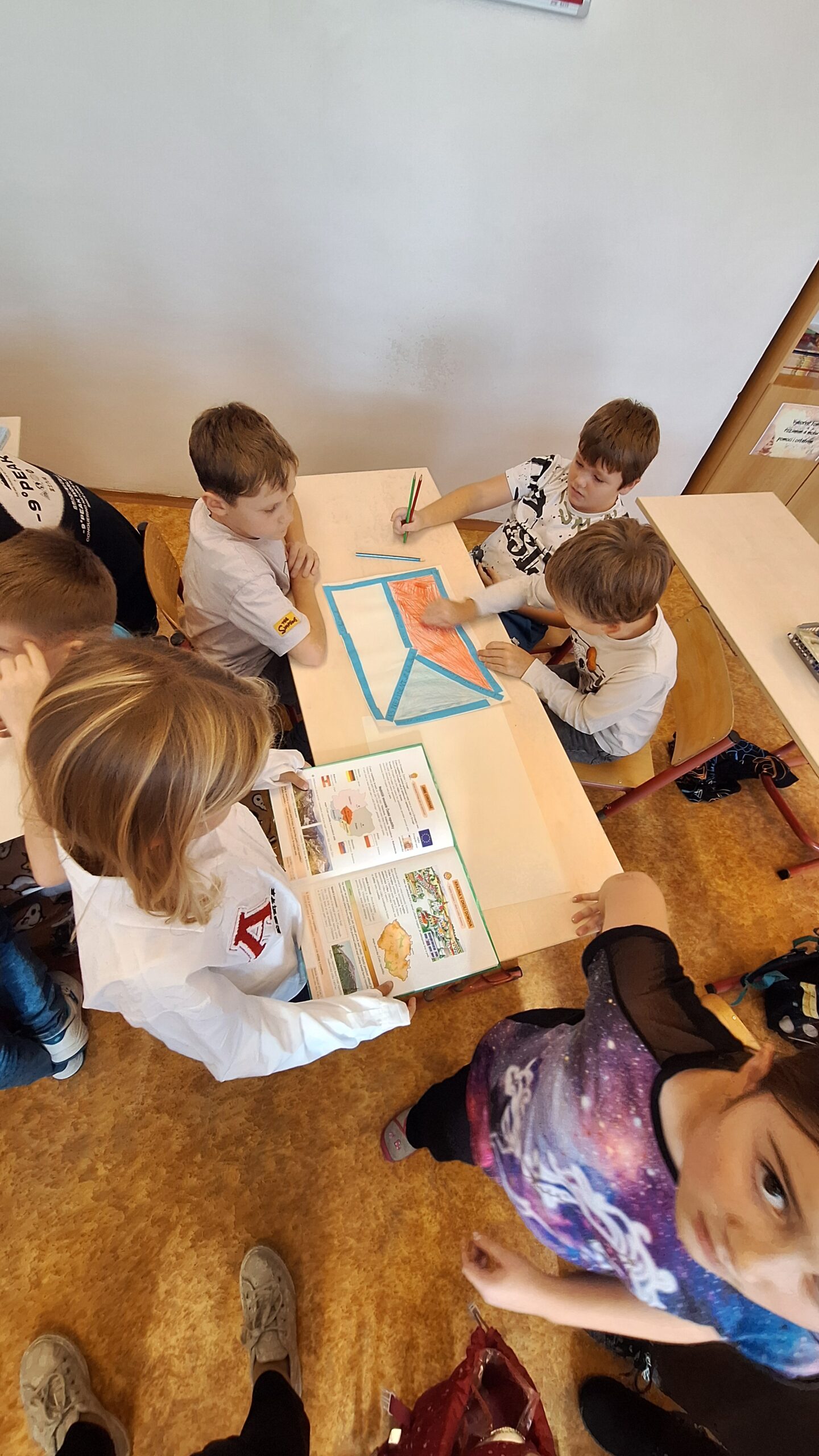 V hodinách prvouky se žáci pustili do skupinové práce zaměřené na poznávání povrchu České republiky. Každá skupina obdržela část mapy jednoho kraje s vyznačeným povrchem. Úkolem dětí bylo samostatně porovnávat tvary, vyhledávat a určit, o který kraj se jedná. Poté svůj kraj popsaly – zaměřily se na zajímavosti, významné body i charakteristické rysy krajiny.