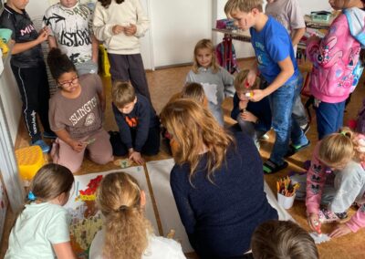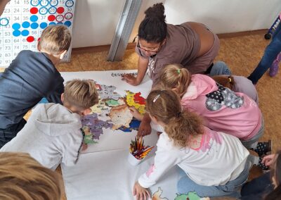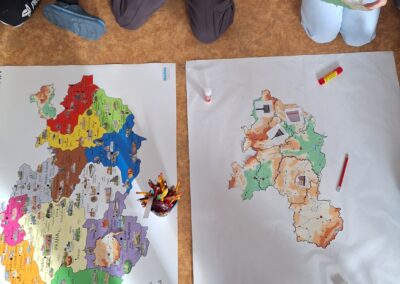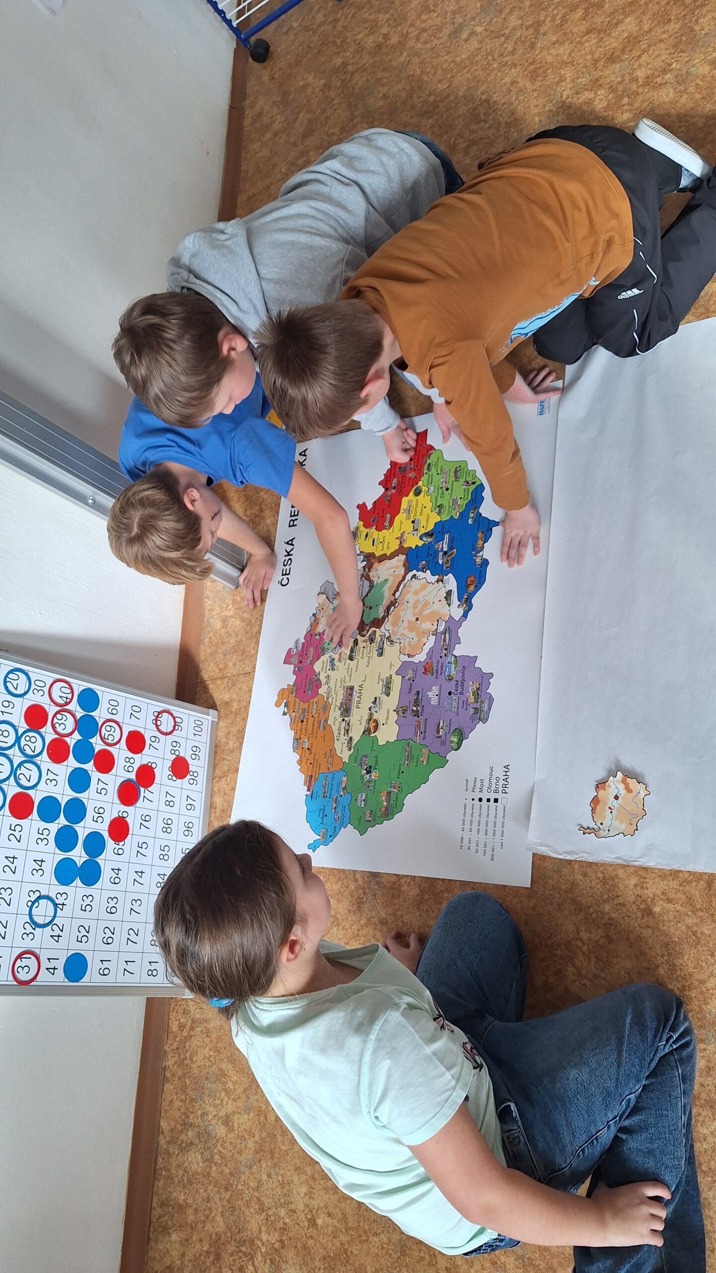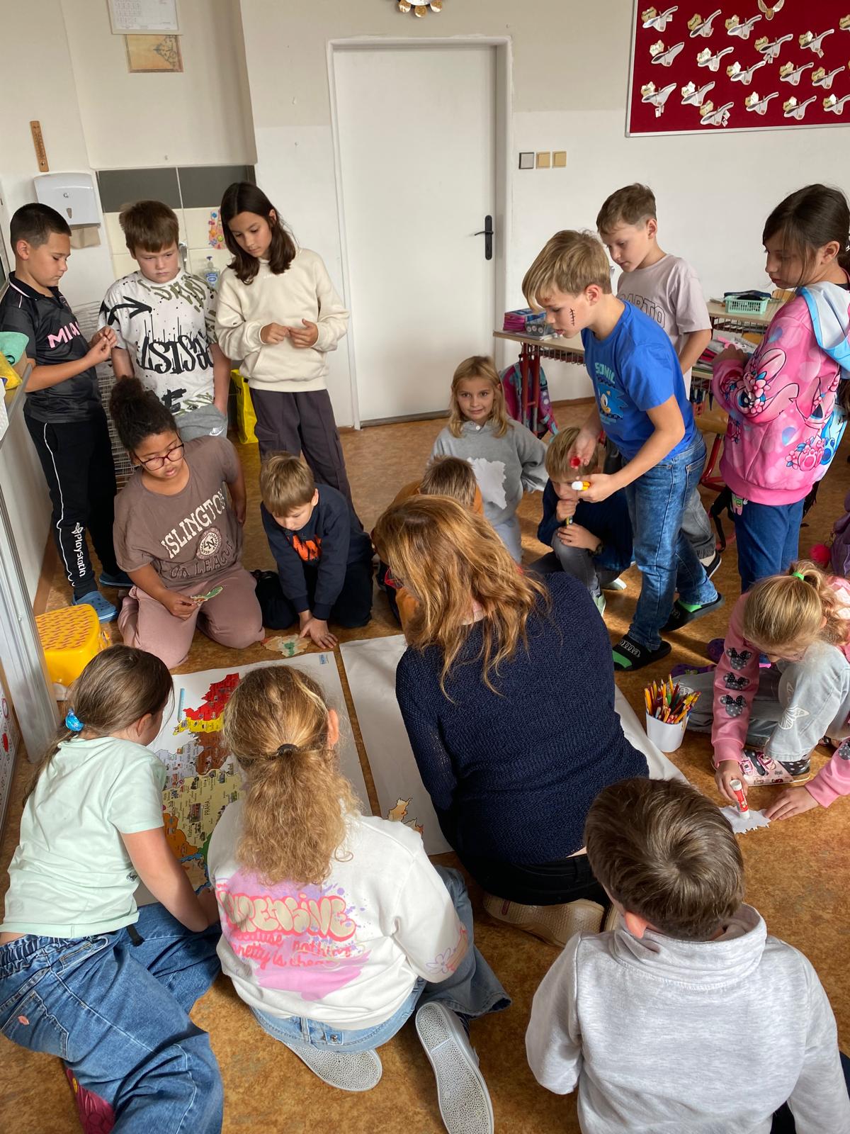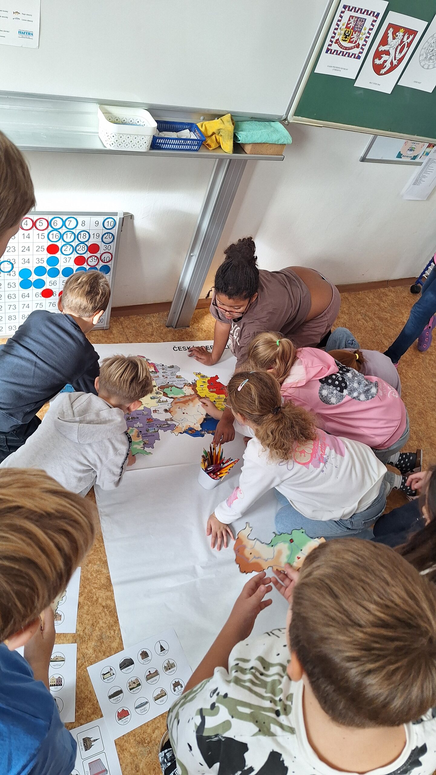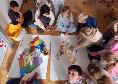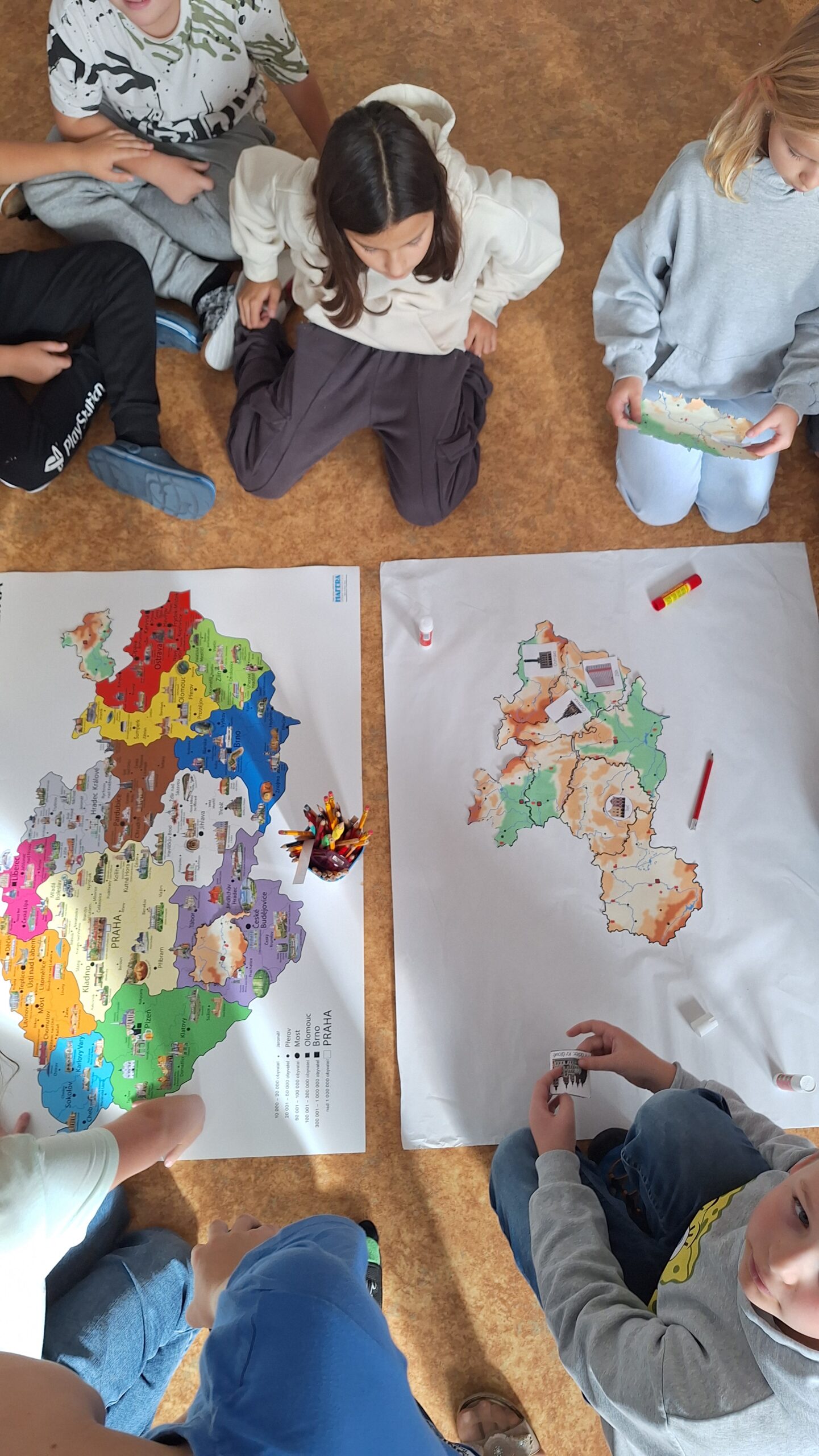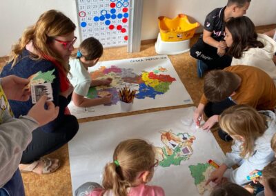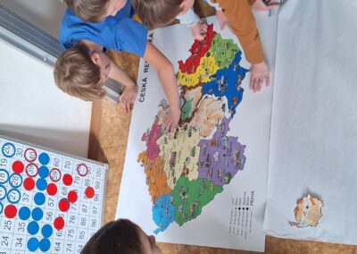 Když měly všechny skupiny hotovo, spojili jsme jednotlivé části dohromady. Děti tak společně sestavily všech 14 krajů České republiky a vytvořily velkou celkovou mapu. Při práci si procvičily spolupráci, orientaci v mapě i logické myšlení.