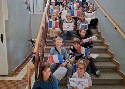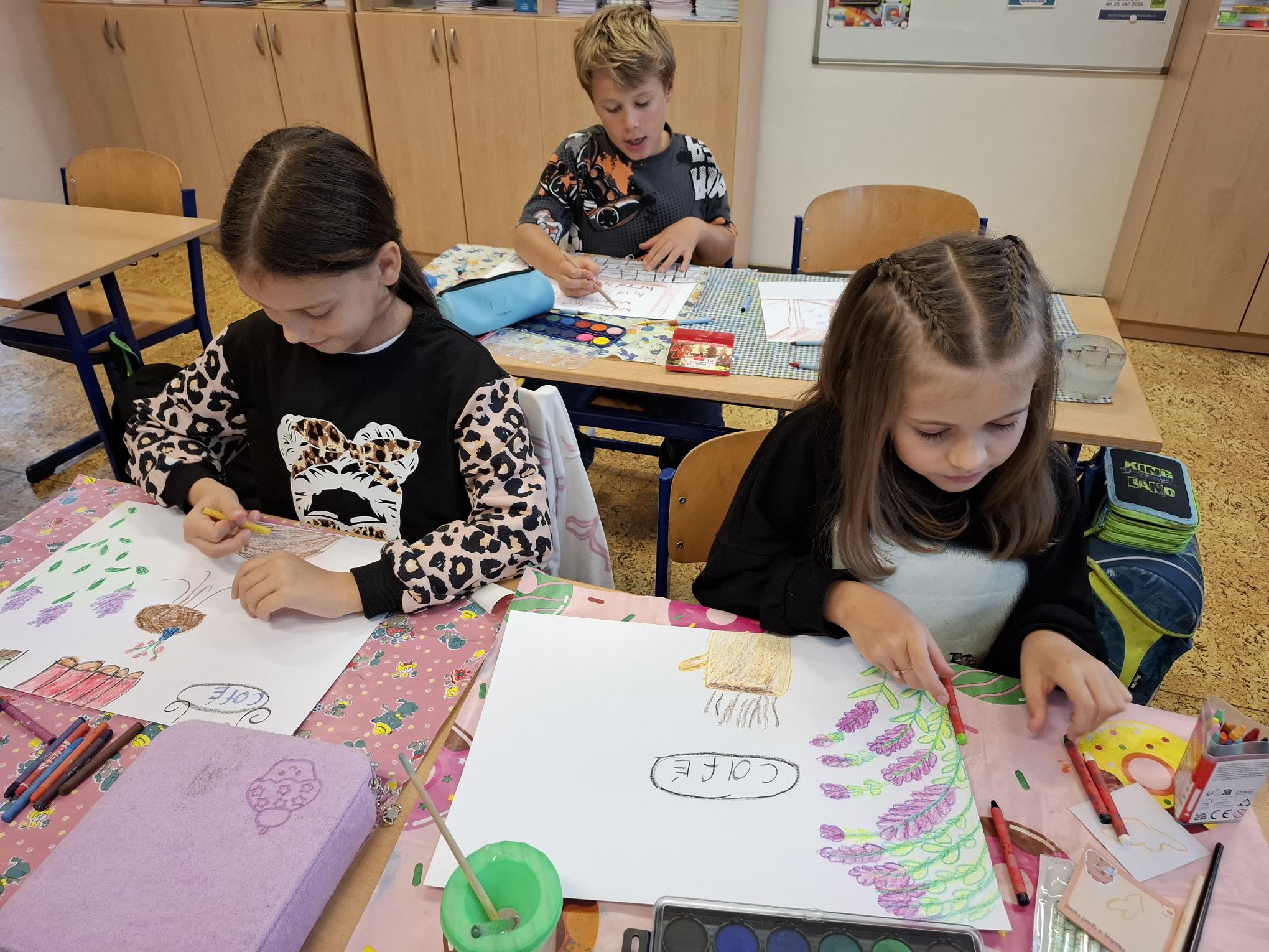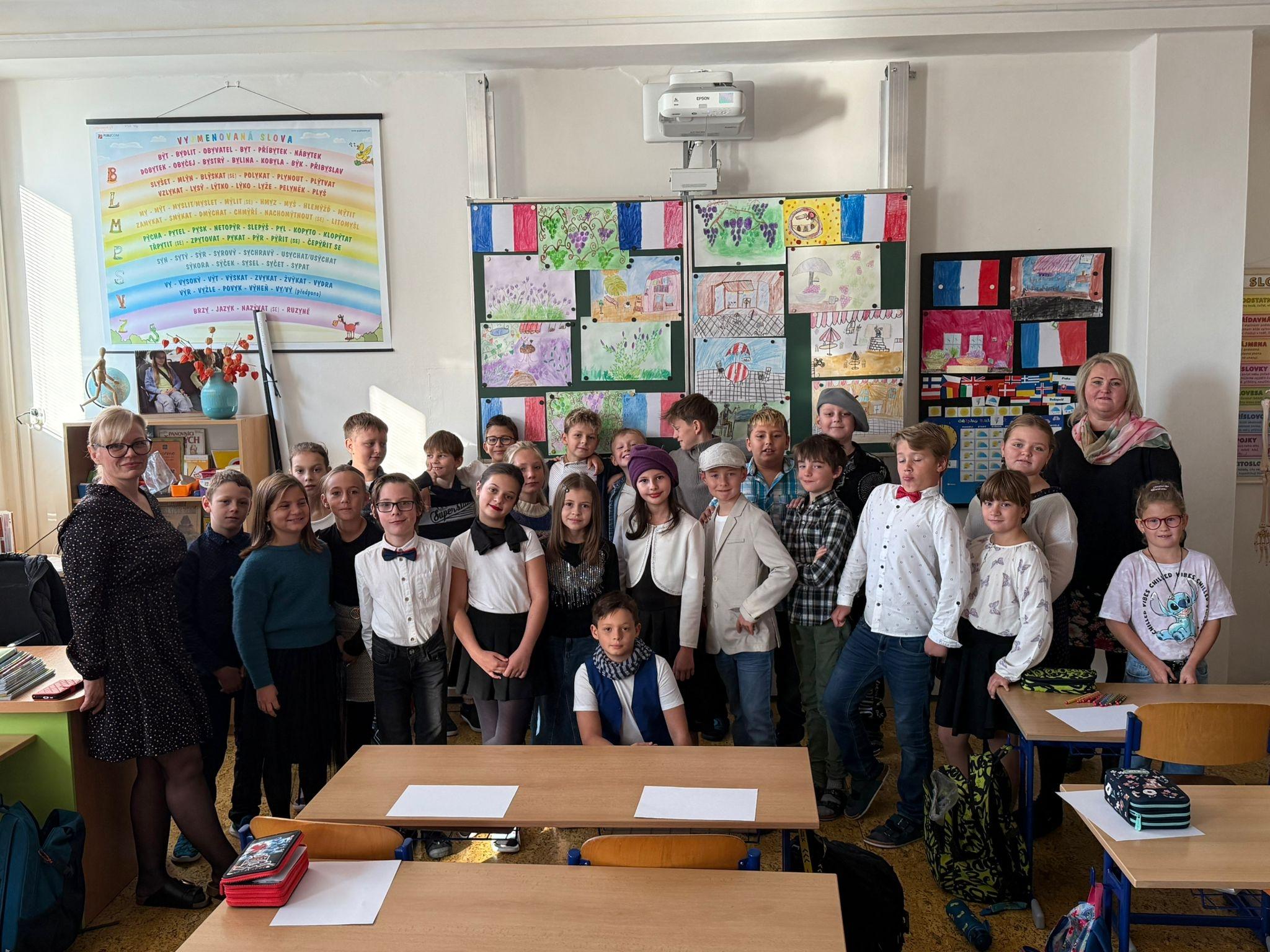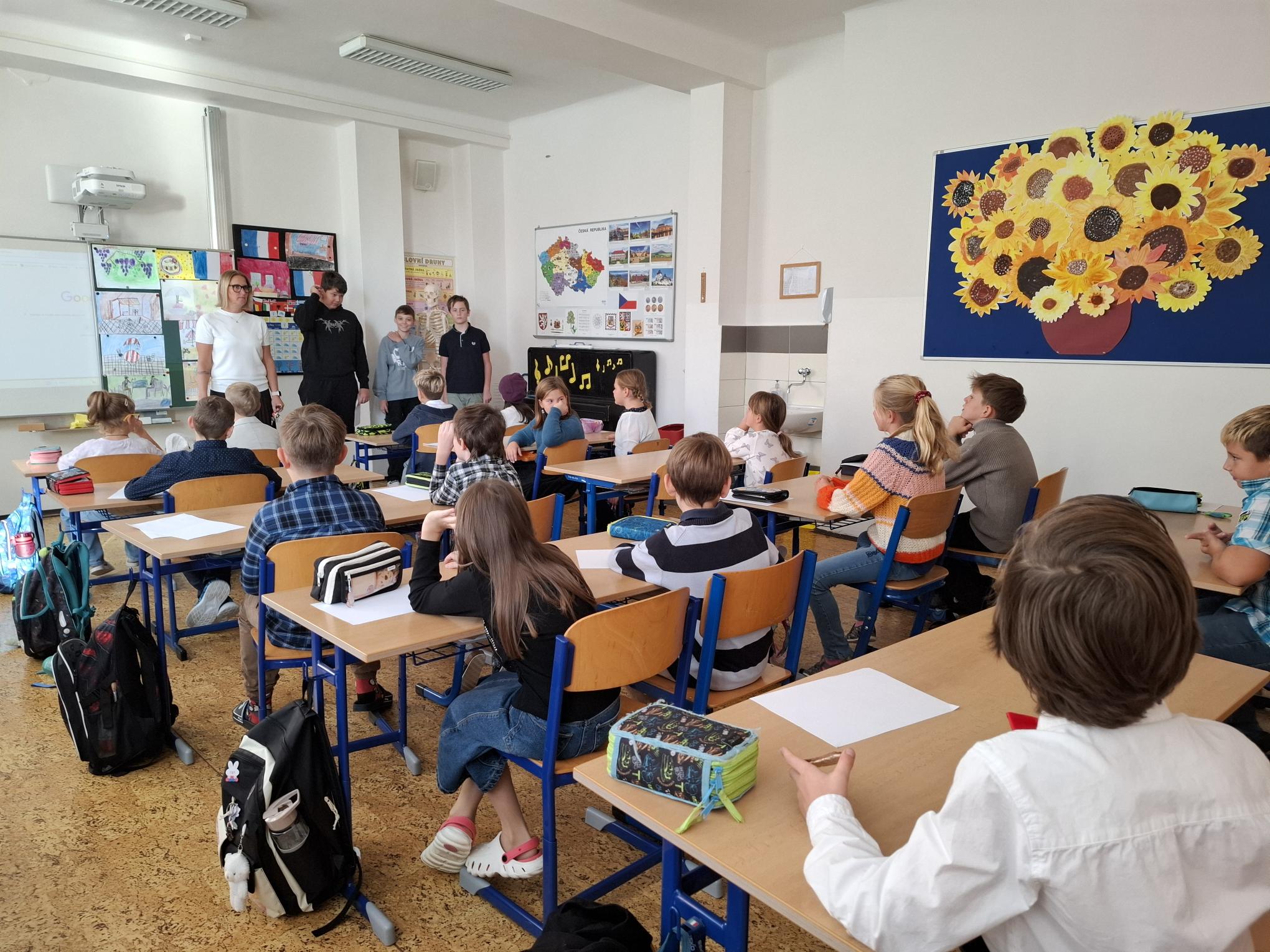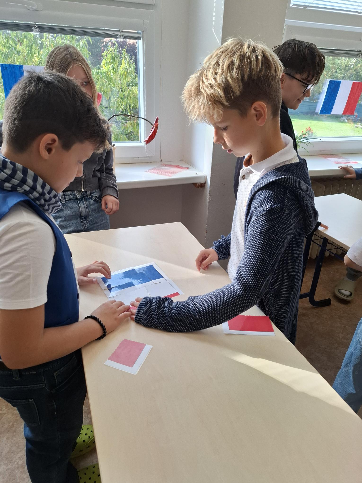 K tématu Francie jsme také malovali obrázky – francouzskou vlajku, levandulová pole, kavárny nebo croissanty. Celým týdnem nás provázeli žáci sedmé třídy, kteří si pro nás připravili zábavný program. Ten prověřil, co všechno jsme se o Francii a o našem partnerském městě naučili.