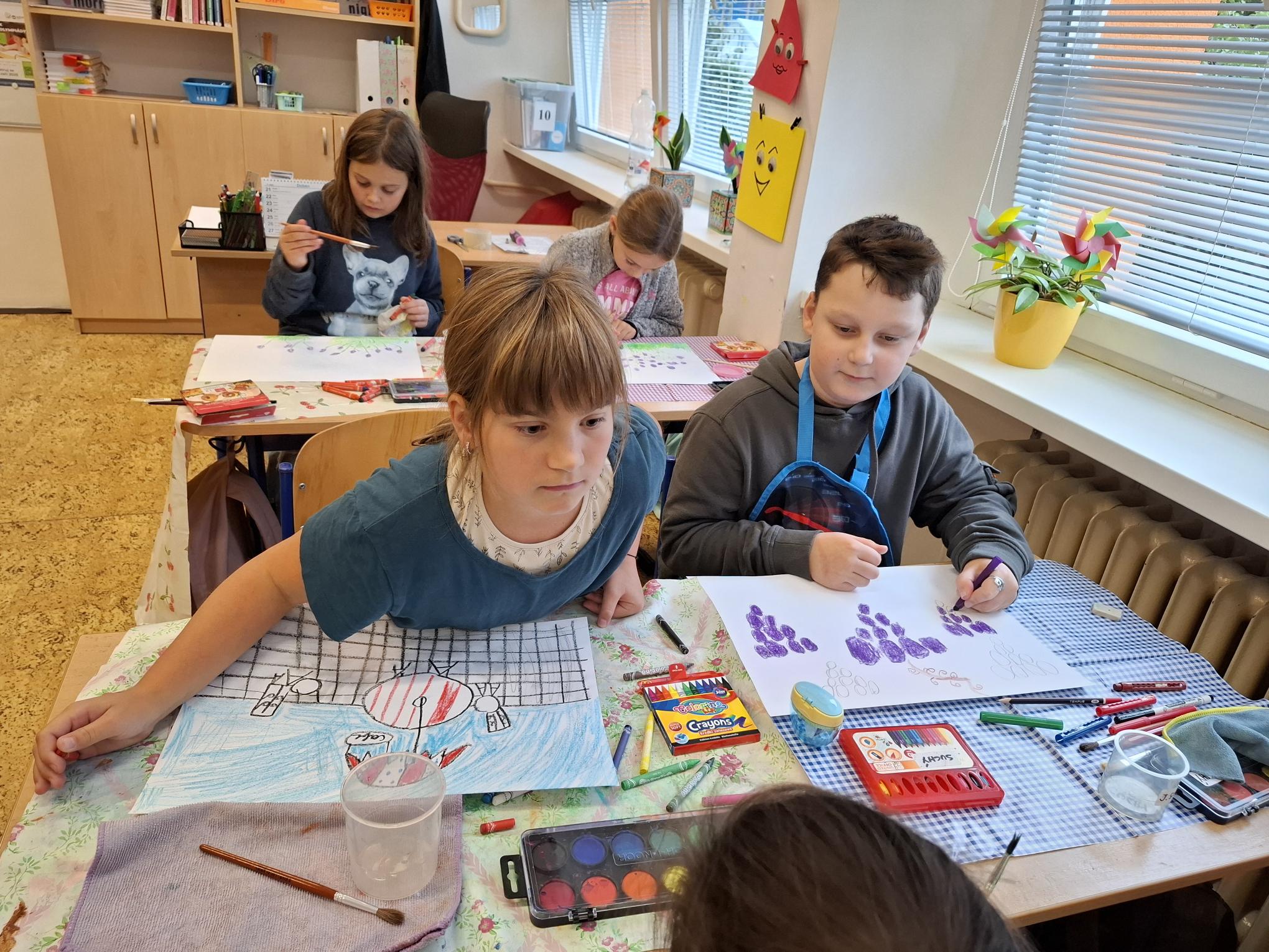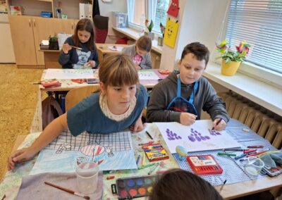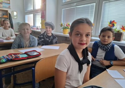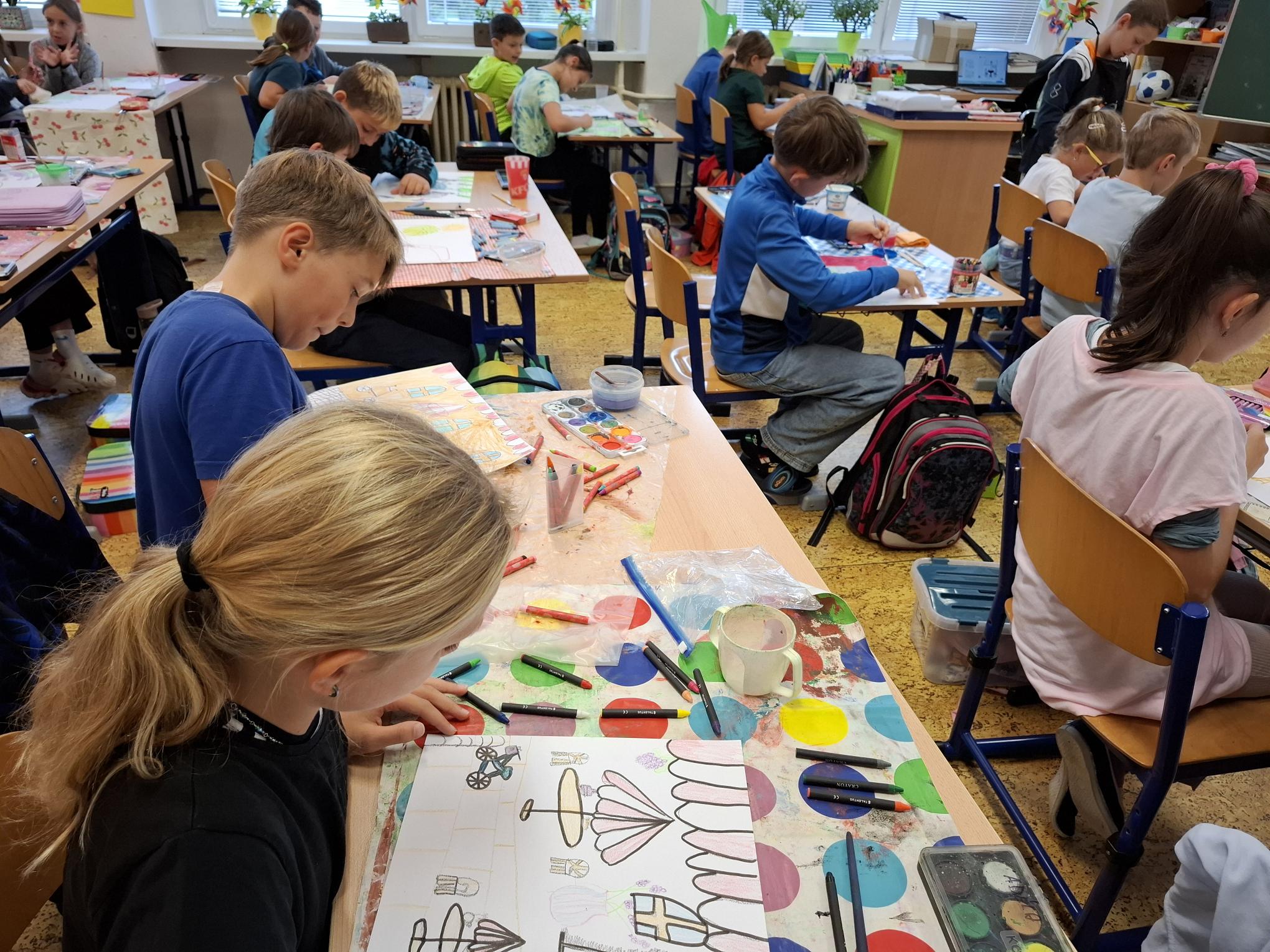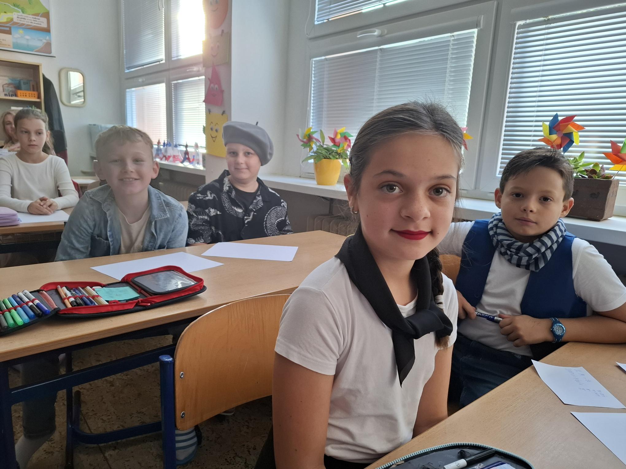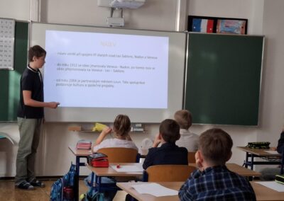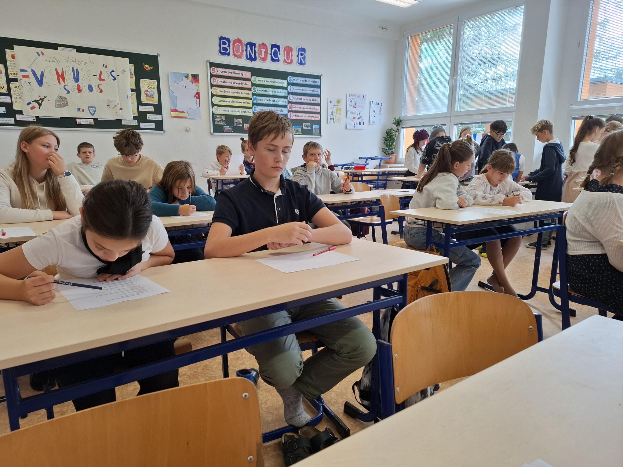 K tématu Francie jsme také malovali obrázky – francouzskou vlajku, levandulová pole, kavárny nebo croissanty. Celým týdnem nás provázeli žáci sedmé třídy, kteří si pro nás připravili zábavný program. Ten prověřil, co všechno jsme se o Francii a o našem partnerském městě naučili.