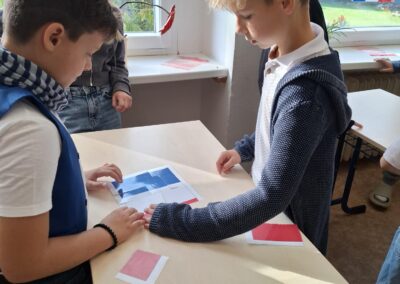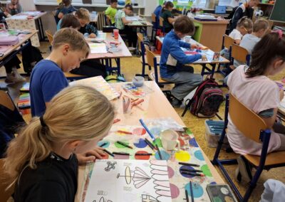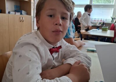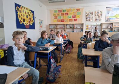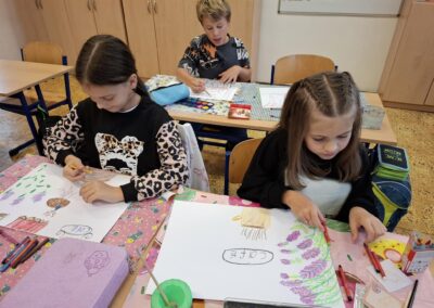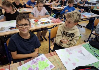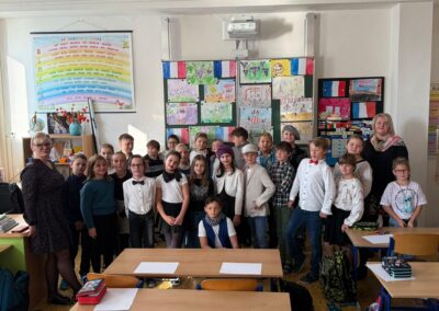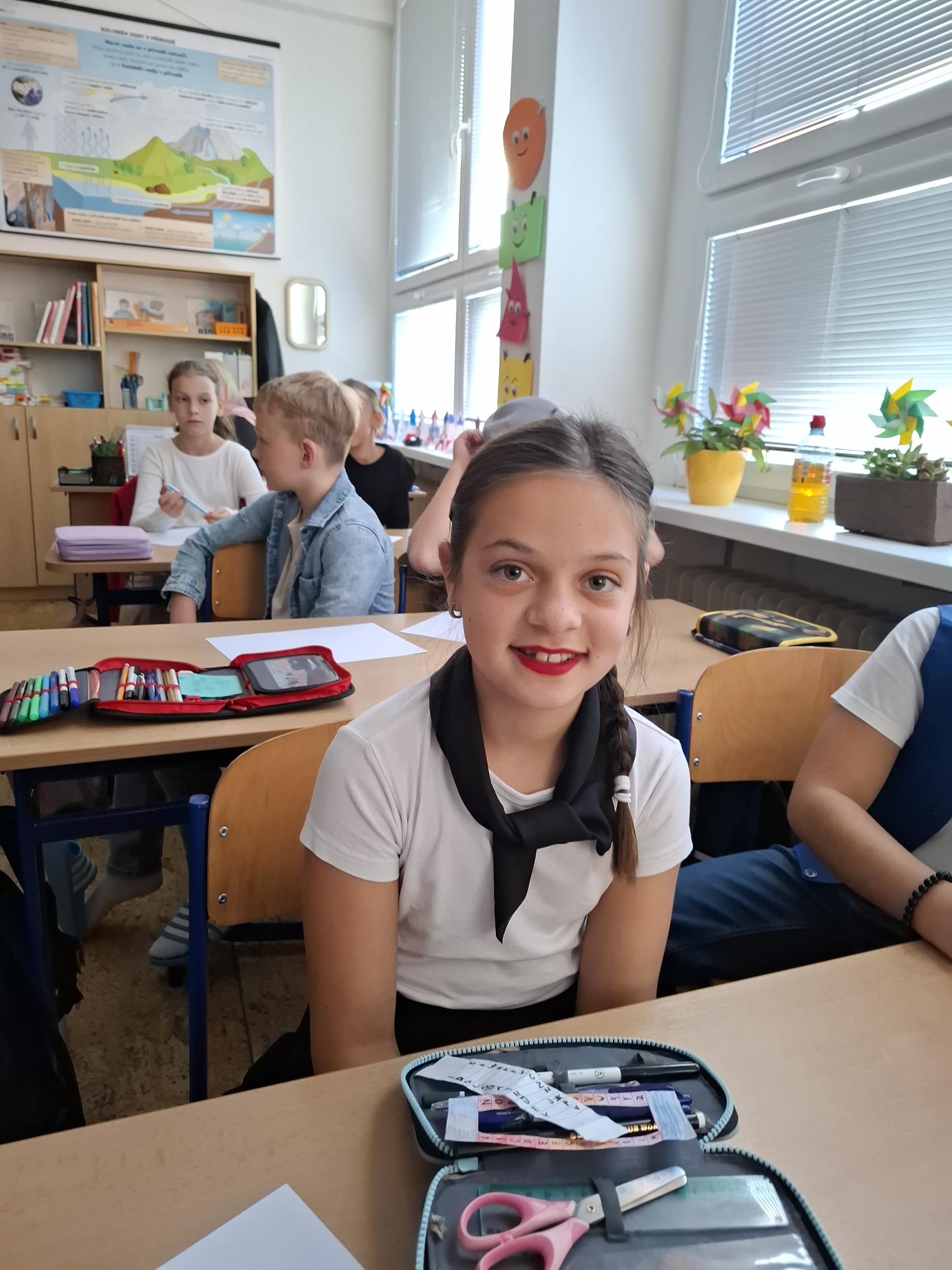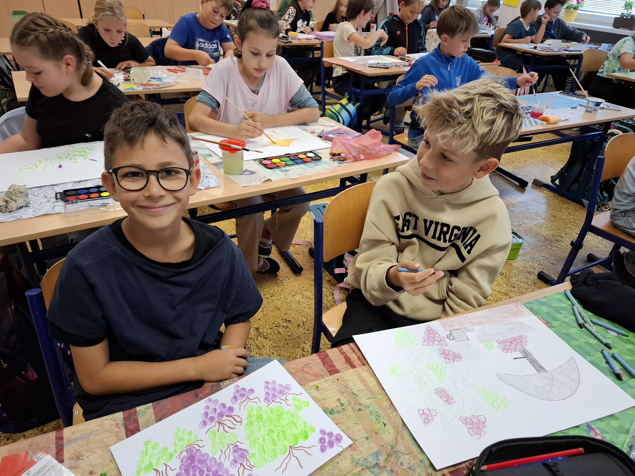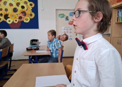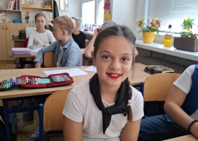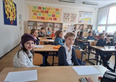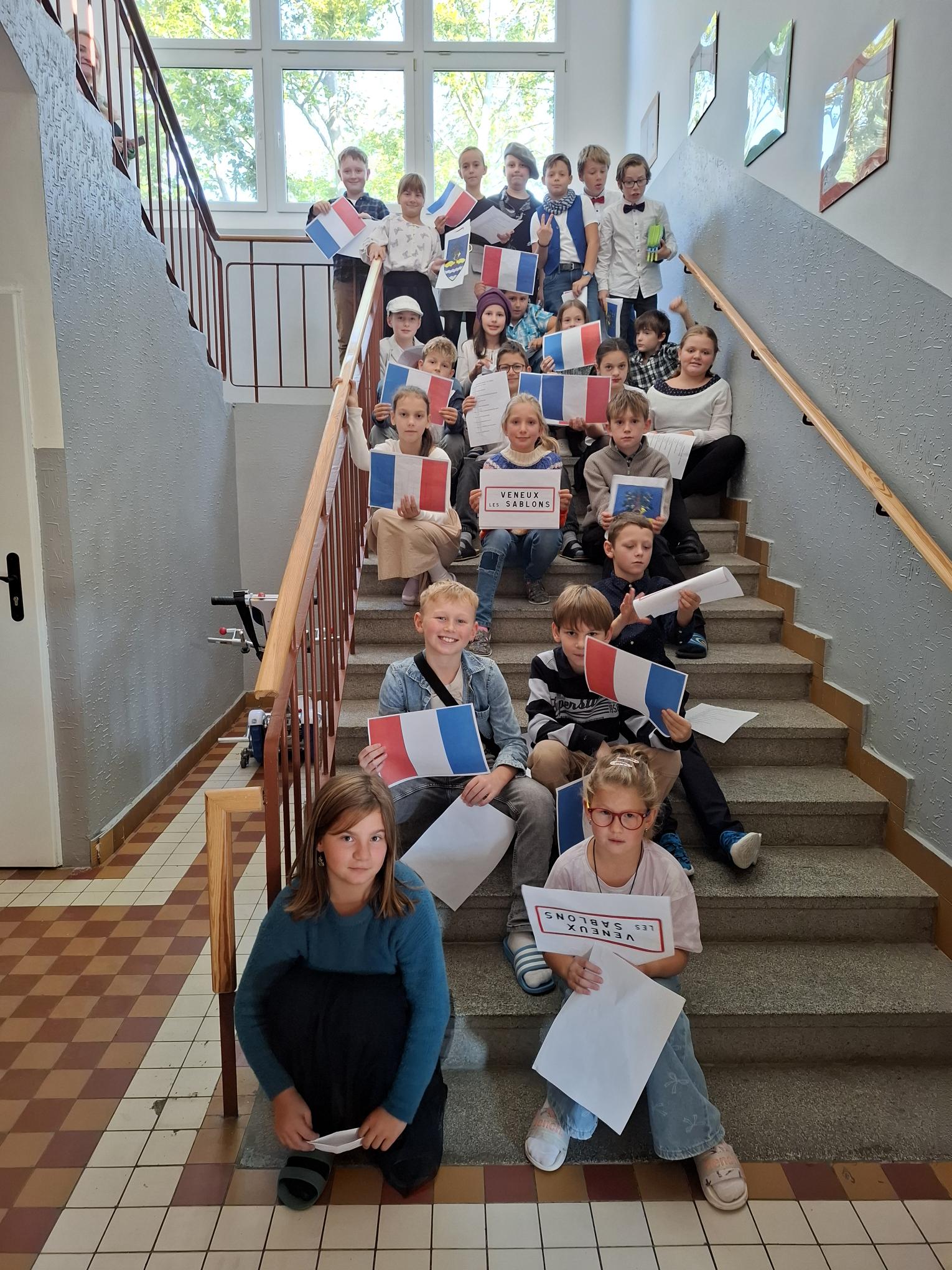 K tématu Francie jsme také malovali obrázky – francouzskou vlajku, levandulová pole, kavárny nebo croissanty. Celým týdnem nás provázeli žáci sedmé třídy, kteří si pro nás připravili zábavný program. Ten prověřil, co všechno jsme se o Francii a o našem partnerském městě naučili.