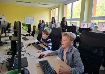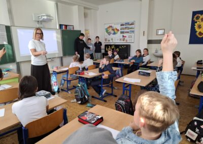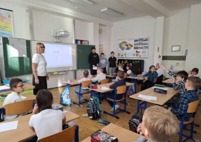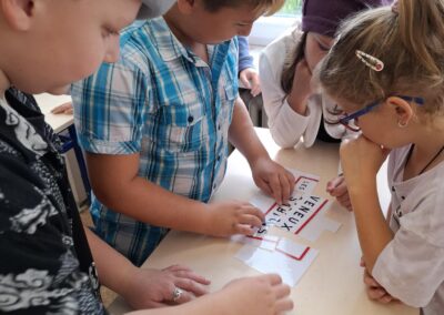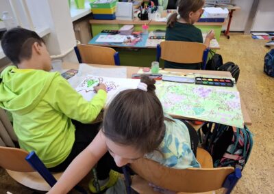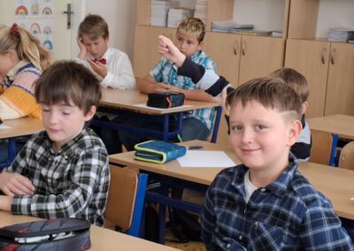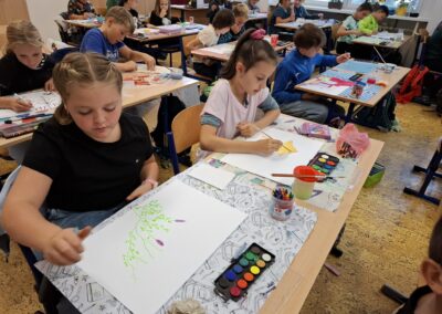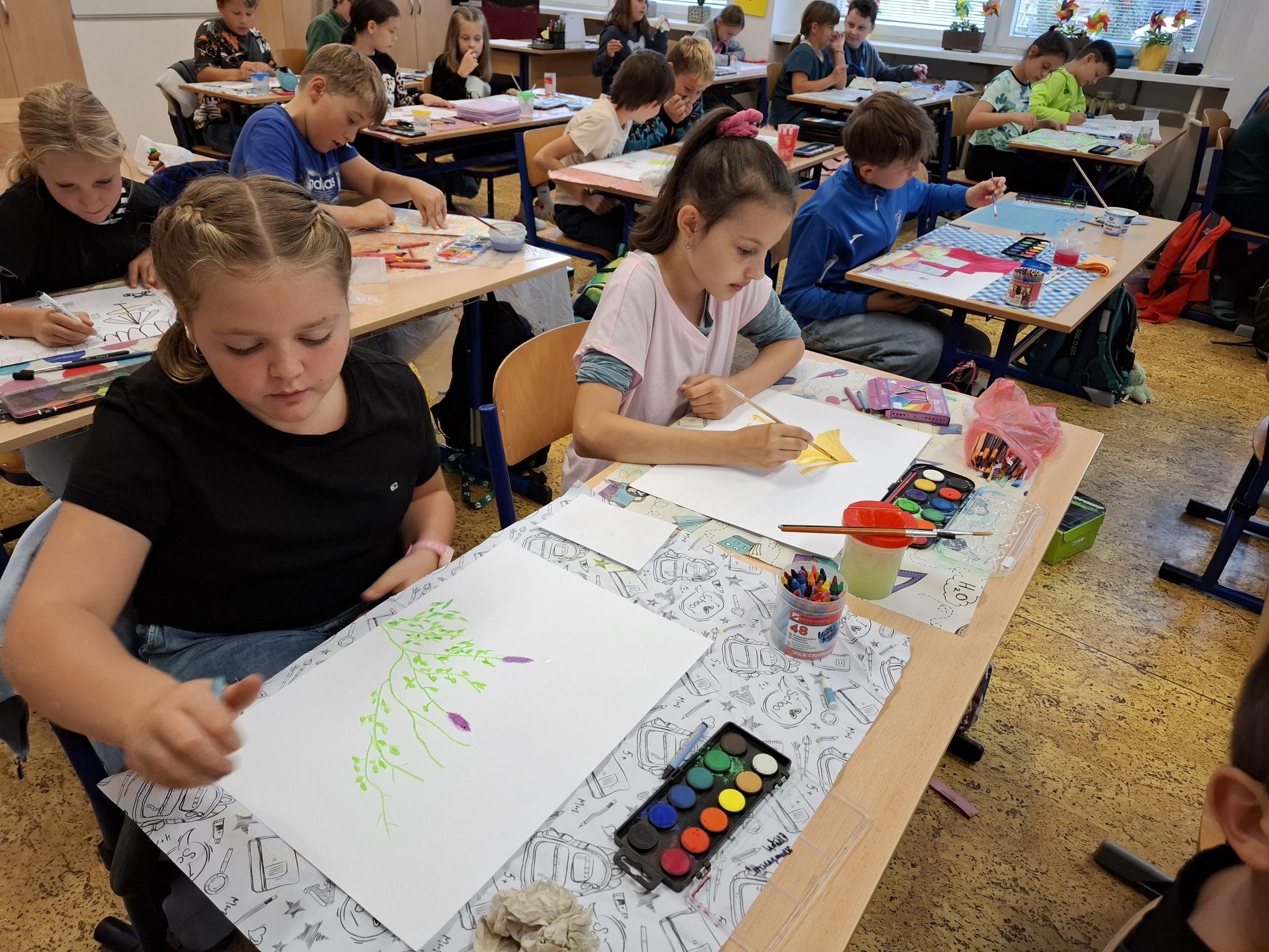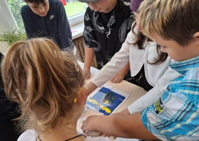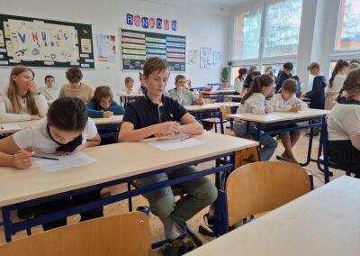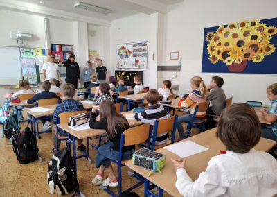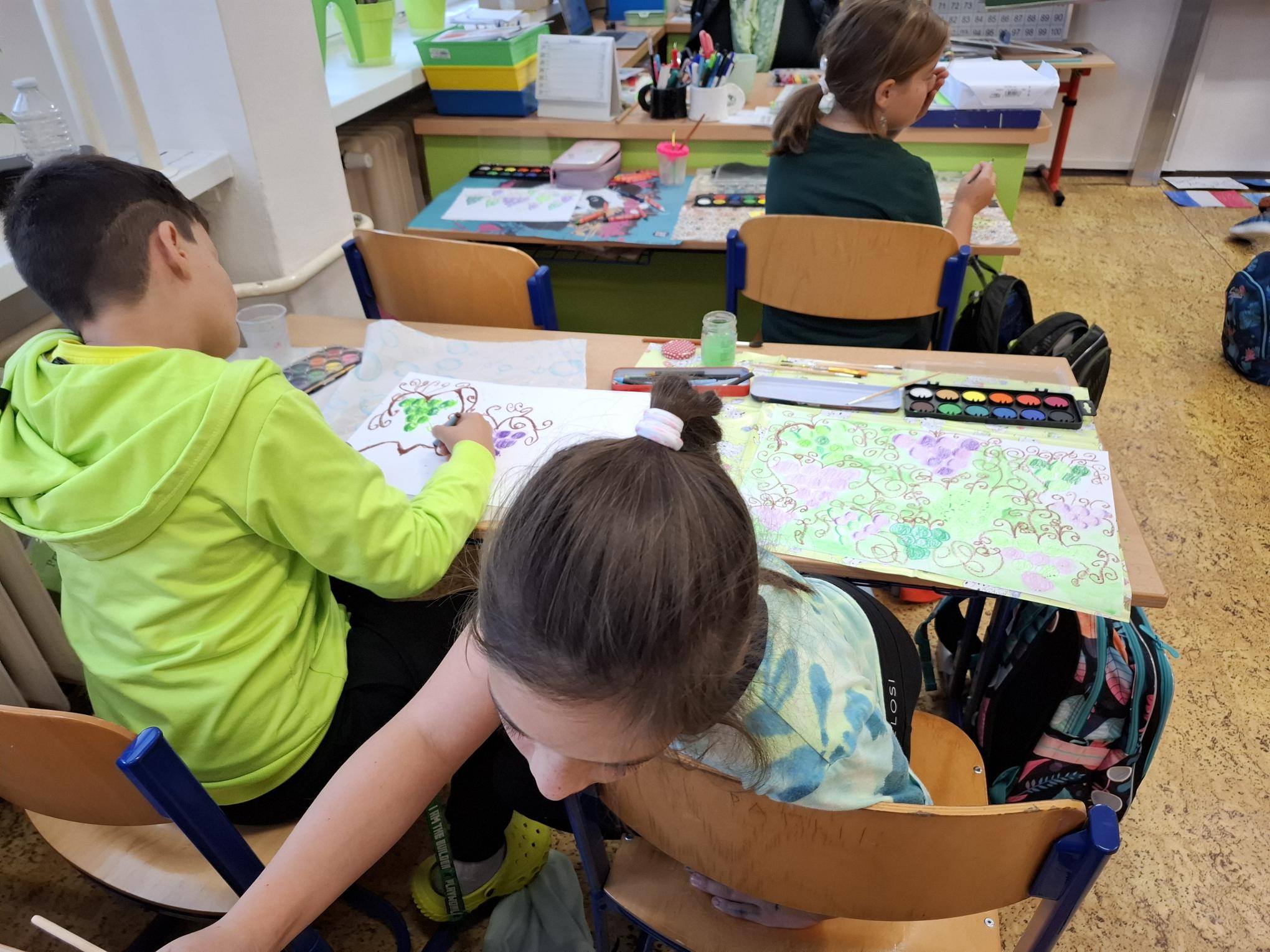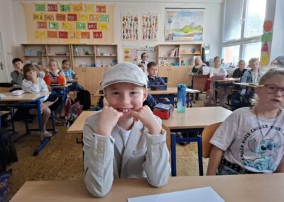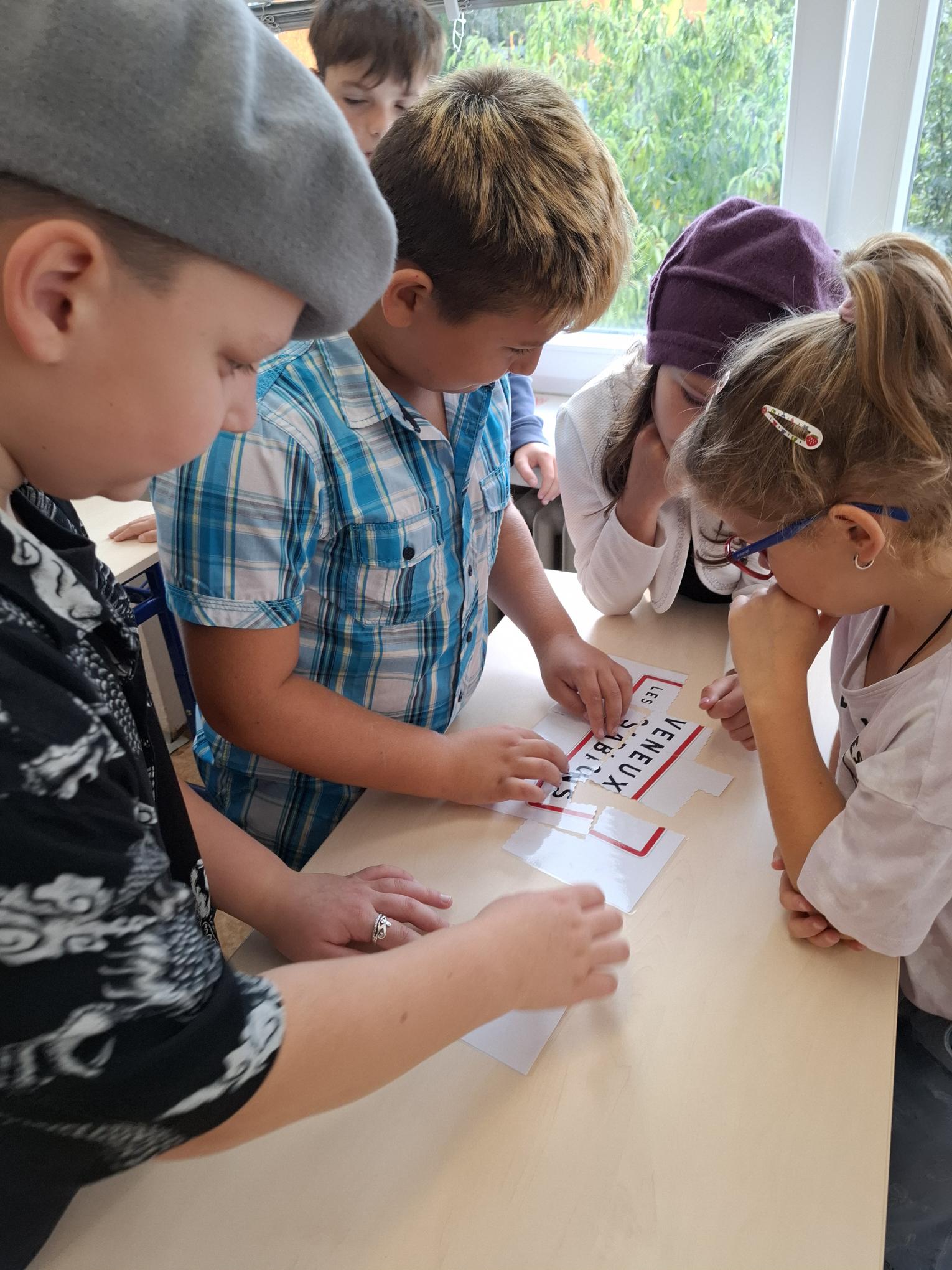 K tématu Francie jsme také malovali obrázky – francouzskou vlajku, levandulová pole, kavárny nebo croissanty. Celým týdnem nás provázeli žáci sedmé třídy, kteří si pro nás připravili zábavný program. Ten prověřil, co všechno jsme se o Francii a o našem partnerském městě naučili.