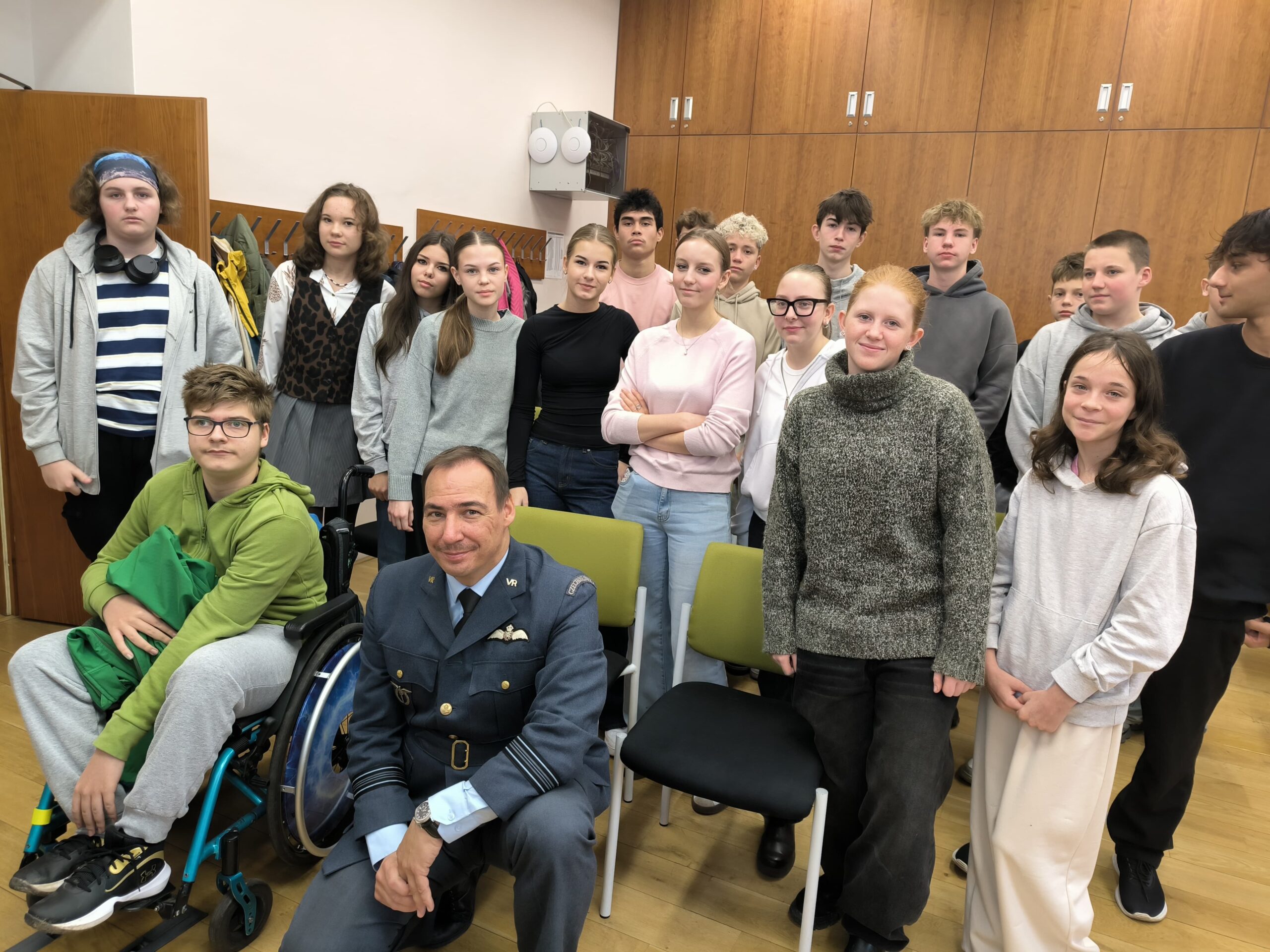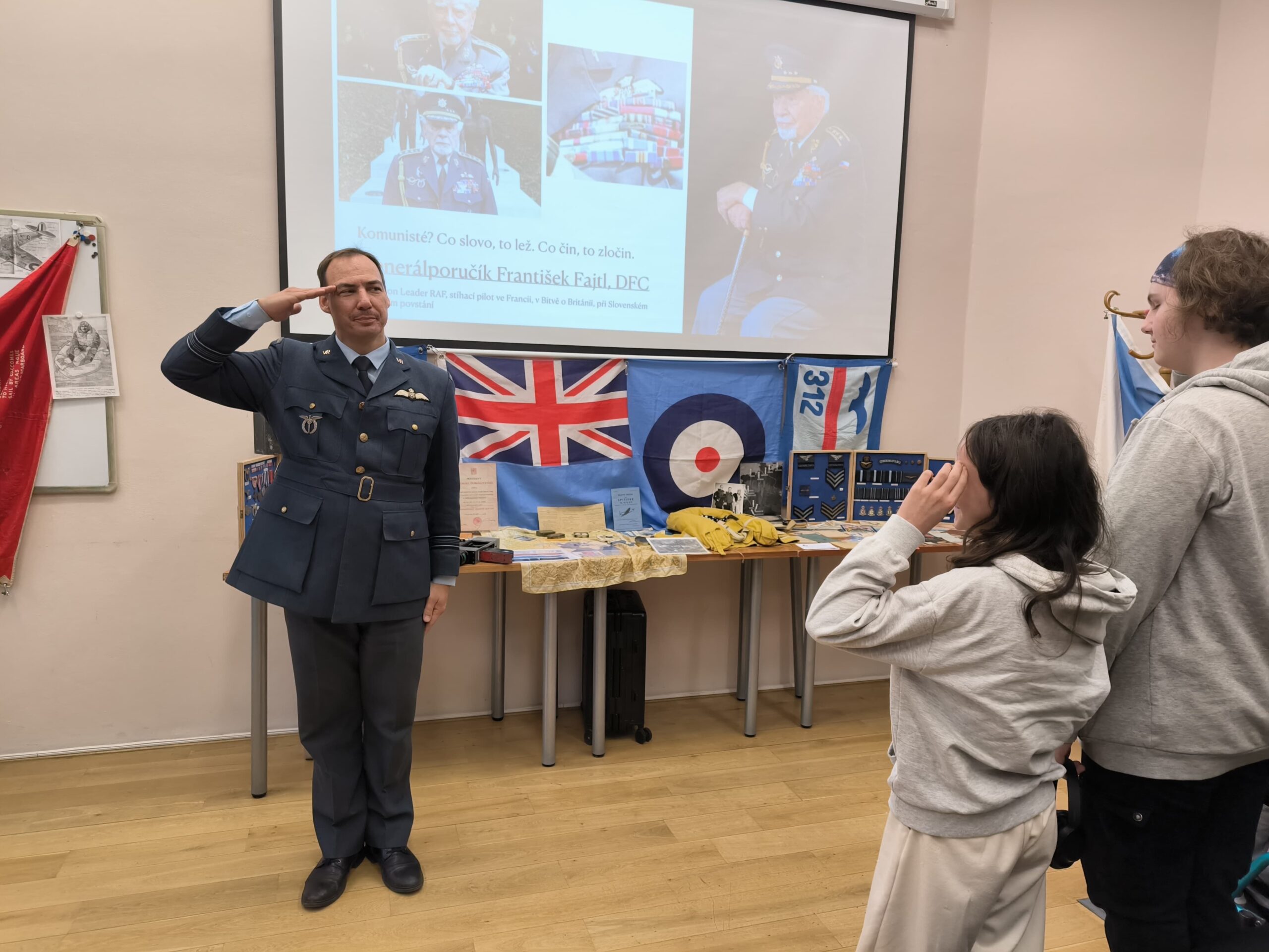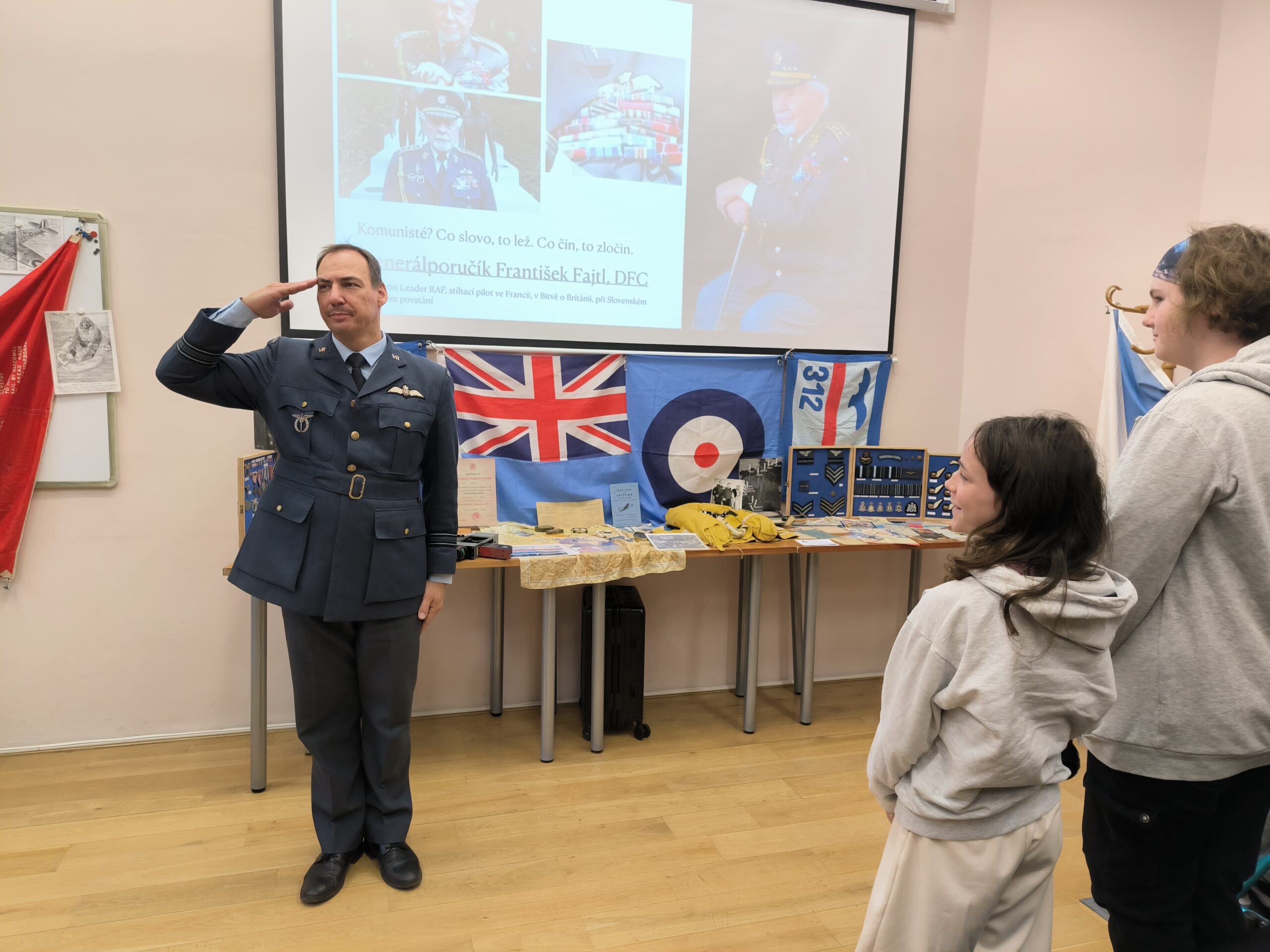Žáci obou devátých tříd se ve čtvrtek 13. listopadu zúčastnili besedy o českých letcích bojujících v Británii proti německému letectvu Luftwaffe za 2. světové války. V téměř zaplněném sálku Městské knihovny v Lounech se pomyslně přenesli do předválečného i válkou zasaženého období a společně prožili životní příběh generálporučíka Františka Peřiny a jeho manželky Anny. Skvělým lektorem, který dokázal všechny zaujmout, byl PhDr. Daniel Švec. Pro zvýšení autentičnosti přednášel v dobové uniformě britského letce.