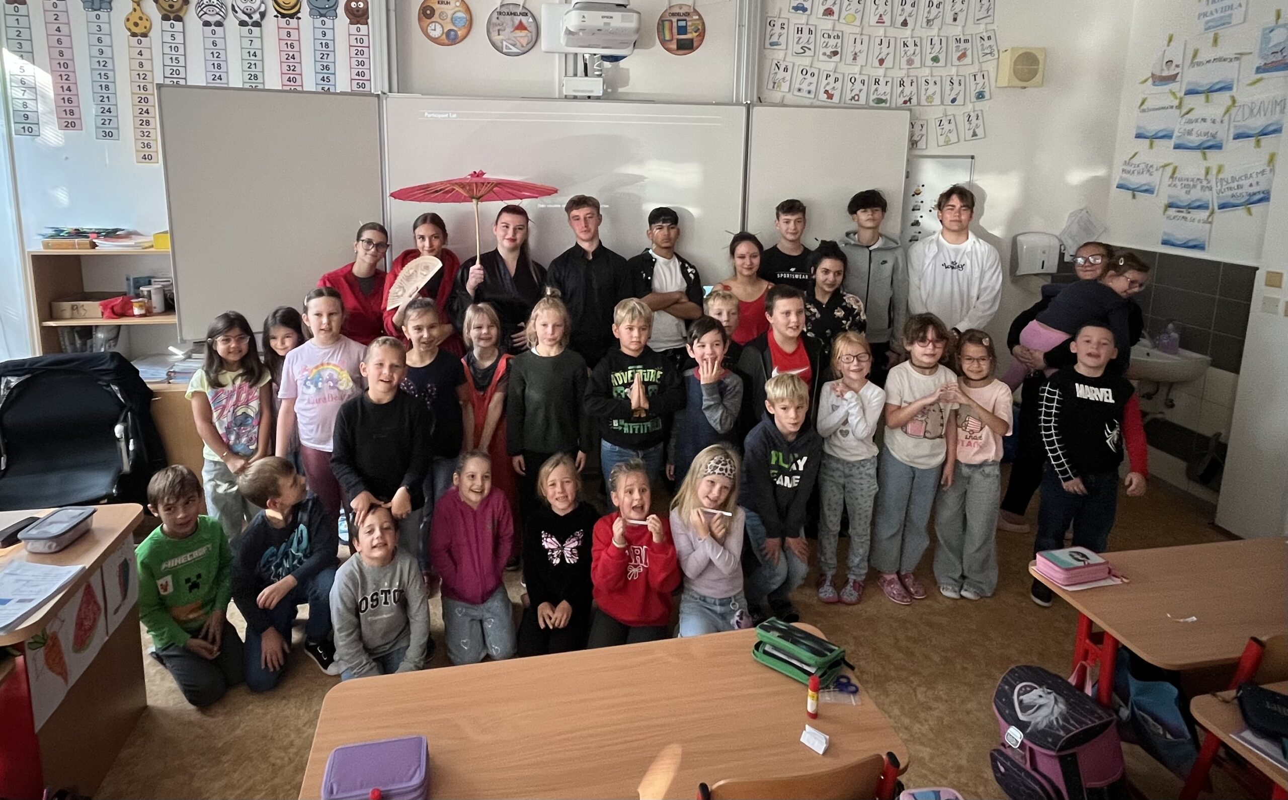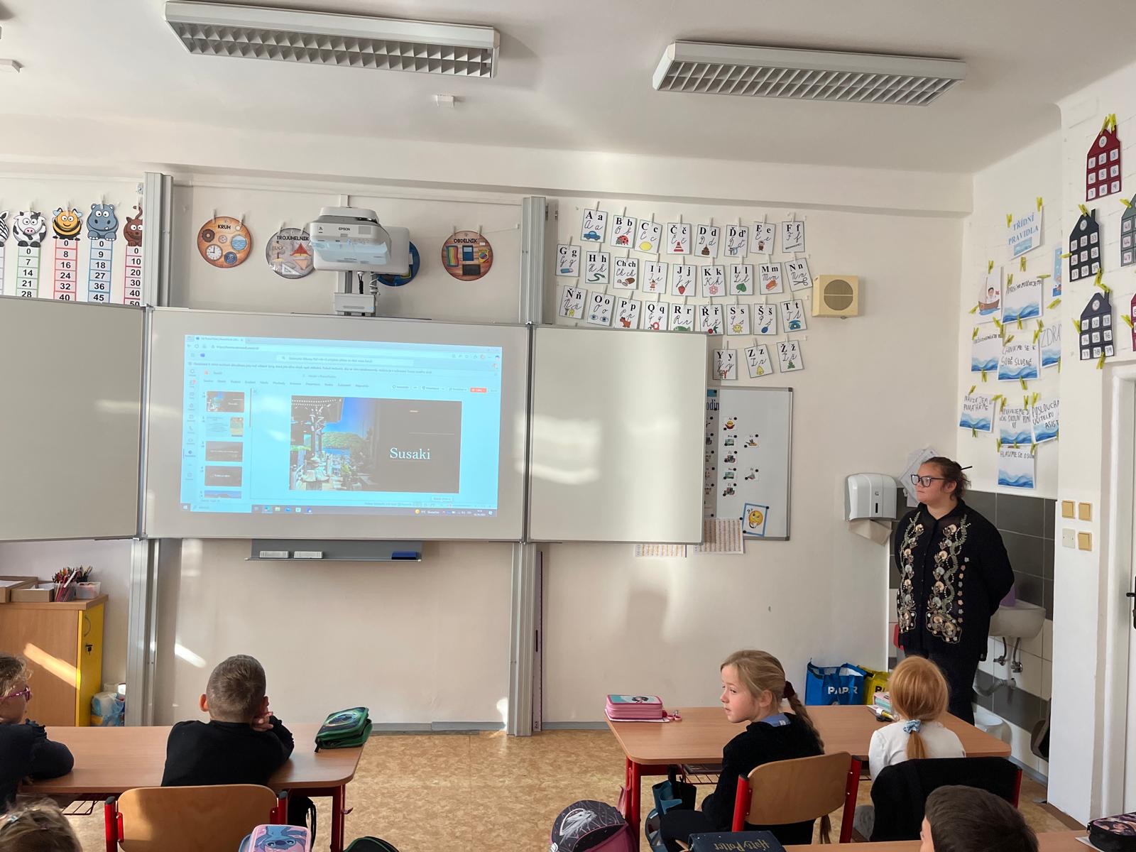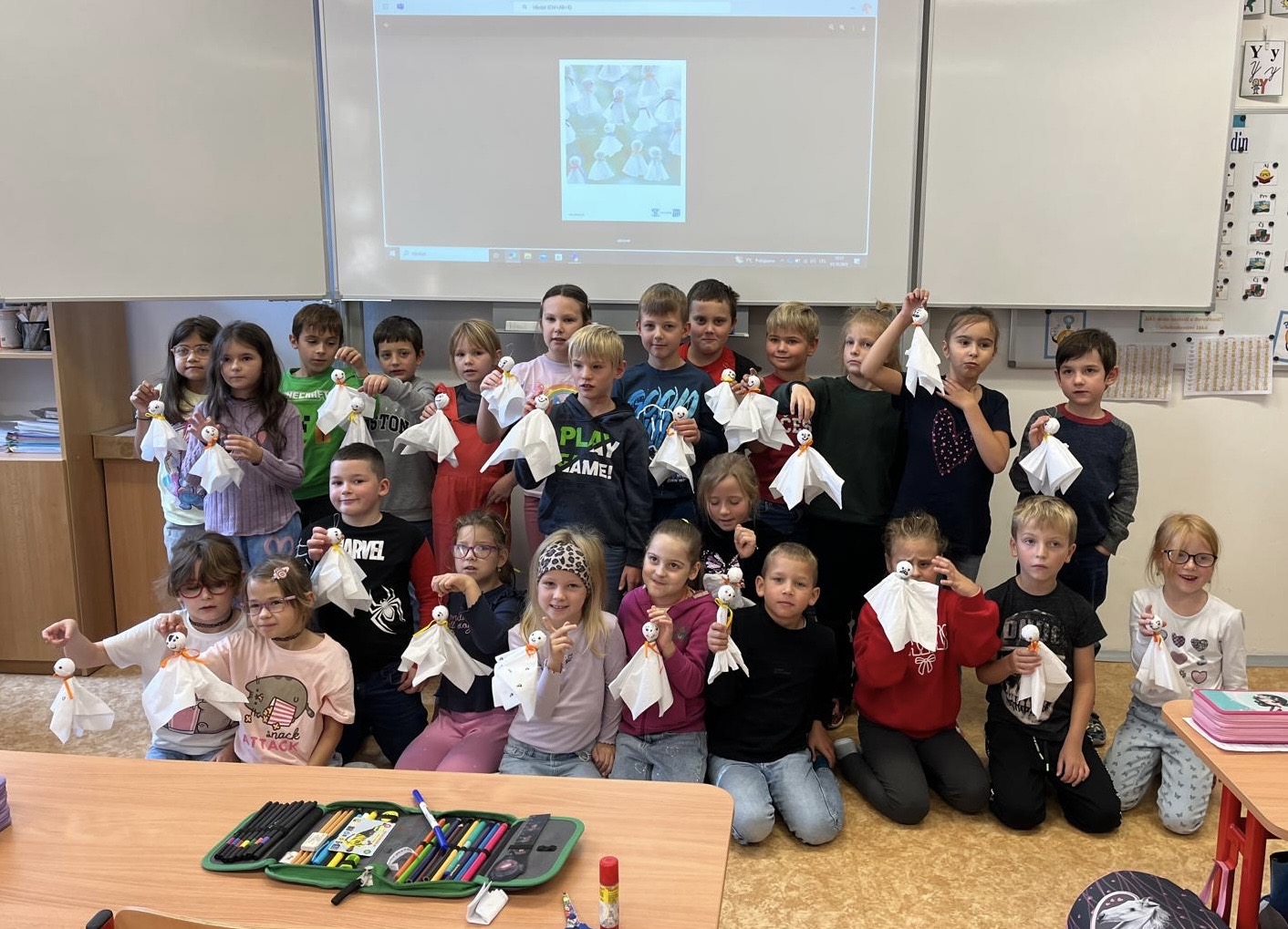 V pátek 3. 10. 2025 proběhl v rámci multikulturního týdne projektový den. Naše třída navštívila žáky 2.C a seznámila je s Japonskem. Naše škola je spřátelená s městem Susaki, proto jim žáci představili i toto město. Japonští kamarádi naše žáky naučili vyrábět duchy Tera Tera Bozu a my to naučili naše mladší spolužáky. Každý si rozlomil i koláček štěstí a na závěr složili znak města Susaki.