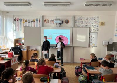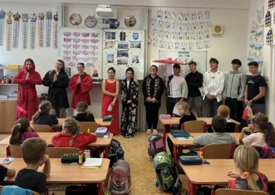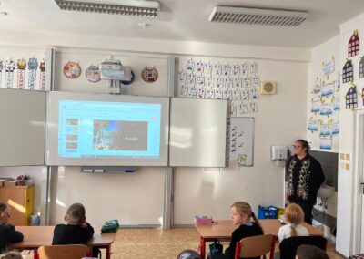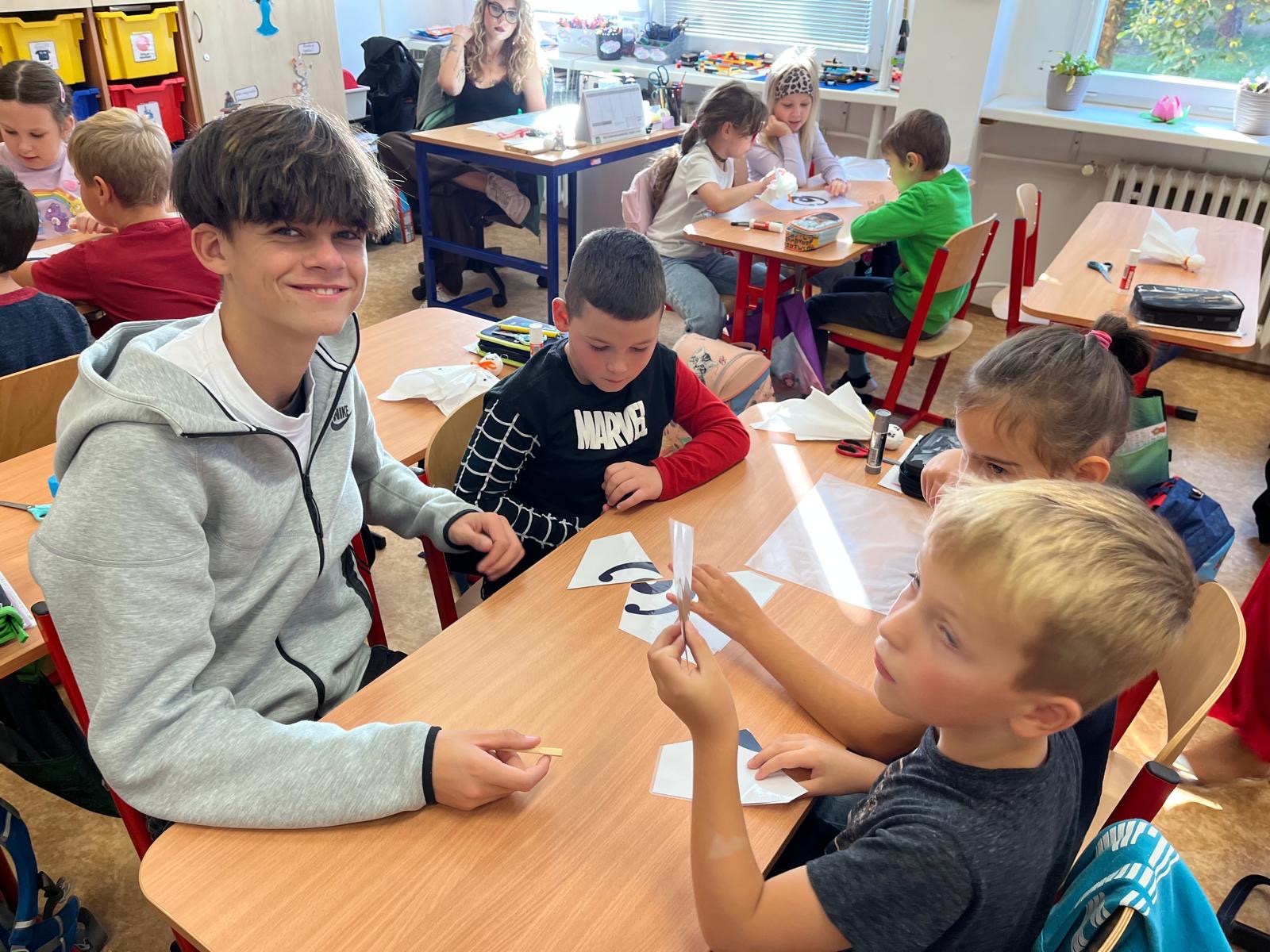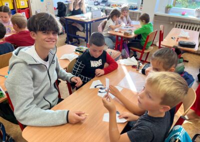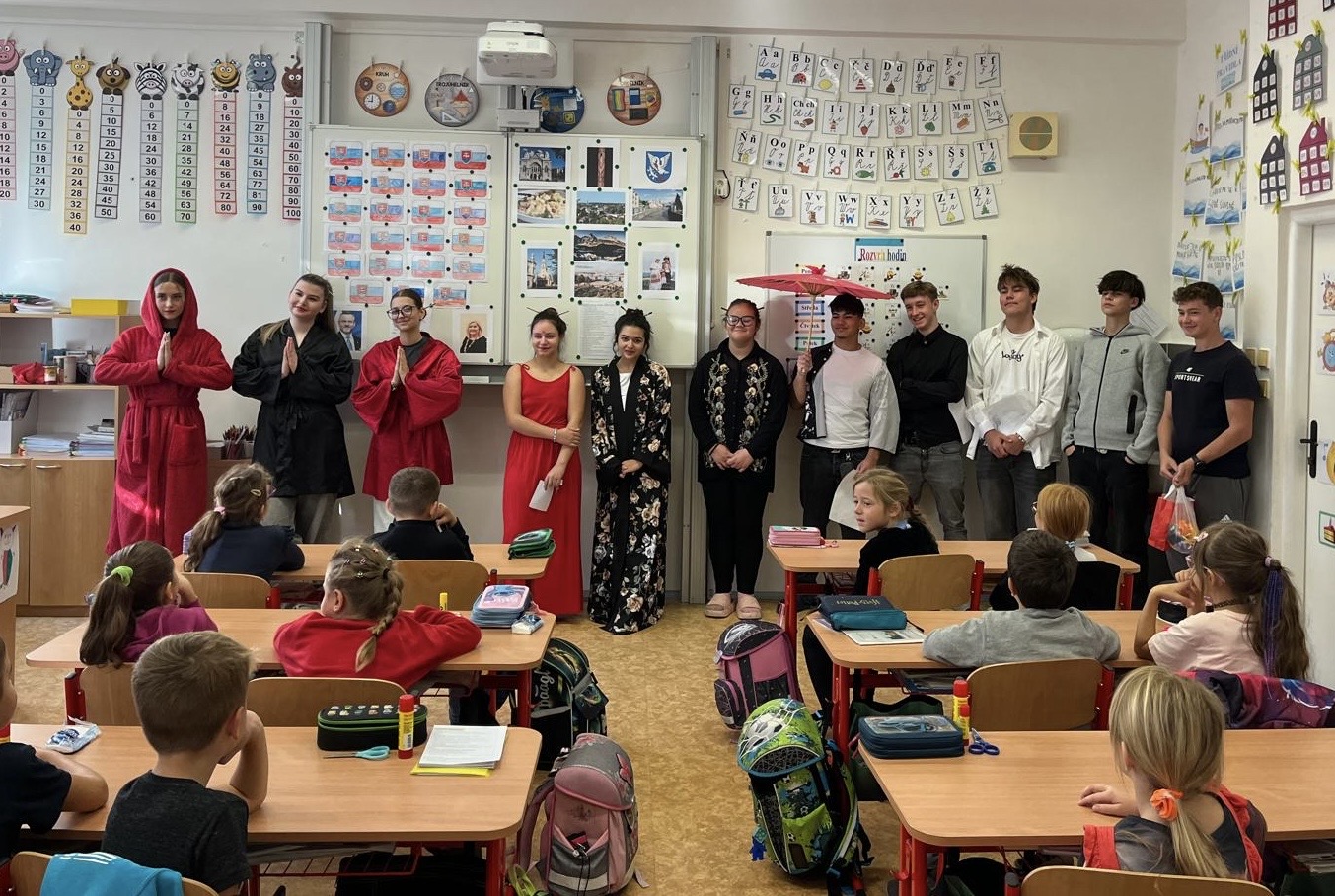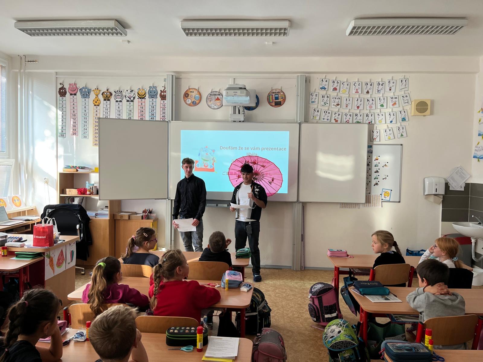 V pátek 3. 10. 2025 proběhl v rámci multikulturního týdne projektový den. Naše třída navštívila žáky 2.C a seznámila je s Japonskem. Naše škola je spřátelená s městem Susaki, proto jim žáci představili i toto město. Japonští kamarádi naše žáky naučili vyrábět duchy Tera Tera Bozu a my to naučili naše mladší spolužáky. Každý si rozlomil i koláček štěstí a na závěr složili znak města Susaki.