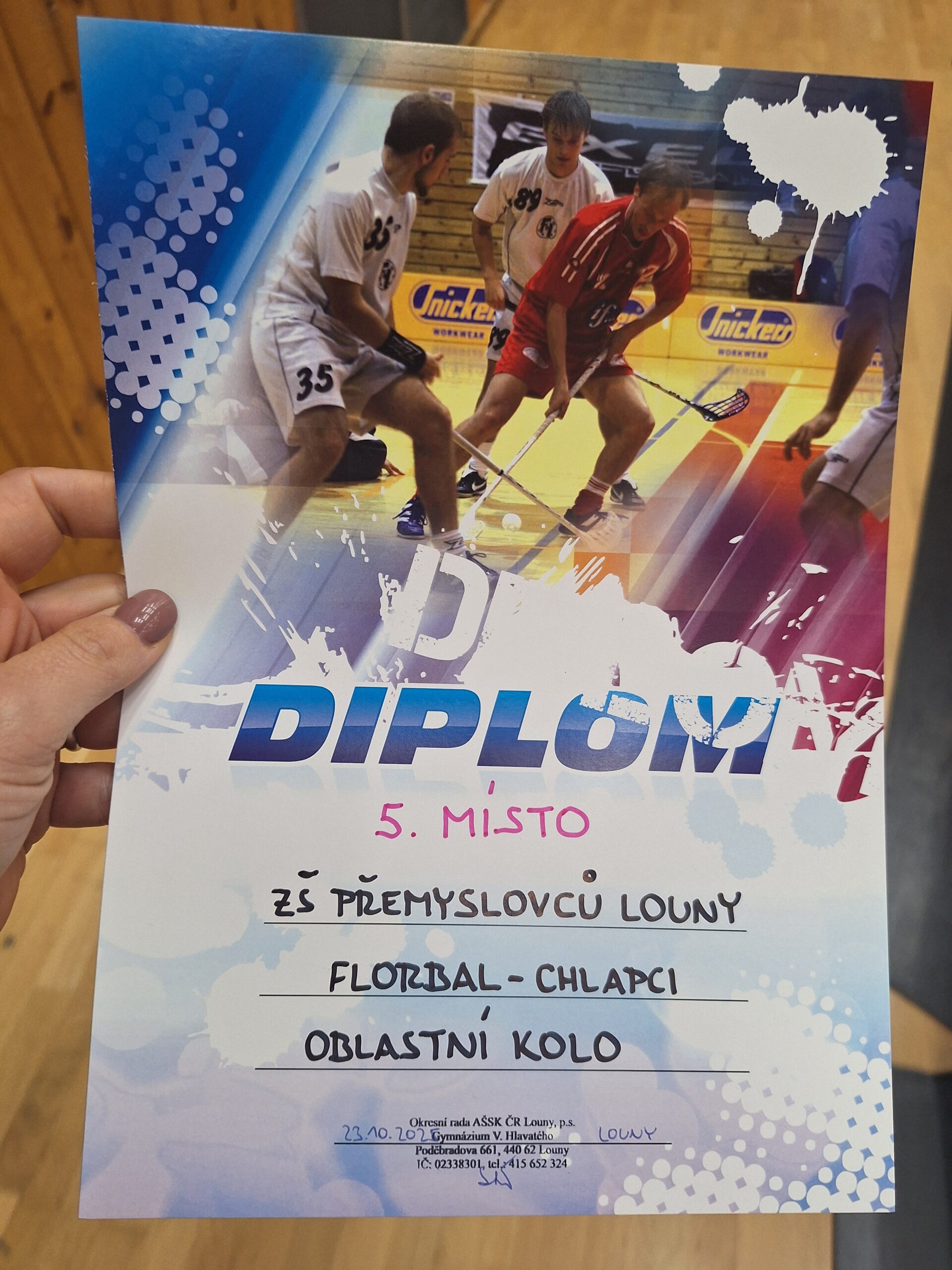Dne 23.10. 2025 se v Městské sportovní hale v Lounech konalo oblastní kolo starších chlapců ve florbalu. Chlapci předvedli velkou bojovnost a krásný florbal, za který si zaslouží velké poděkování. V silné konkurenci vybojovali 5. místo. Děkujeme za skvělý sportovní výkon, týmového ducha a čestnou reprezentaci naší školy.