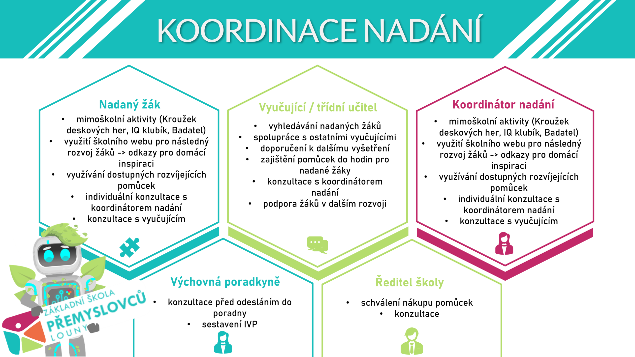 Od roku 2018 má naše Základní škola Louny, Přemyslovců, tu čest spolupracovat s Mensou ČR – DETI.MENSA.CZ – ZŠ Přemyslovců, Louny. Na naší základní škole se cíleně věnujeme rozvoji nadání a intelektových schopností od 1. třídy. V rámci výuky umožňujeme nadaným žákům účast na výuce ve vyšších ročnících, a to po předchozí konzultaci s vedením školy. V hodinách využíváme také vytahovaných skupin pro obohacování výuky a individuální rozvoj našich žáků. Již několikátý rok funguje na škole Klub nadaných dětí, na 2. stupni pod názvem Badatel a na 1. stupni pod názvem Zvídálkové. Díky velké podpoře ze strany vedení školy se můžeme každoročně těšit na přísun nových a zajímavých pomůcek pro bádání, objevování a celkový rozvoj žáků. Již třetím rokem jsme zapojeni do projektu Ústeckého kraje – Centra podpory nadání. – 2.3 Podpora rovných příležitostí a rozvoj potenciálu žáků: KÚ Ústecký kraj