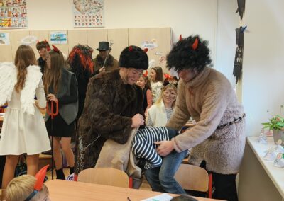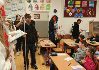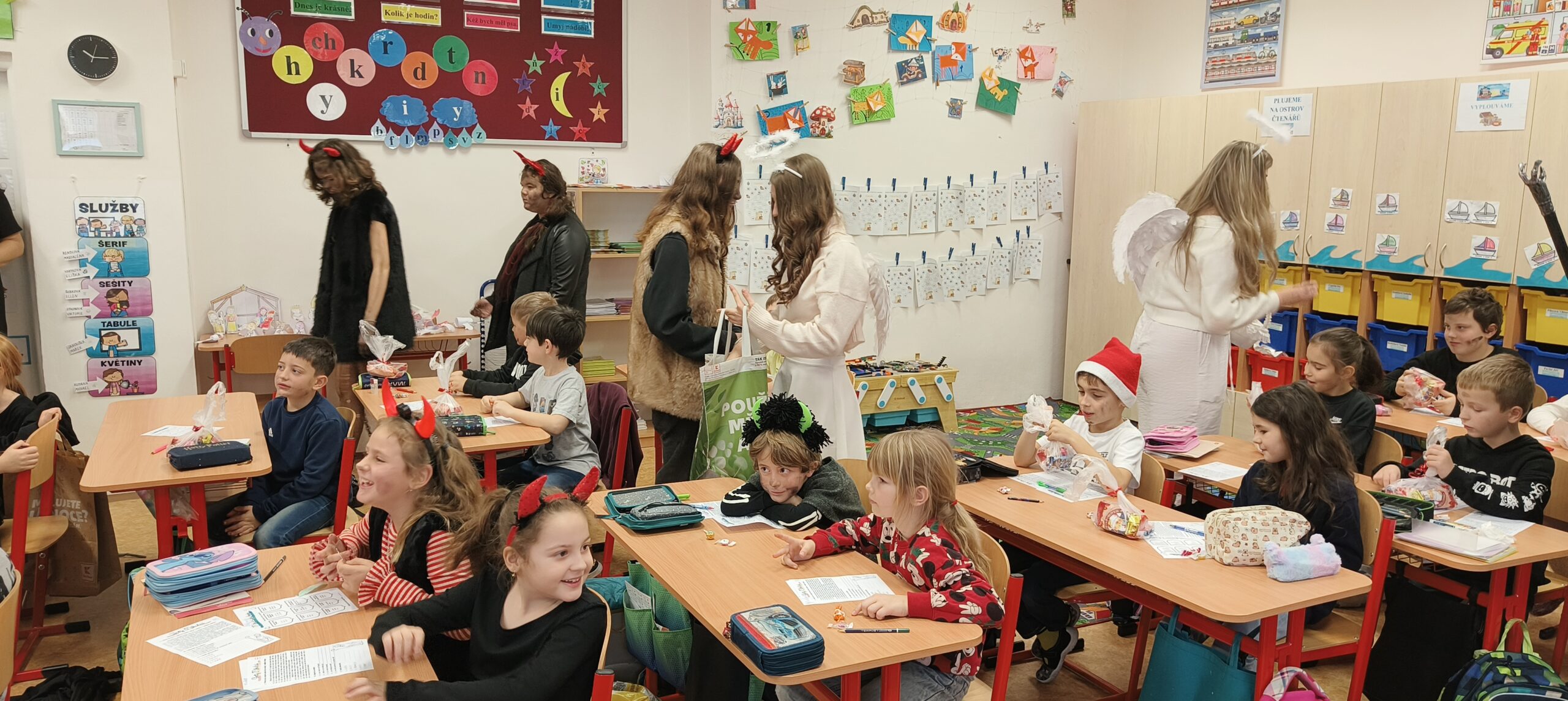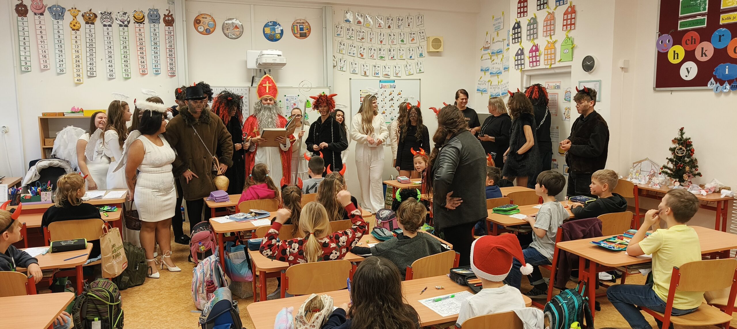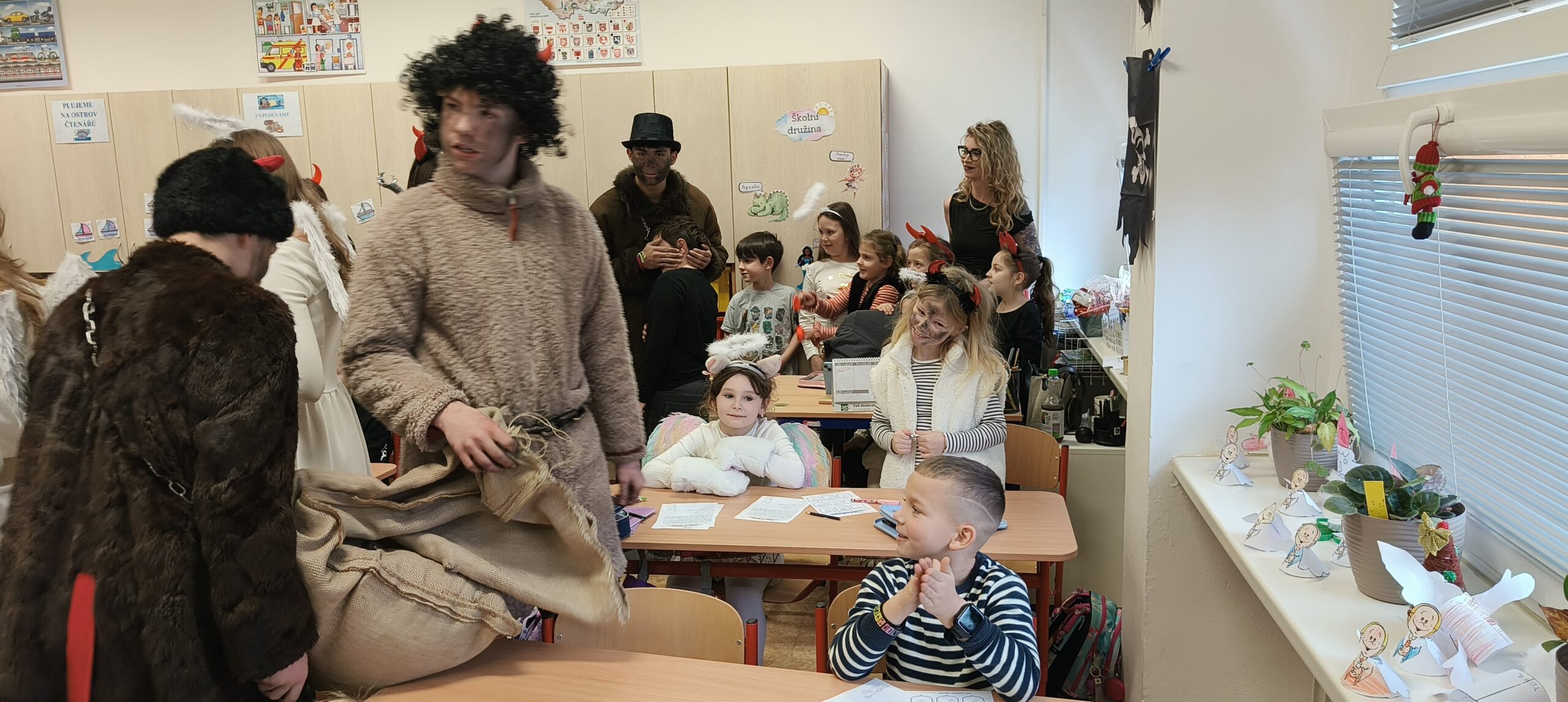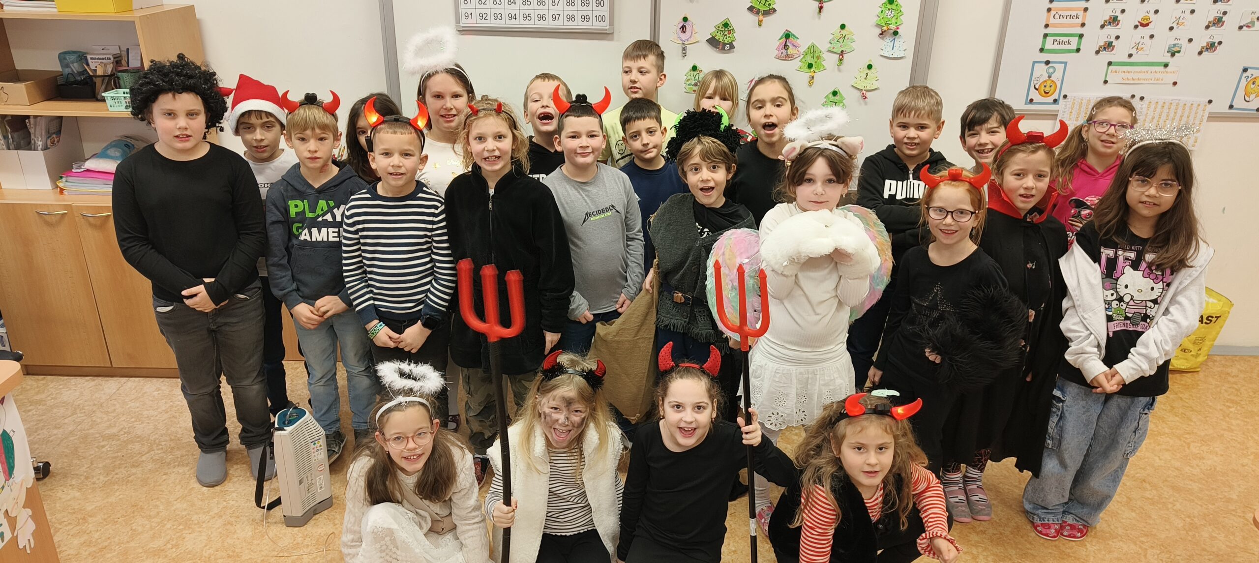 V pátek 5. prosince 2025 zavítal do naší školy Mikuláš se svými pomocníky – anděly a čerty. Mikuláš četl z knihy hříchů i z knihy pochval. Zlobidlům domluvil, hodné děti pochválil. Dokonce jednoho velkého zlobivce čerti na chvíli strčili do pytle a odnesli pryč, ale brzy nám ho vrátili zpět do třídy.