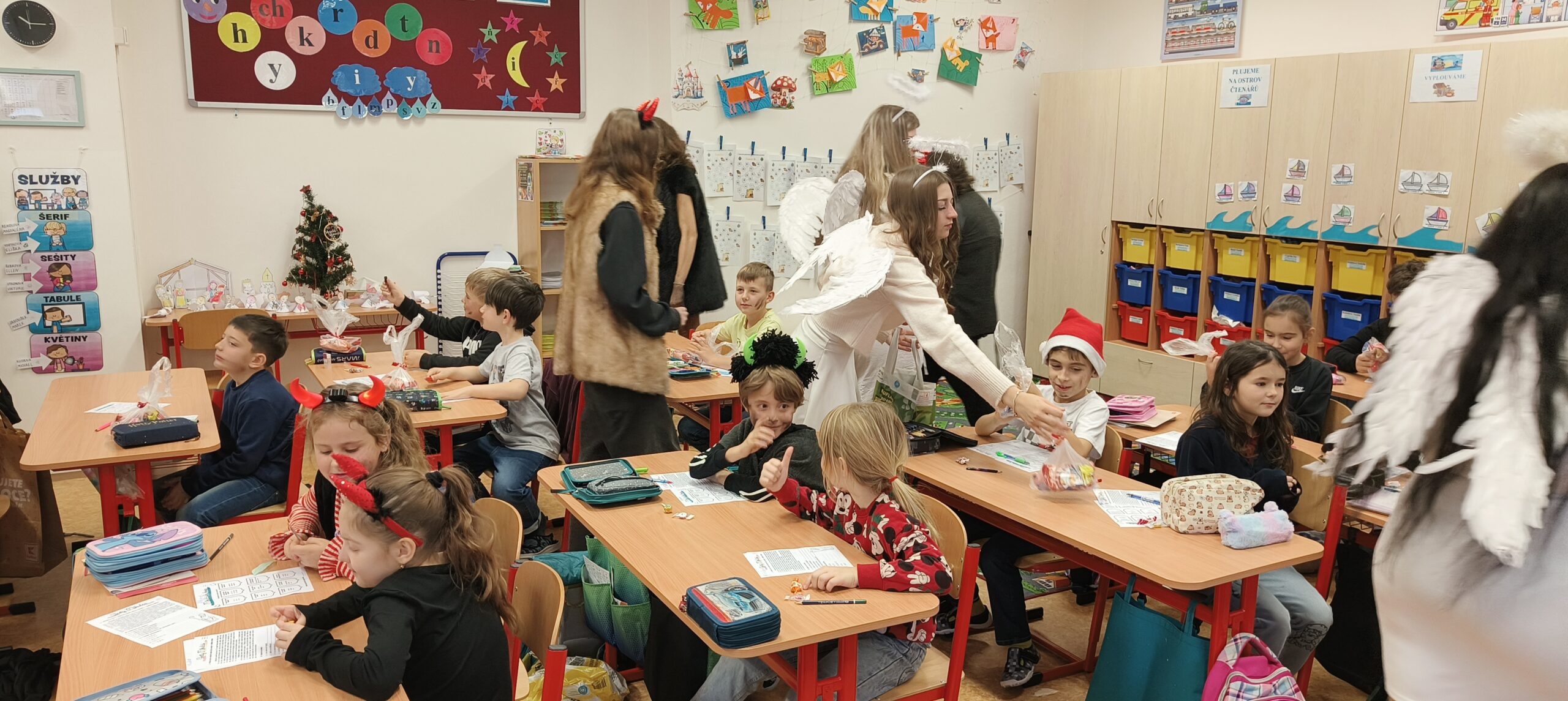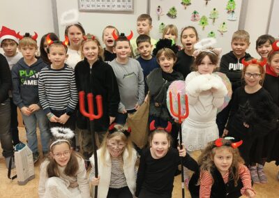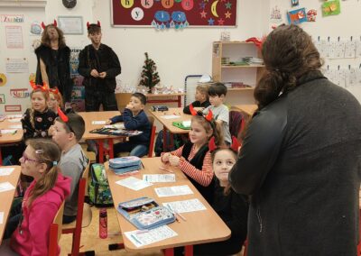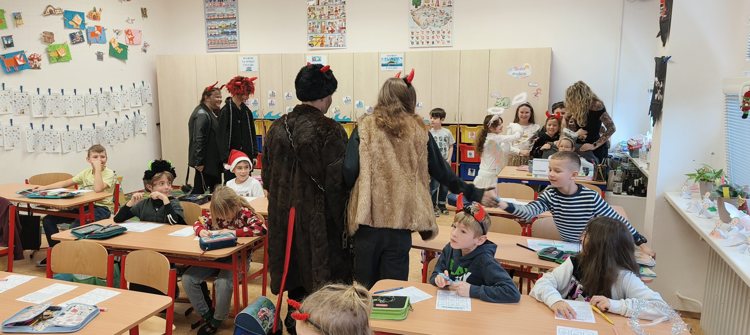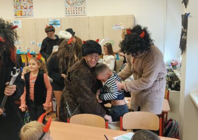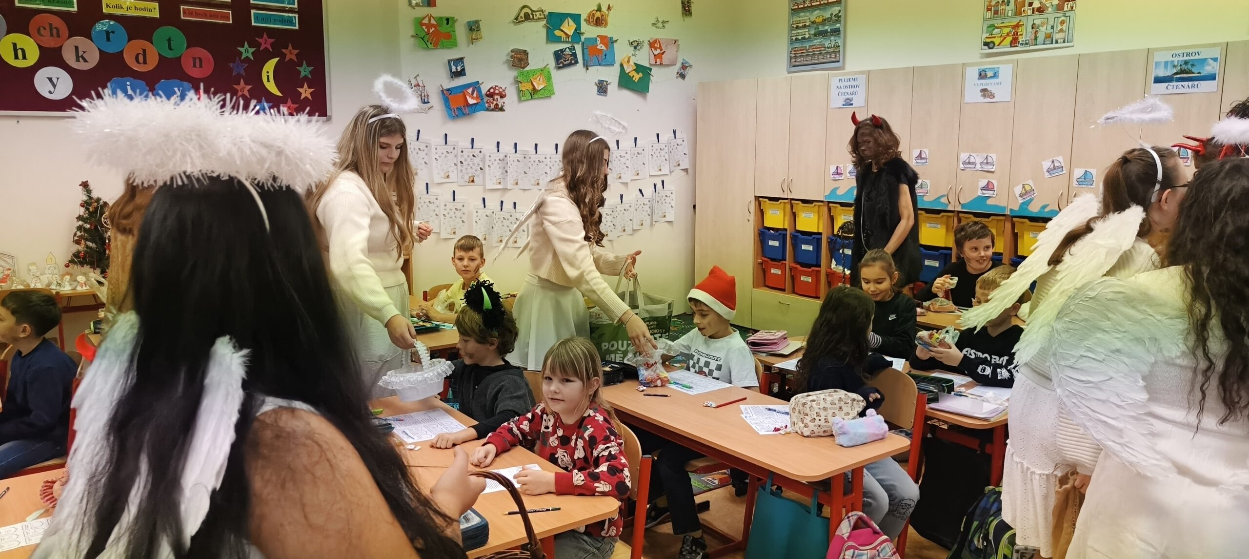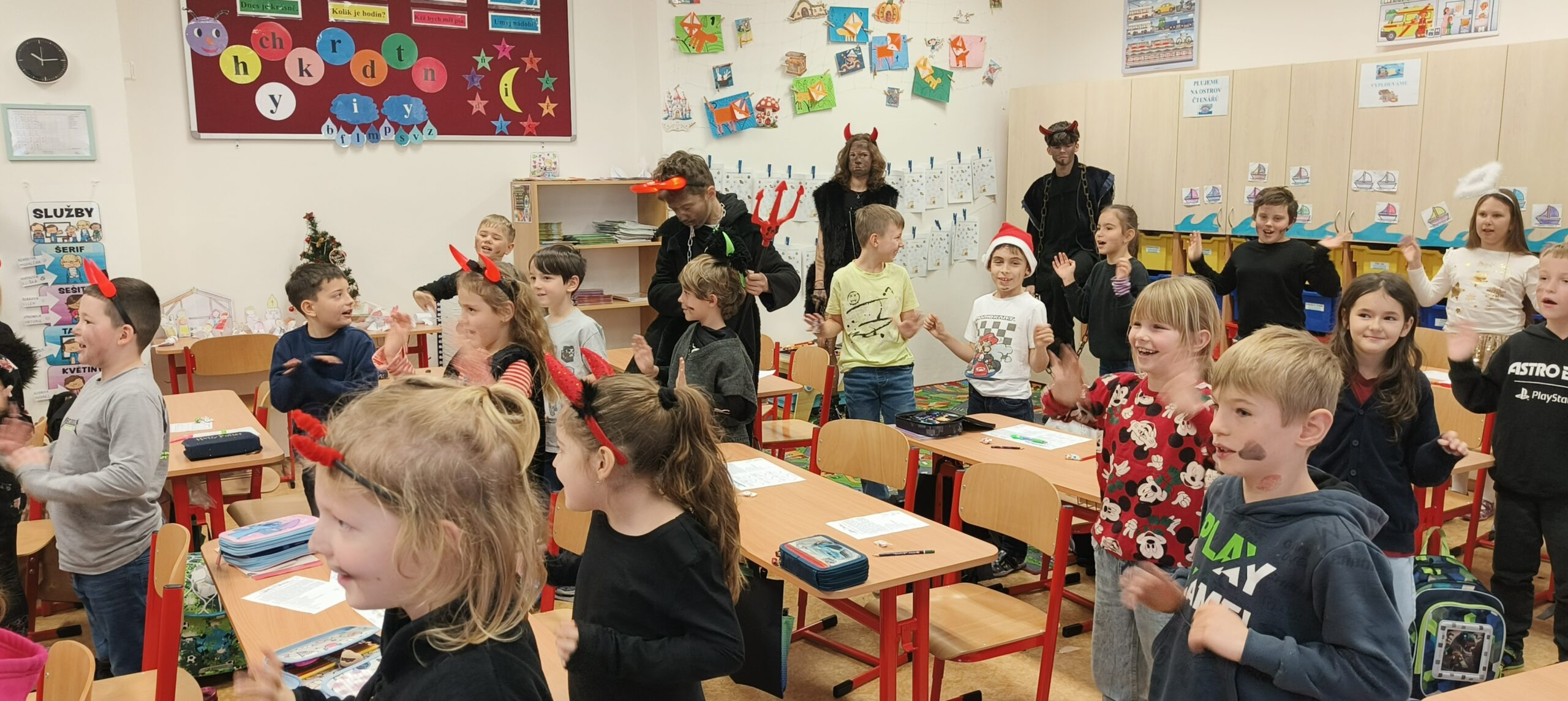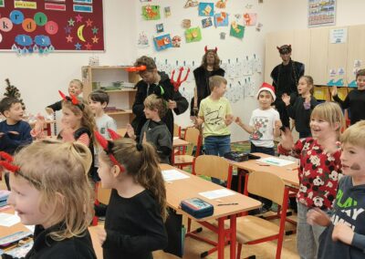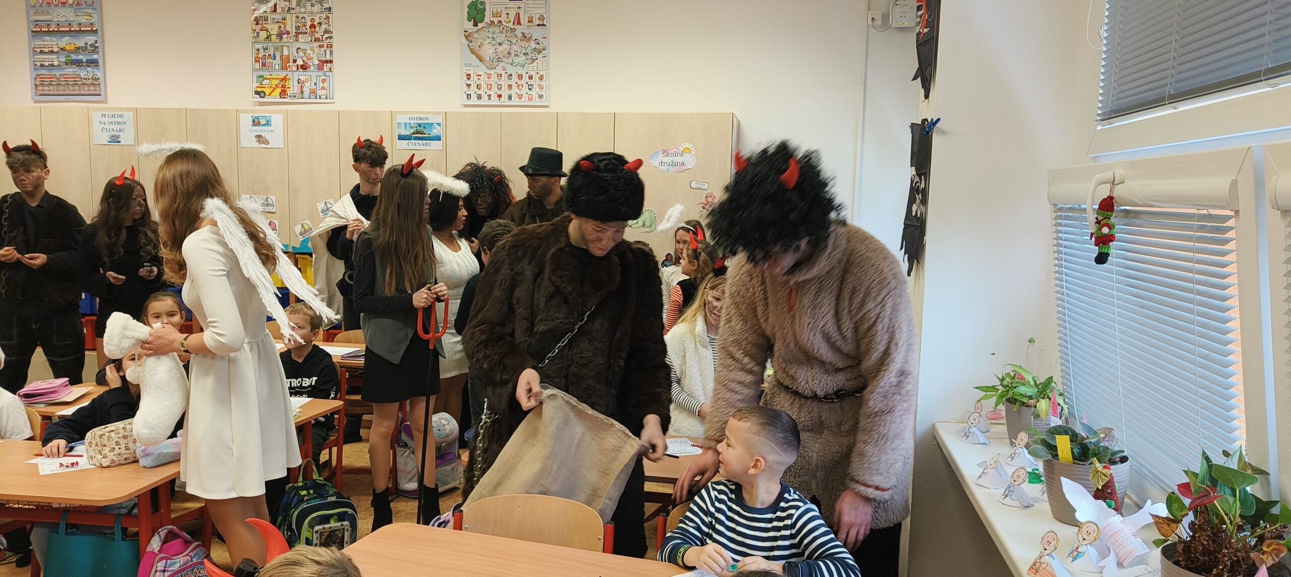 V pátek 5. prosince 2025 zavítal do naší školy Mikuláš se svými pomocníky – anděly a čerty. Mikuláš četl z knihy hříchů i z knihy pochval. Zlobidlům domluvil, hodné děti pochválil. Dokonce jednoho velkého zlobivce čerti na chvíli strčili do pytle a odnesli pryč, ale brzy nám ho vrátili zpět do třídy.