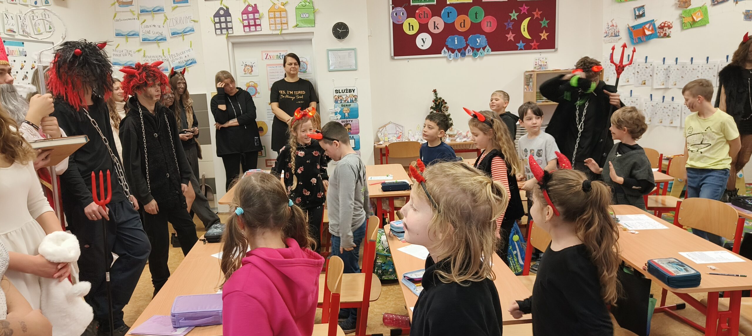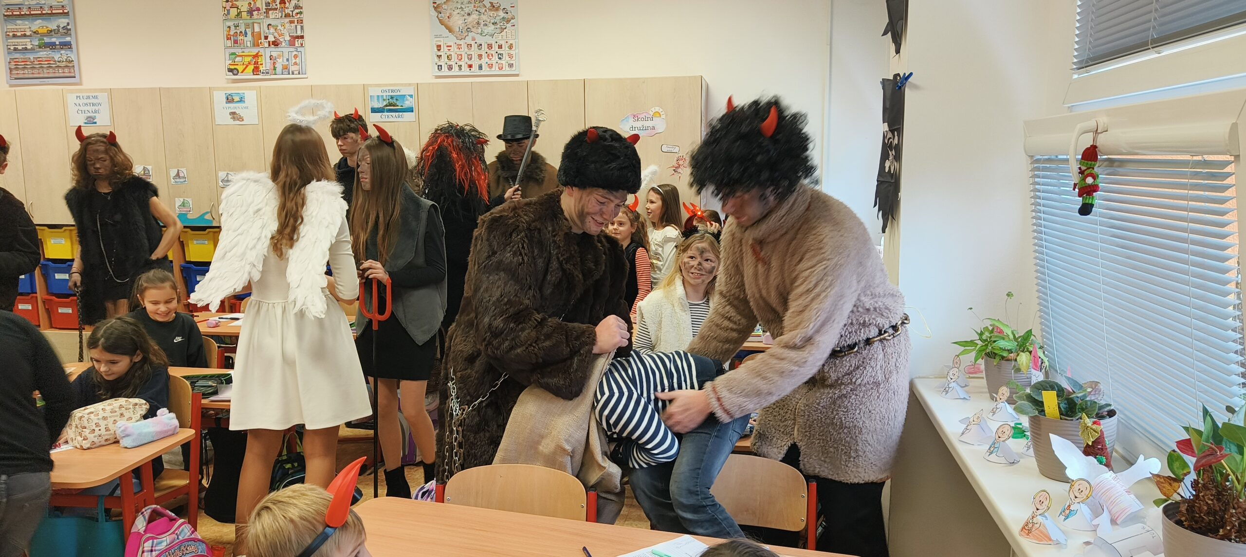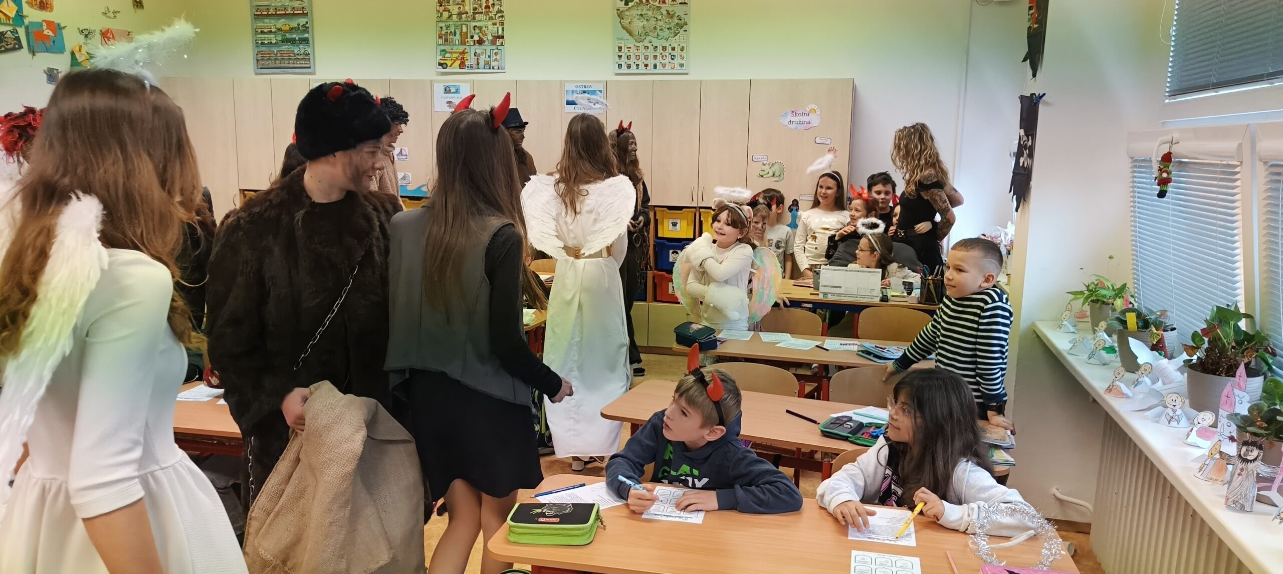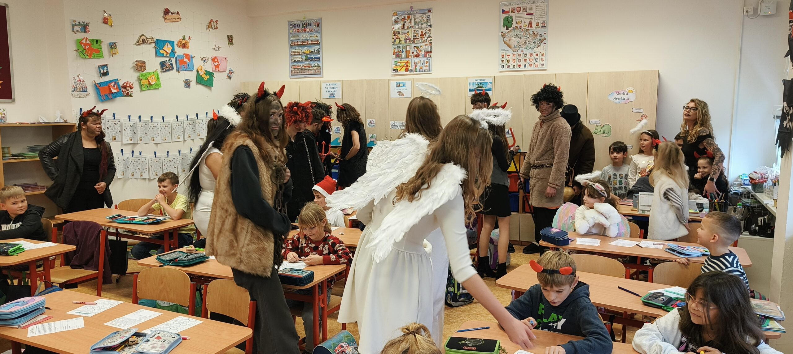 V pátek 5. prosince 2025 zavítal do naší školy Mikuláš se svými pomocníky – anděly a čerty. Mikuláš četl z knihy hříchů i z knihy pochval. Zlobidlům domluvil, hodné děti pochválil. Dokonce jednoho velkého zlobivce čerti na chvíli strčili do pytle a odnesli pryč, ale brzy nám ho vrátili zpět do třídy.