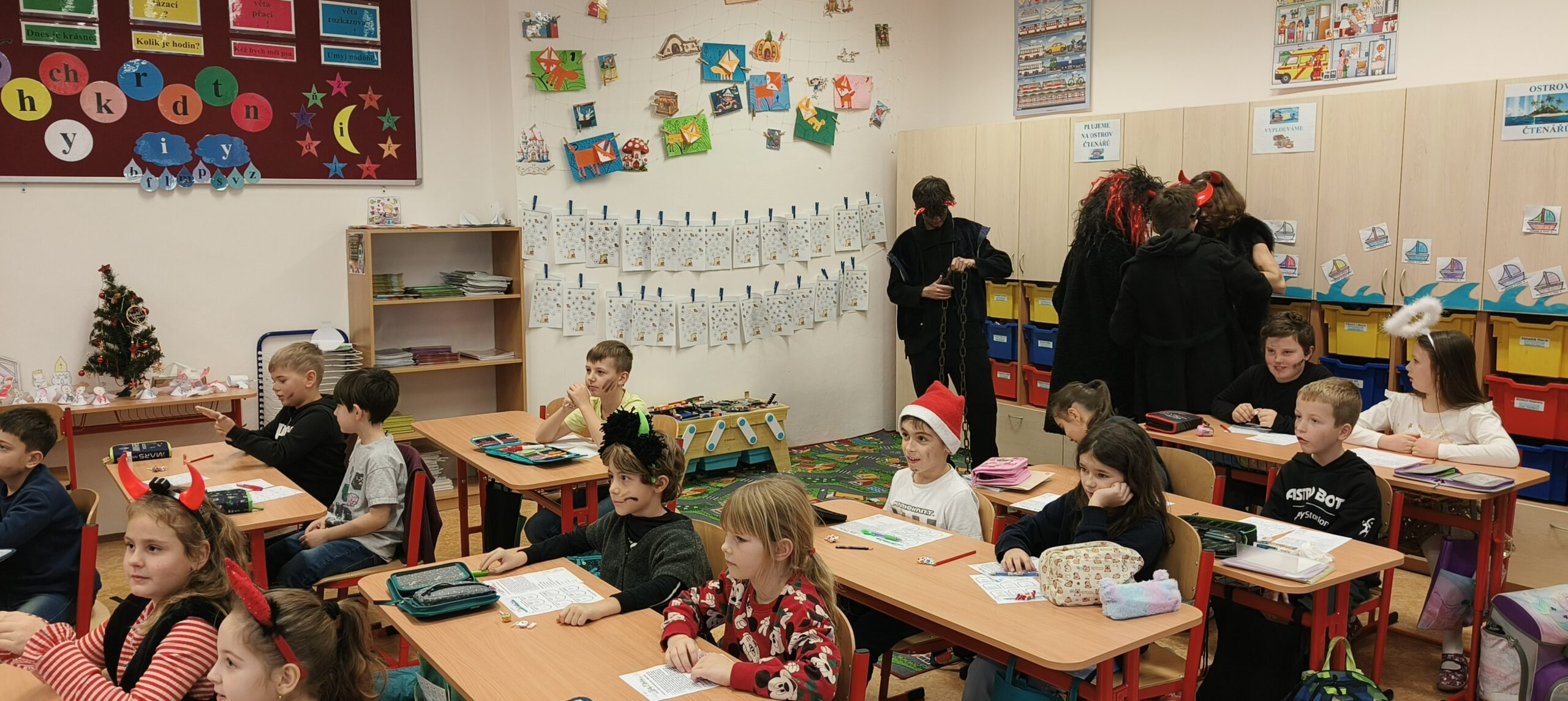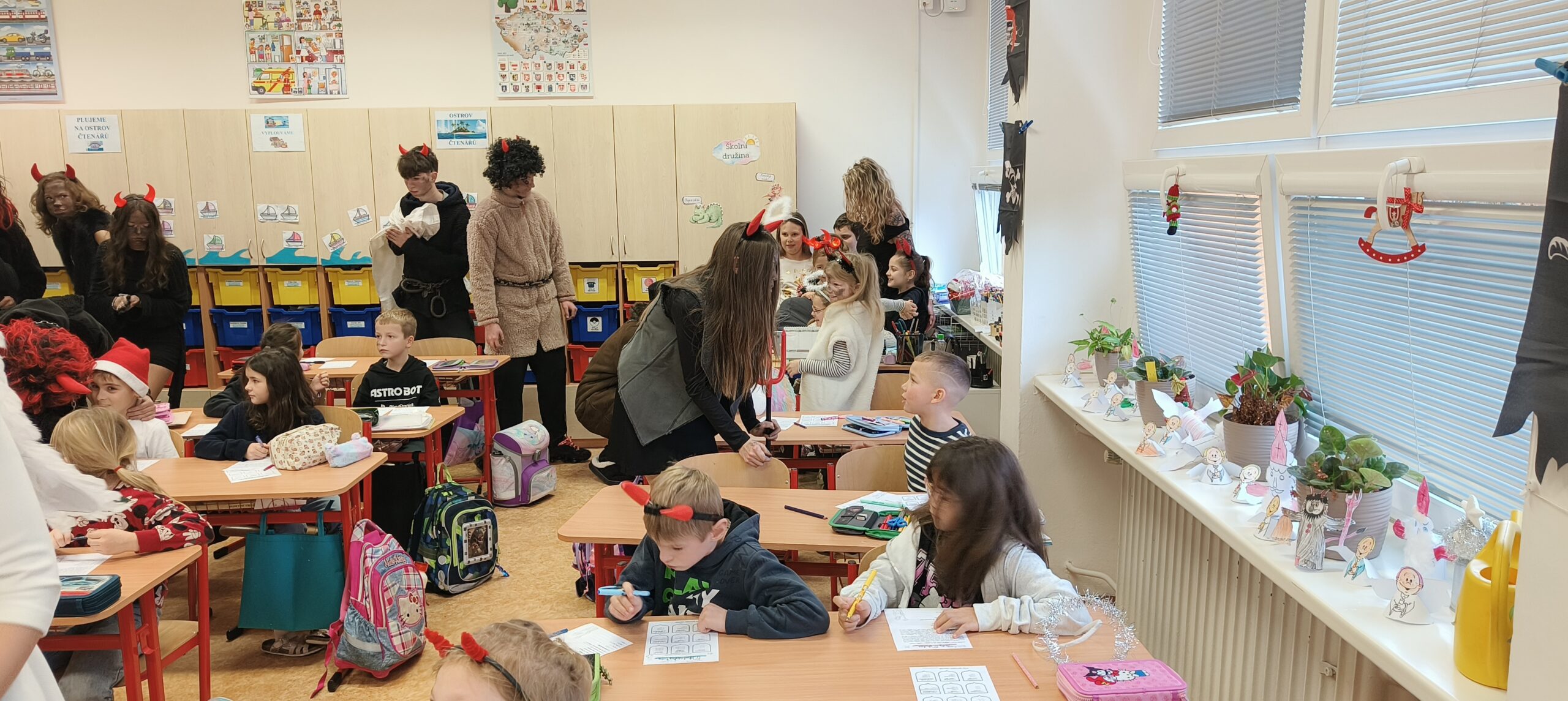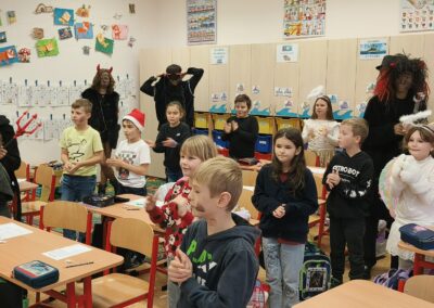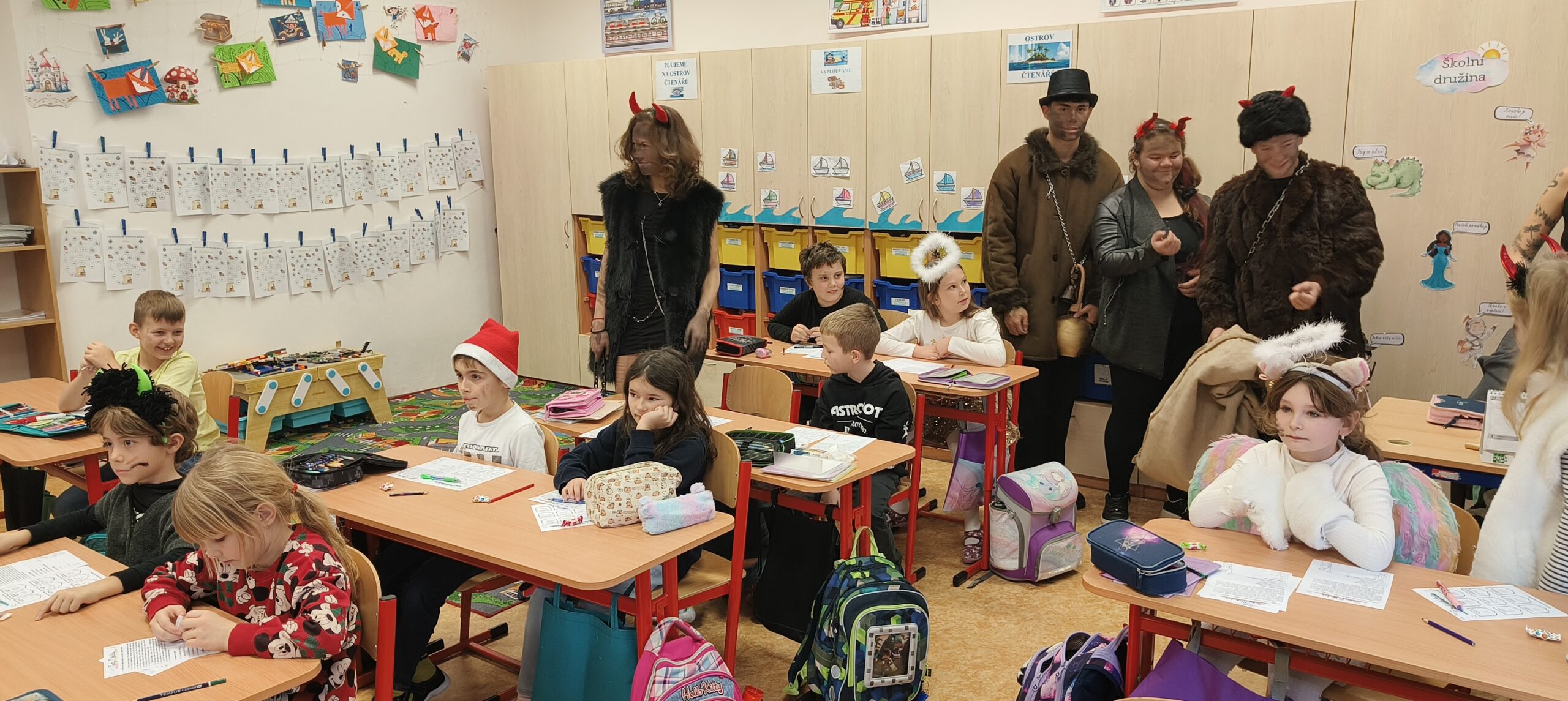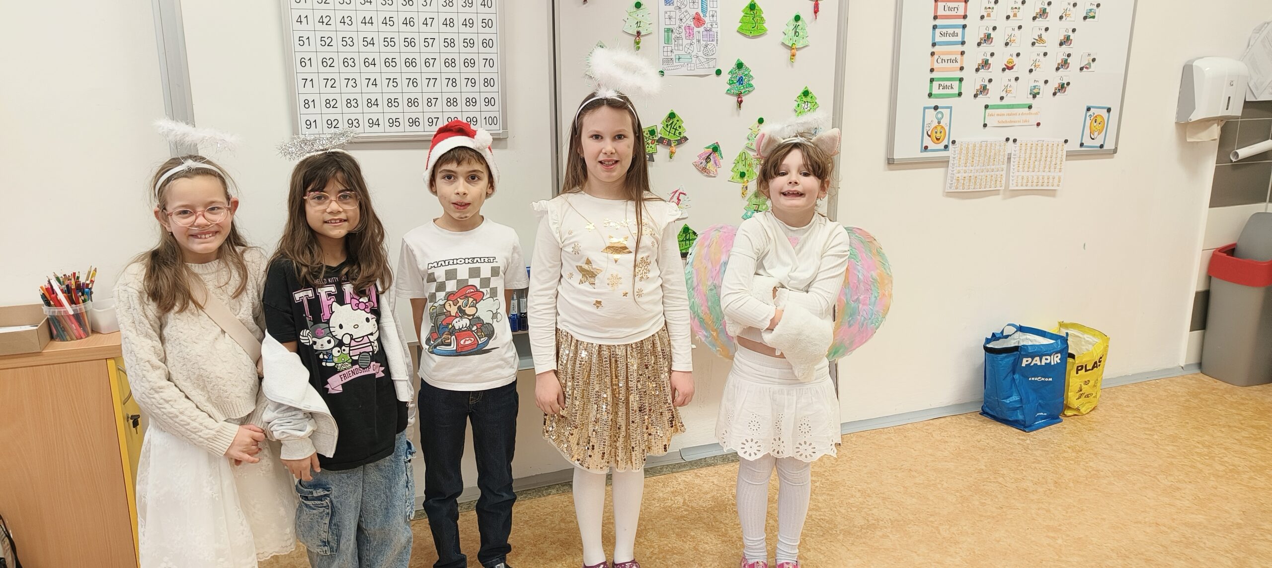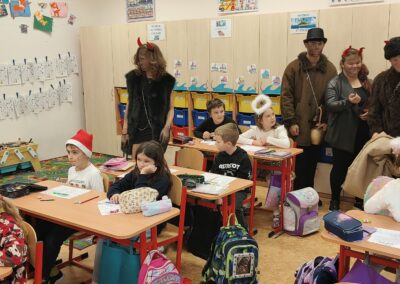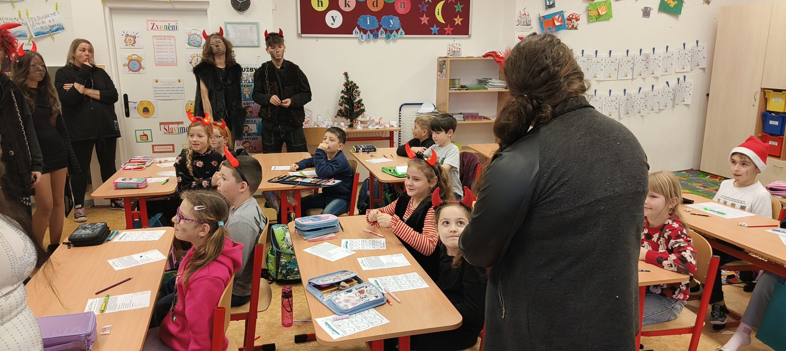 V pátek 5. prosince 2025 zavítal do naší školy Mikuláš se svými pomocníky – anděly a čerty. Mikuláš četl z knihy hříchů i z knihy pochval. Zlobidlům domluvil, hodné děti pochválil. Dokonce jednoho velkého zlobivce čerti na chvíli strčili do pytle a odnesli pryč, ale brzy nám ho vrátili zpět do třídy.