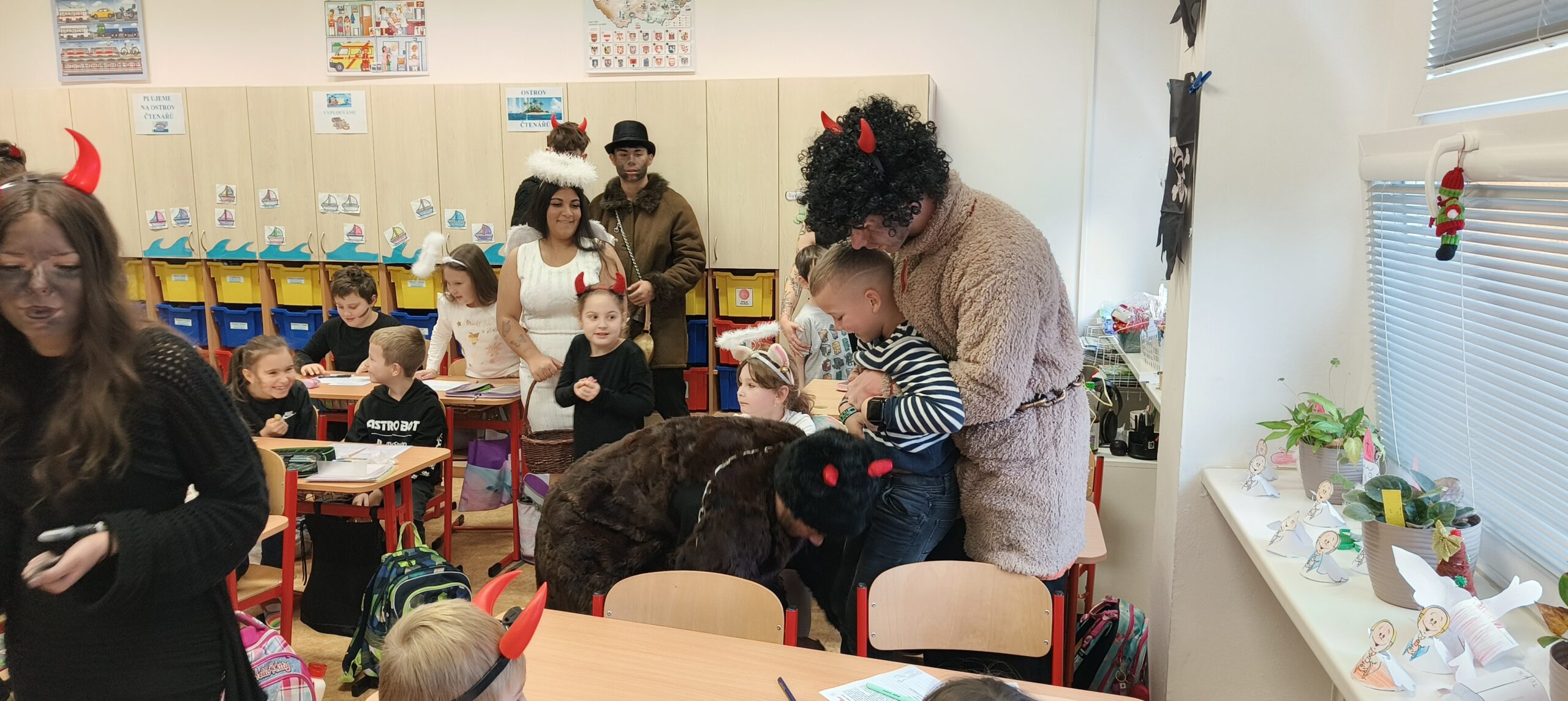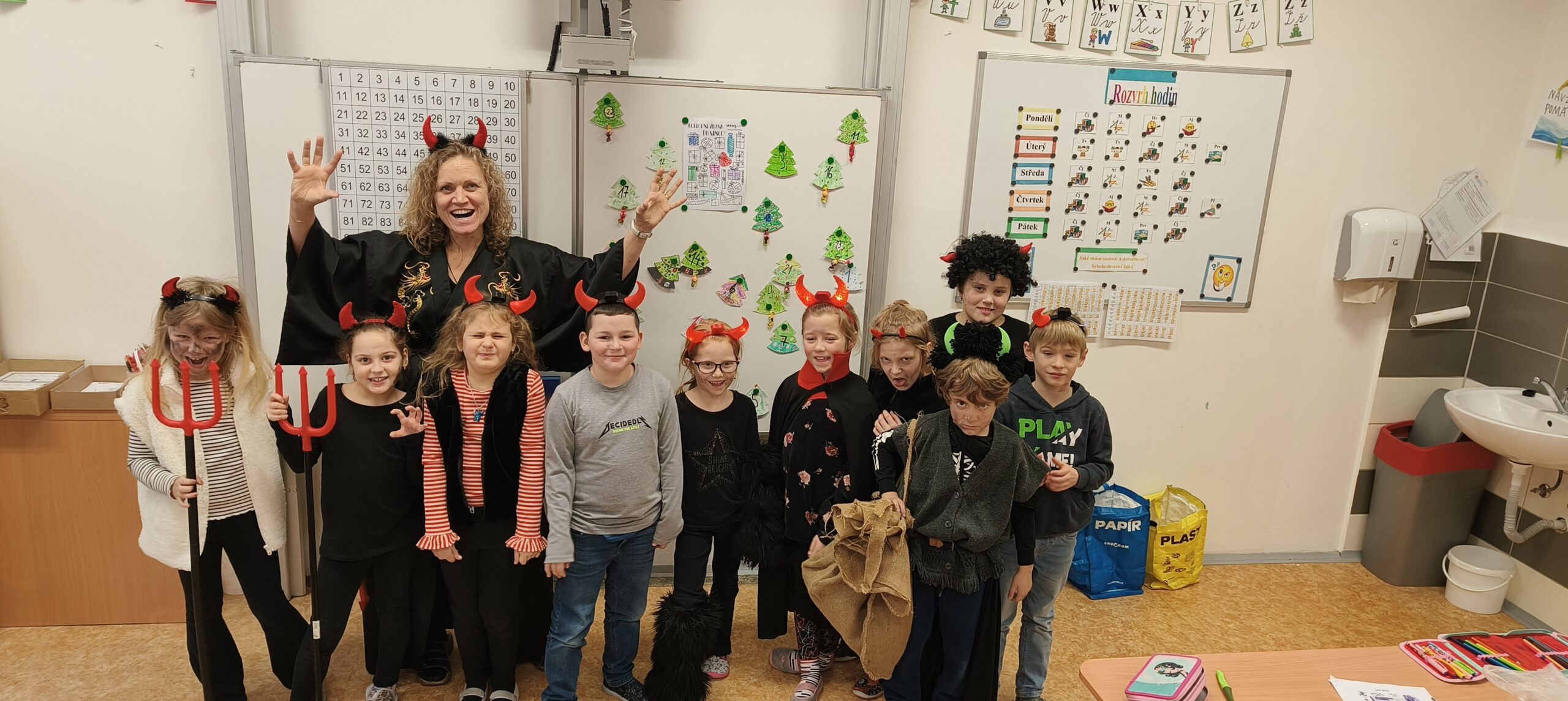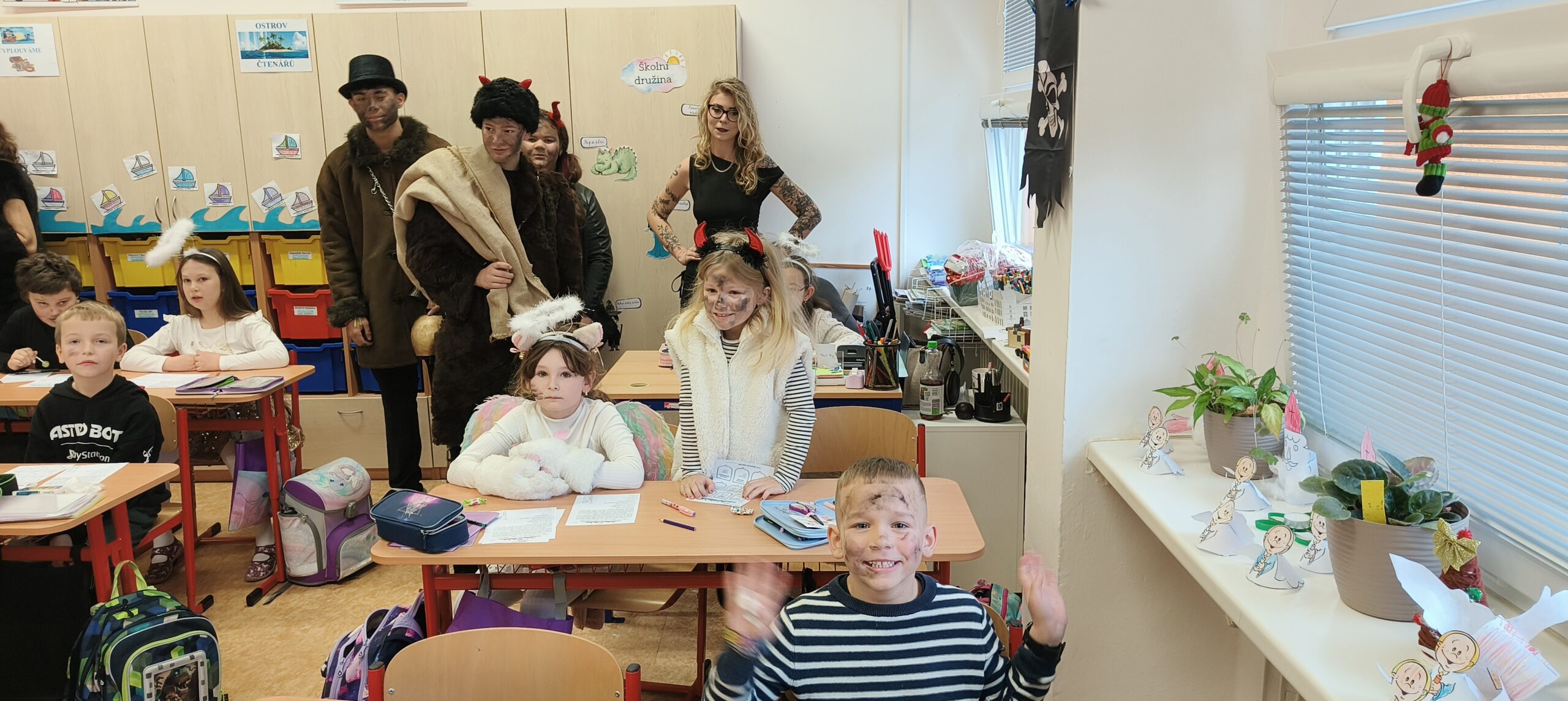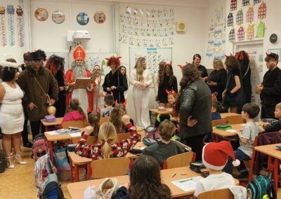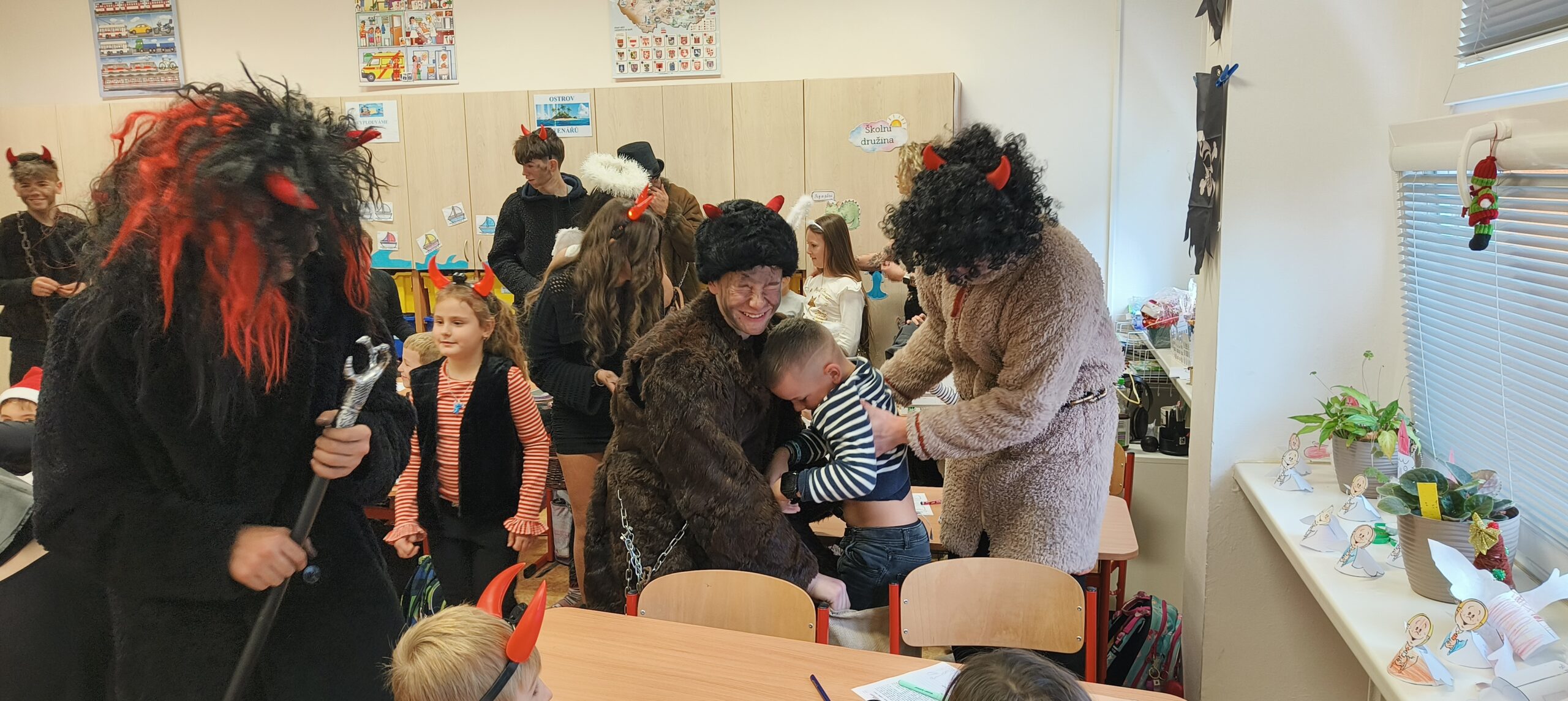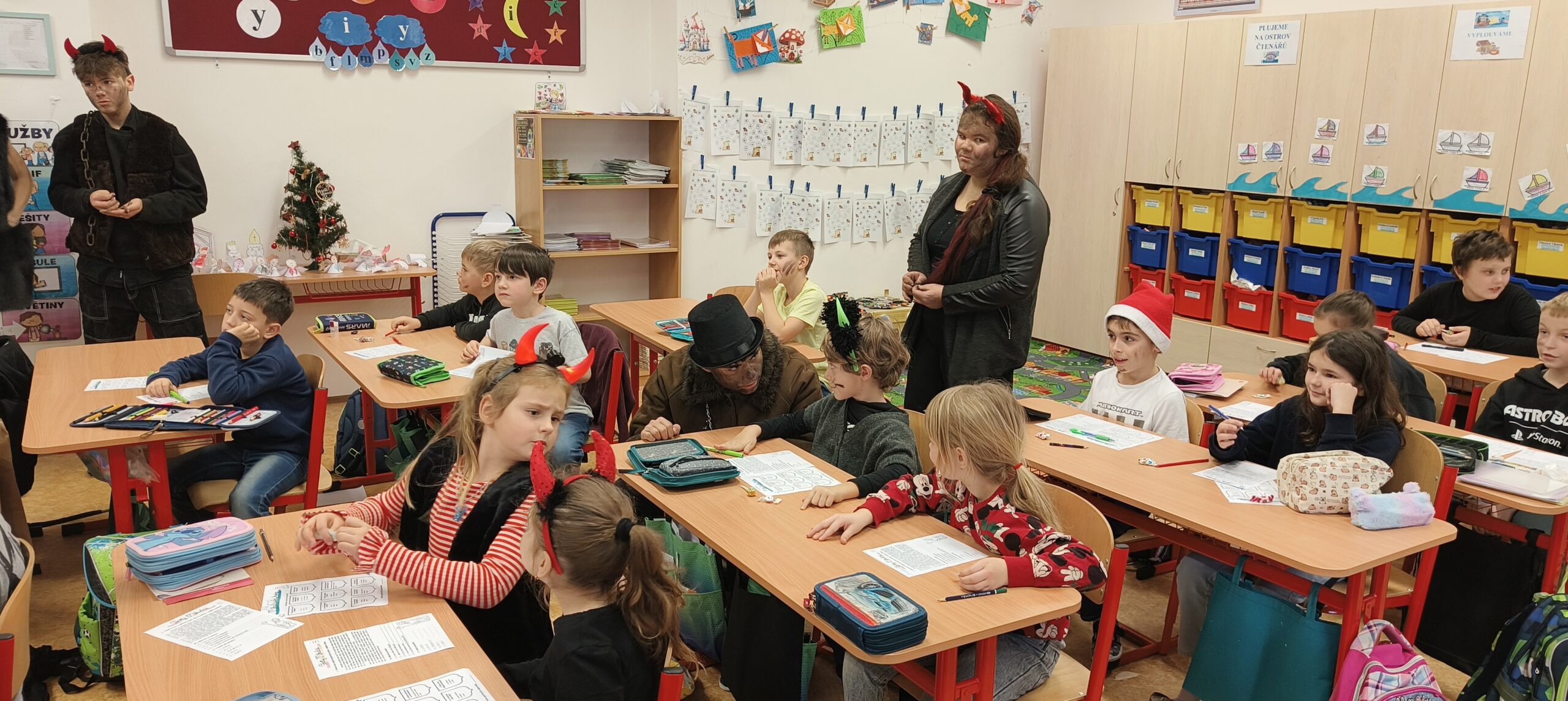 V pátek 5. prosince 2025 zavítal do naší školy Mikuláš se svými pomocníky – anděly a čerty. Mikuláš četl z knihy hříchů i z knihy pochval. Zlobidlům domluvil, hodné děti pochválil. Dokonce jednoho velkého zlobivce čerti na chvíli strčili do pytle a odnesli pryč, ale brzy nám ho vrátili zpět do třídy.
