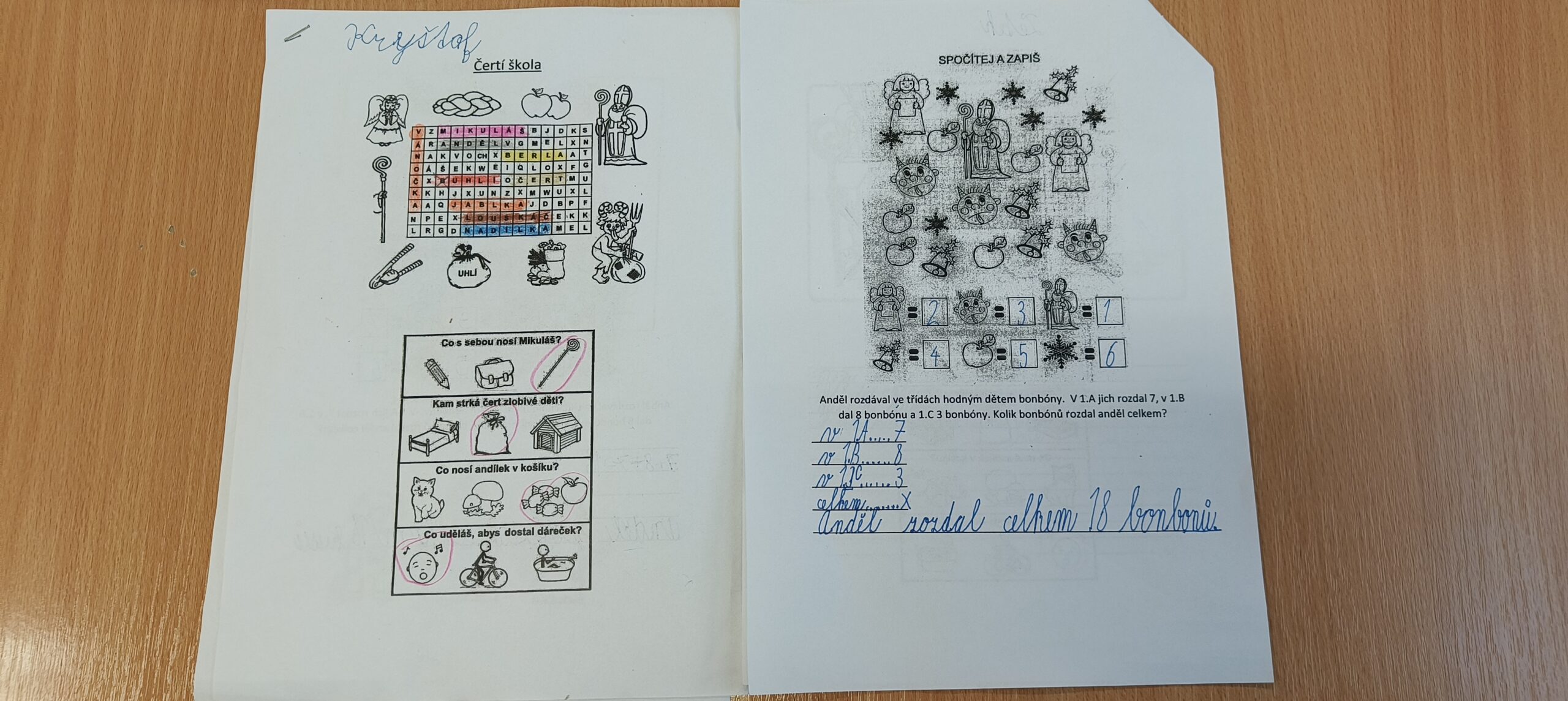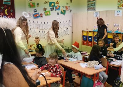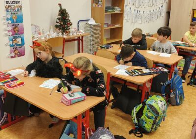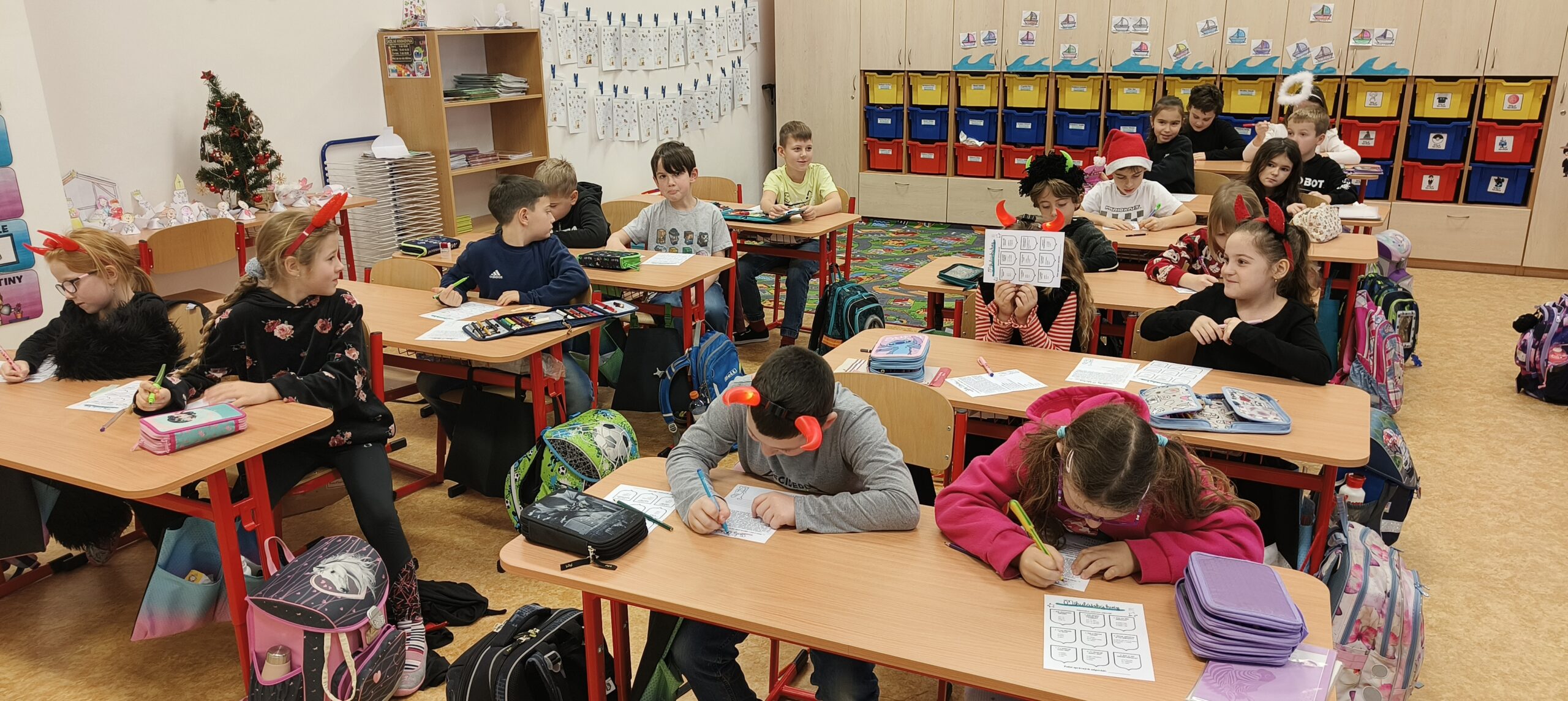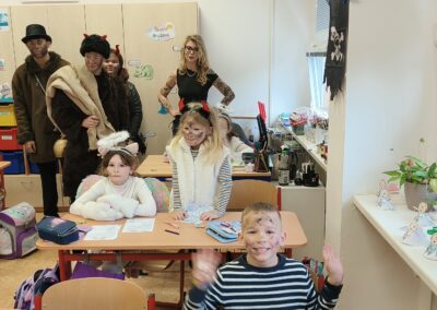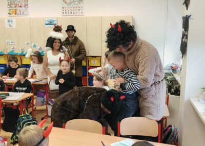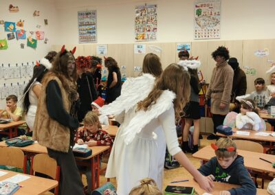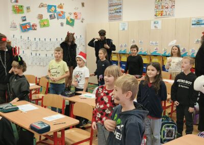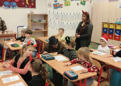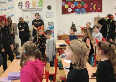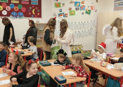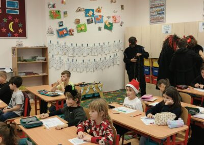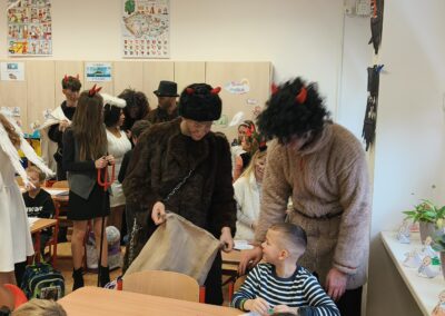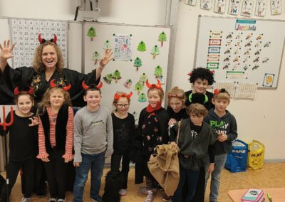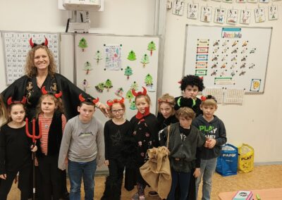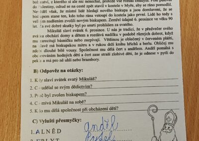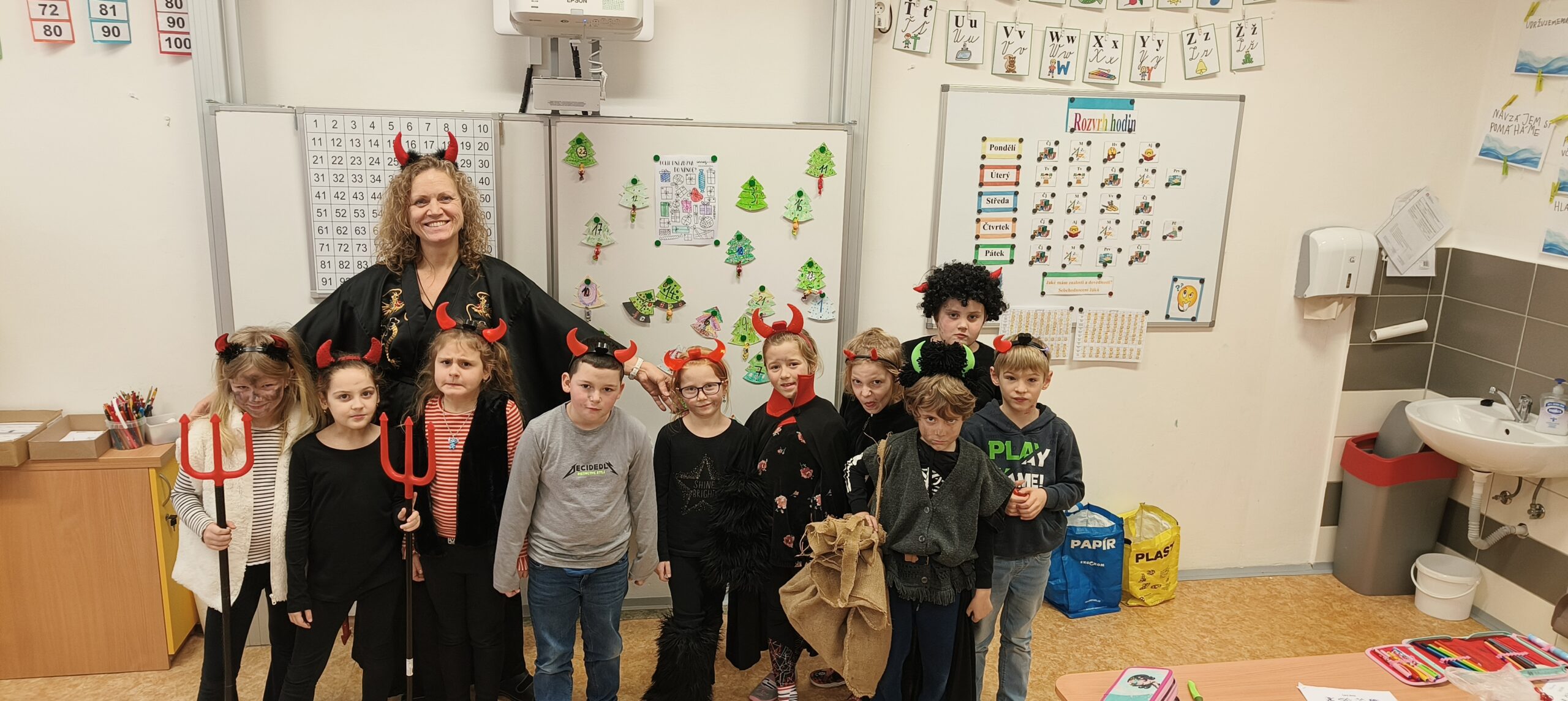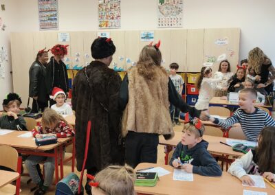 V pátek 5. prosince 2025 zavítal do naší školy Mikuláš se svými pomocníky – anděly a čerty. Mikuláš četl z knihy hříchů i z knihy pochval. Zlobidlům domluvil, hodné děti pochválil. Dokonce jednoho velkého zlobivce čerti na chvíli strčili do pytle a odnesli pryč, ale brzy nám ho vrátili zpět do třídy.