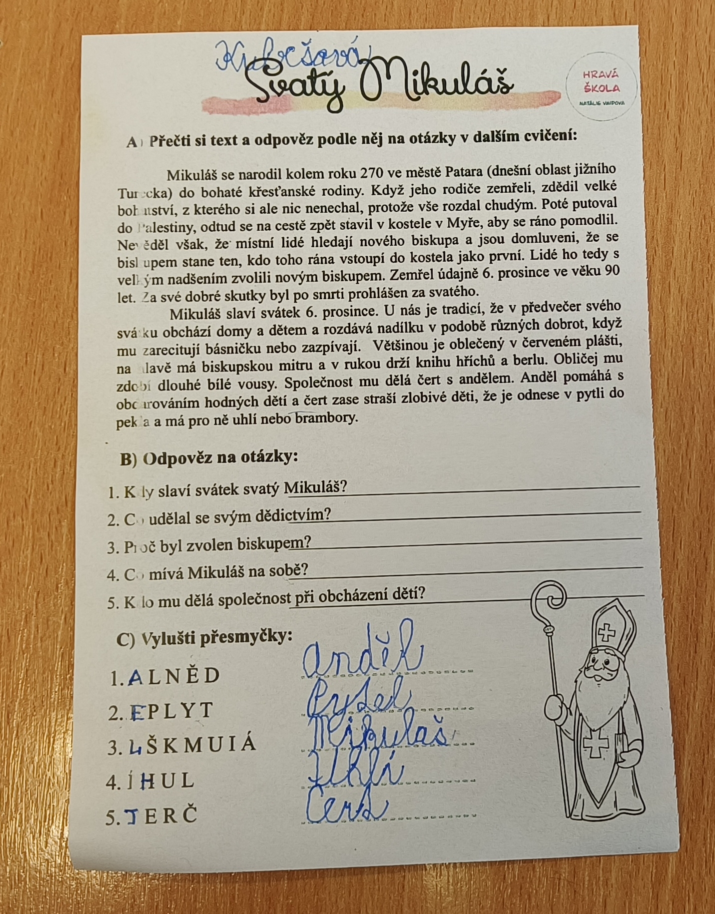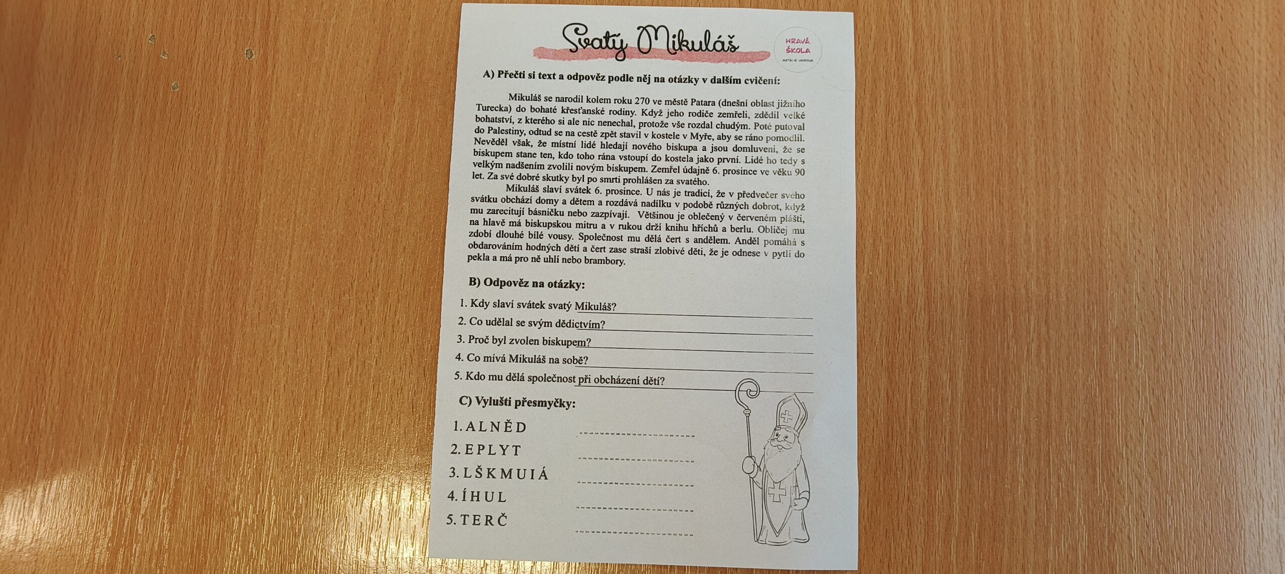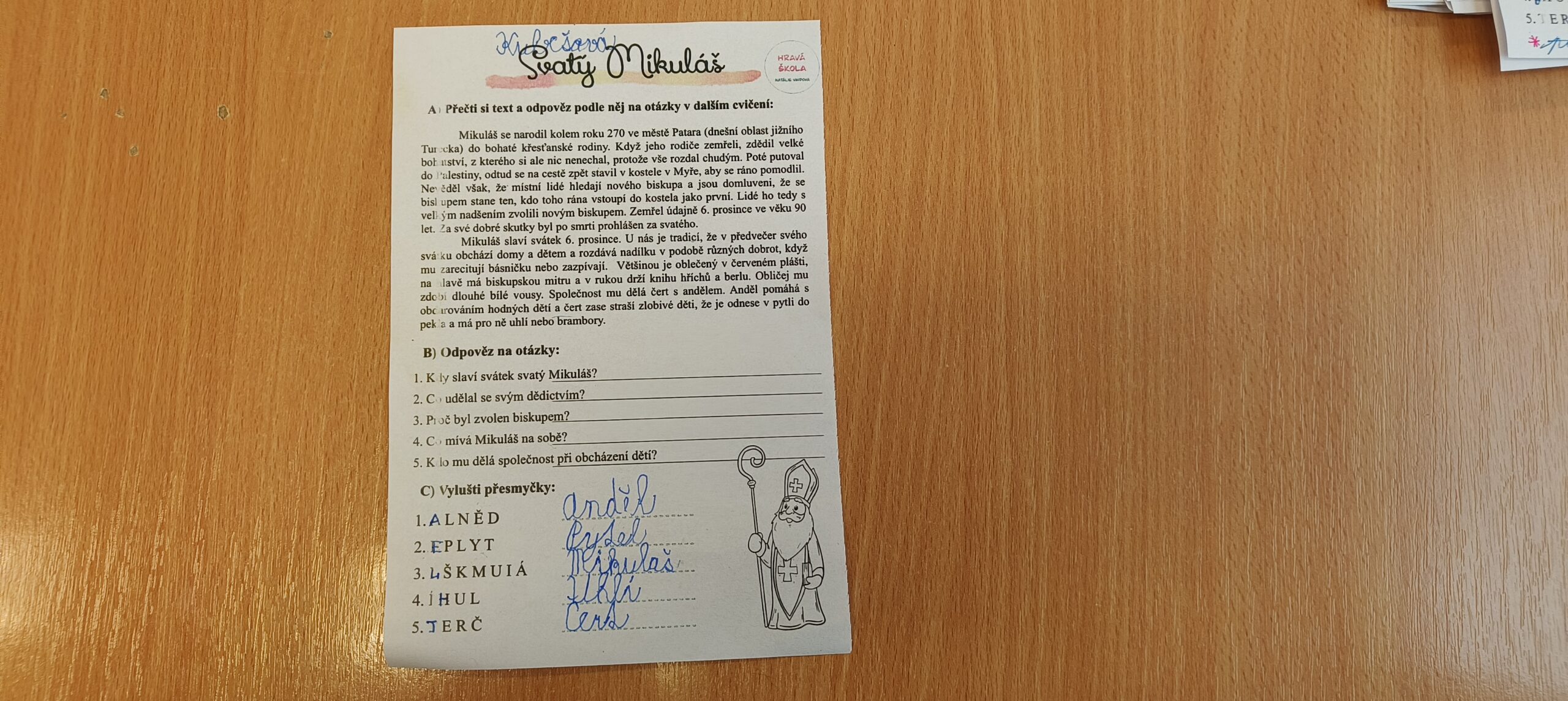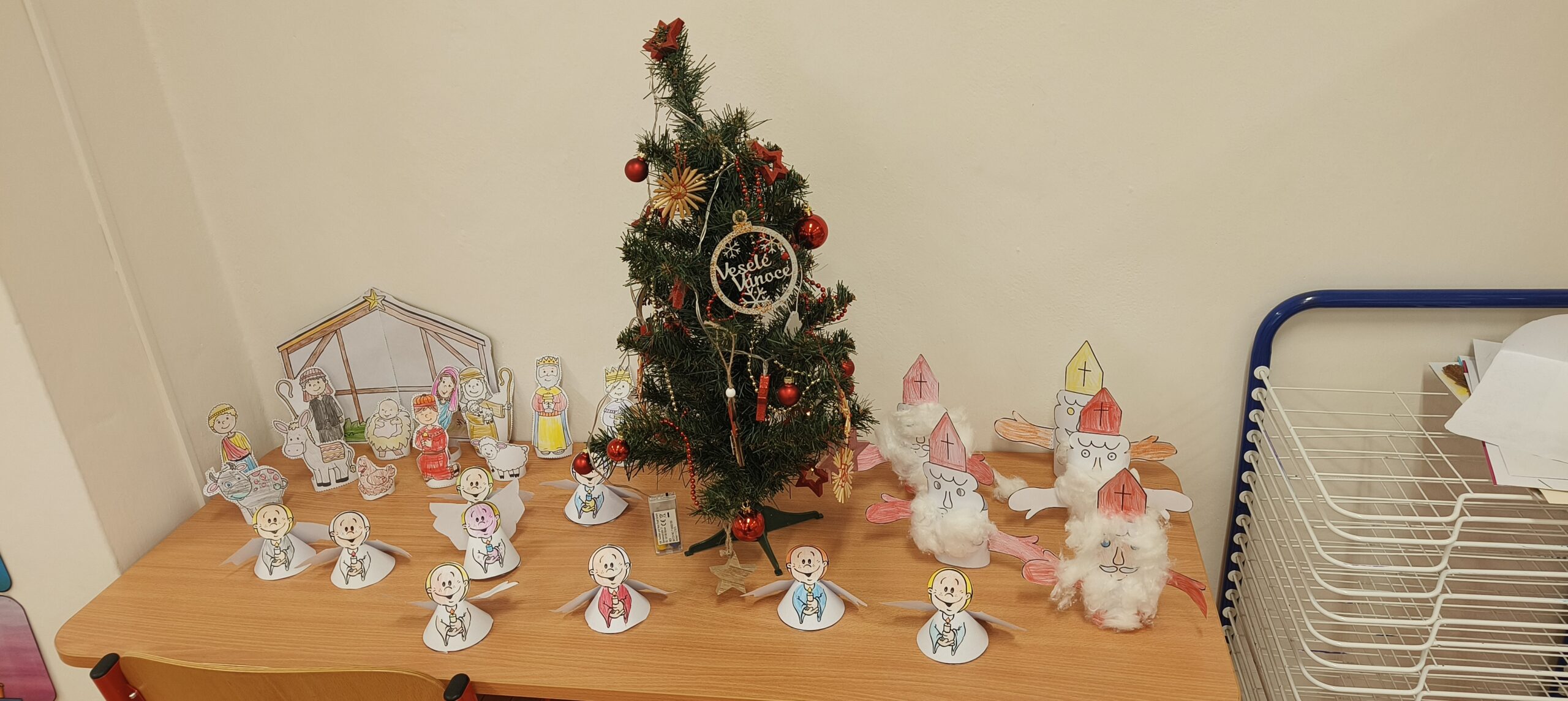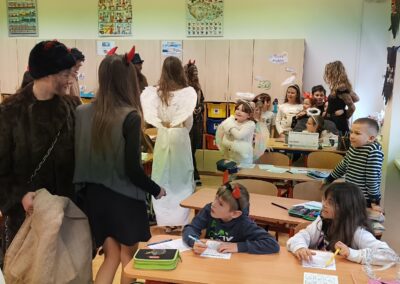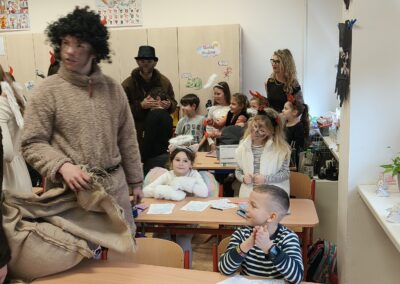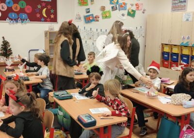 V pátek 5. prosince 2025 zavítal do naší školy Mikuláš se svými pomocníky – anděly a čerty. Mikuláš četl z knihy hříchů i z knihy pochval. Zlobidlům domluvil, hodné děti pochválil. Dokonce jednoho velkého zlobivce čerti na chvíli strčili do pytle a odnesli pryč, ale brzy nám ho vrátili zpět do třídy.