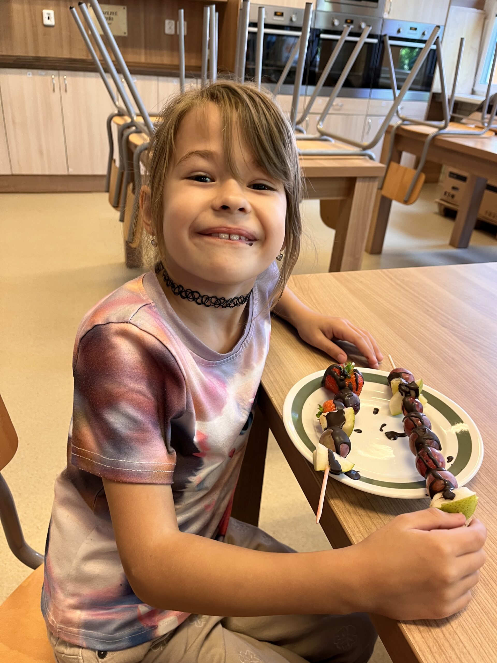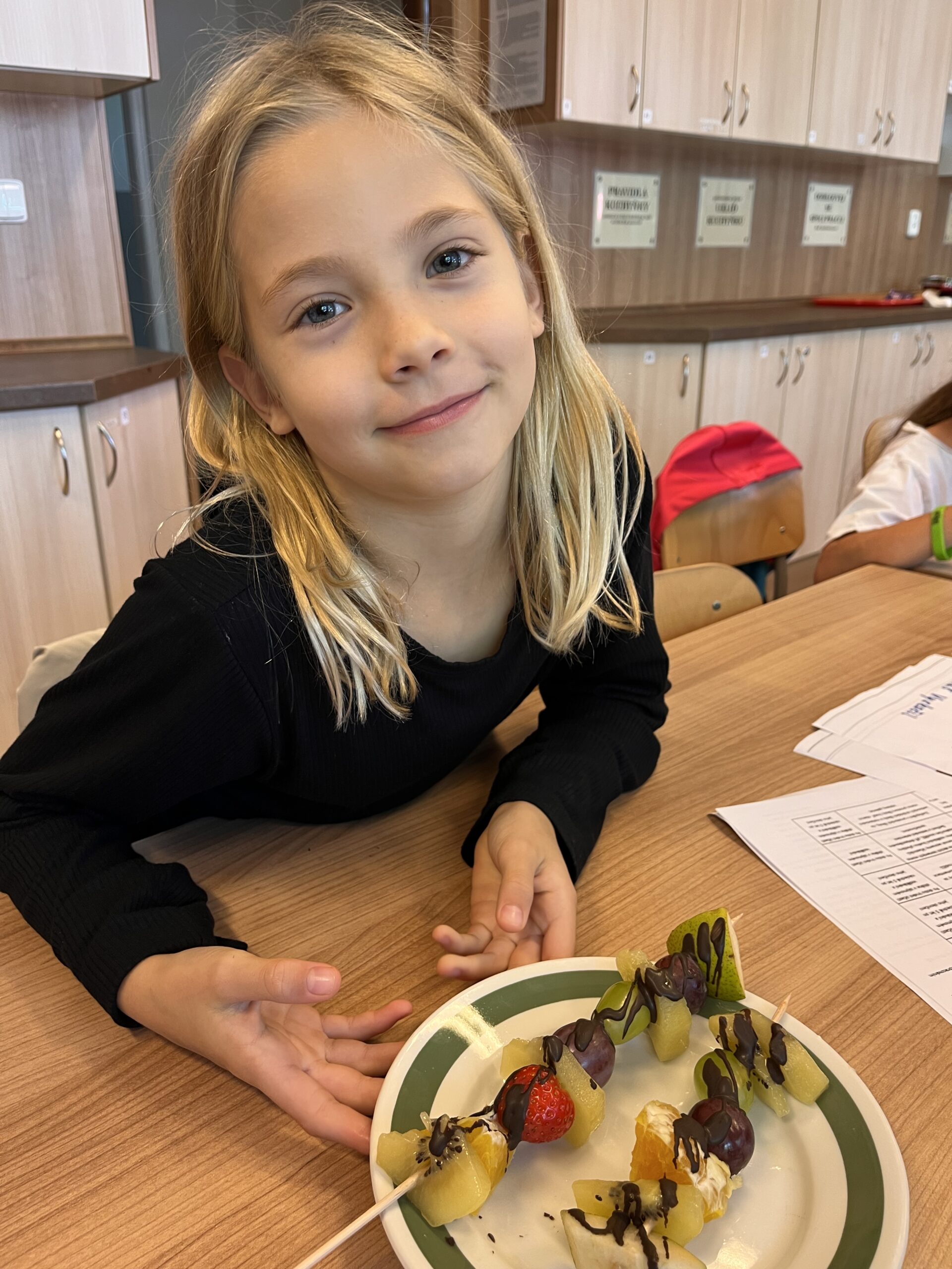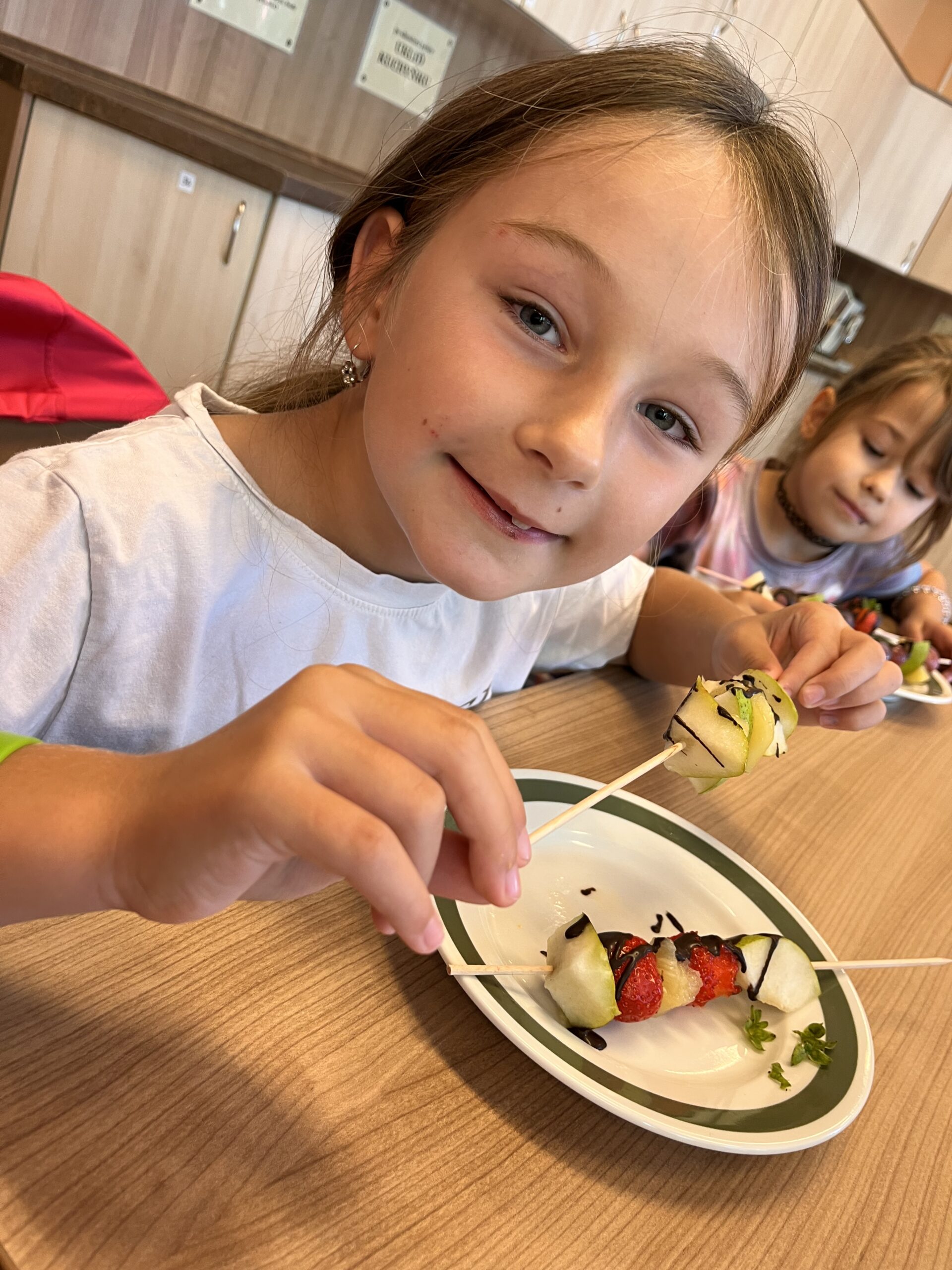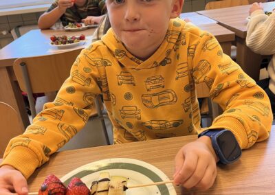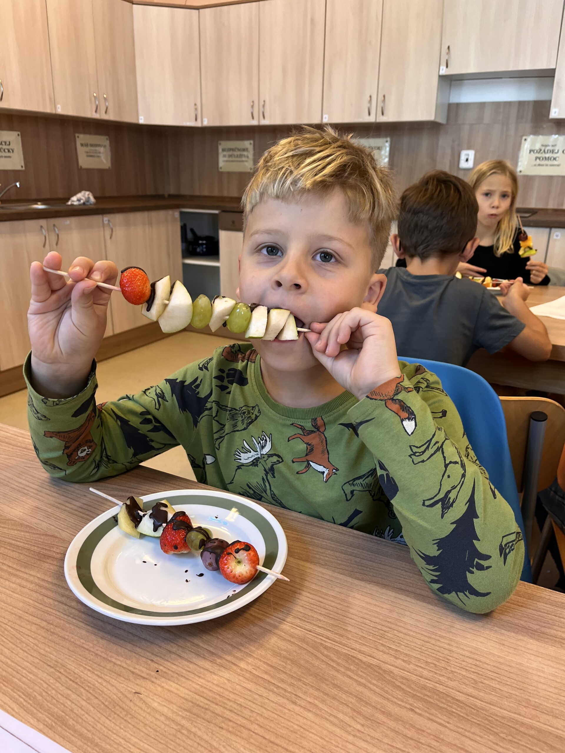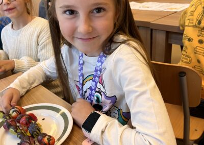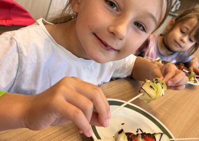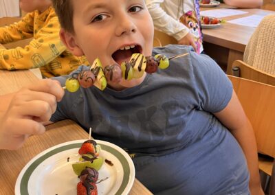 Hned při první hodině byla nálada skvělá a práce dětem šla od ruky. Na menu byly barevné ovocné špízy, které si děti samy připravily a nakonec ozdobily rozpuštěnou čokoládou. Nejen, že si při tom procvičily zručnost a fantazii, ale také si společně pochutnaly na zdravé i sladké dobrotě.