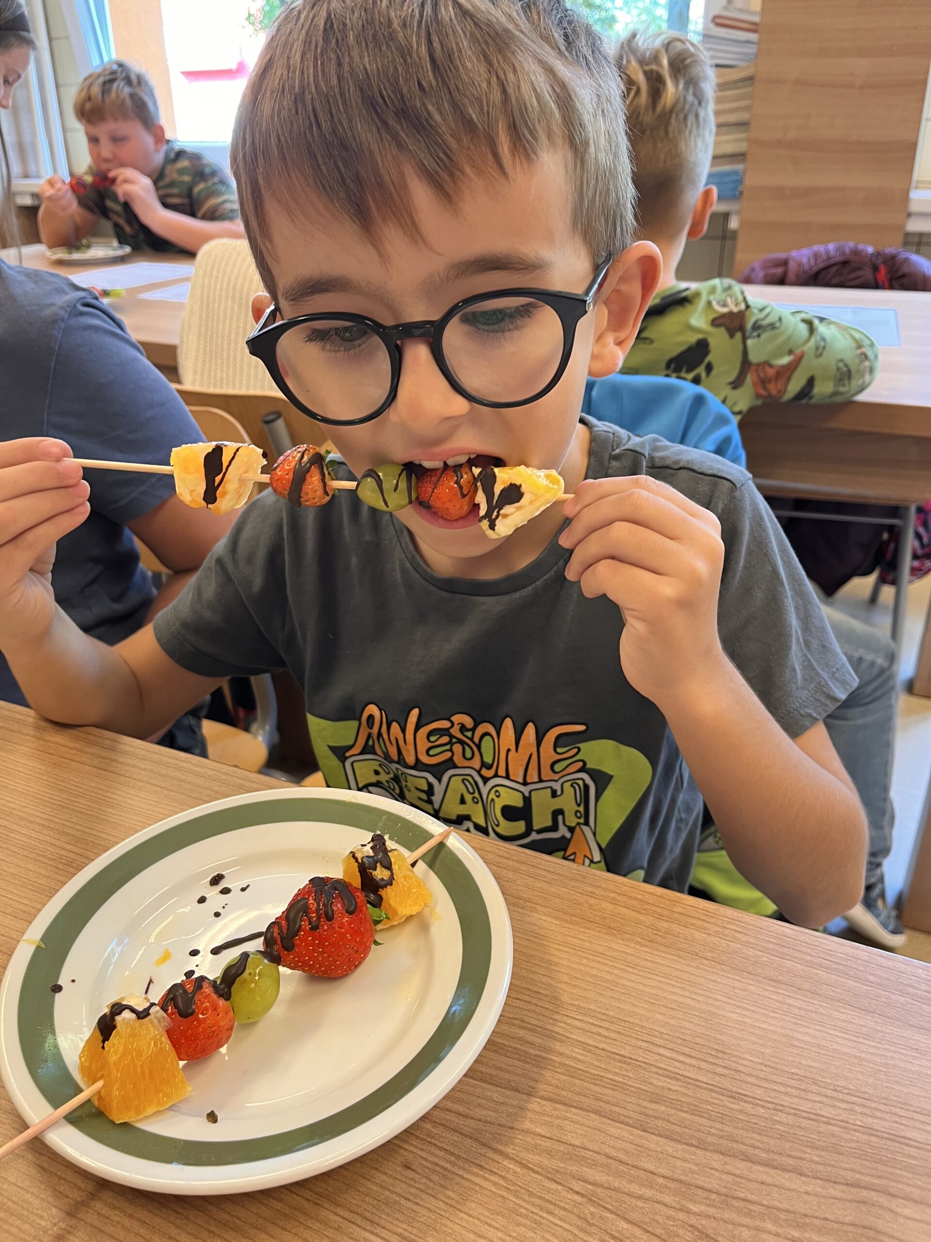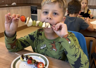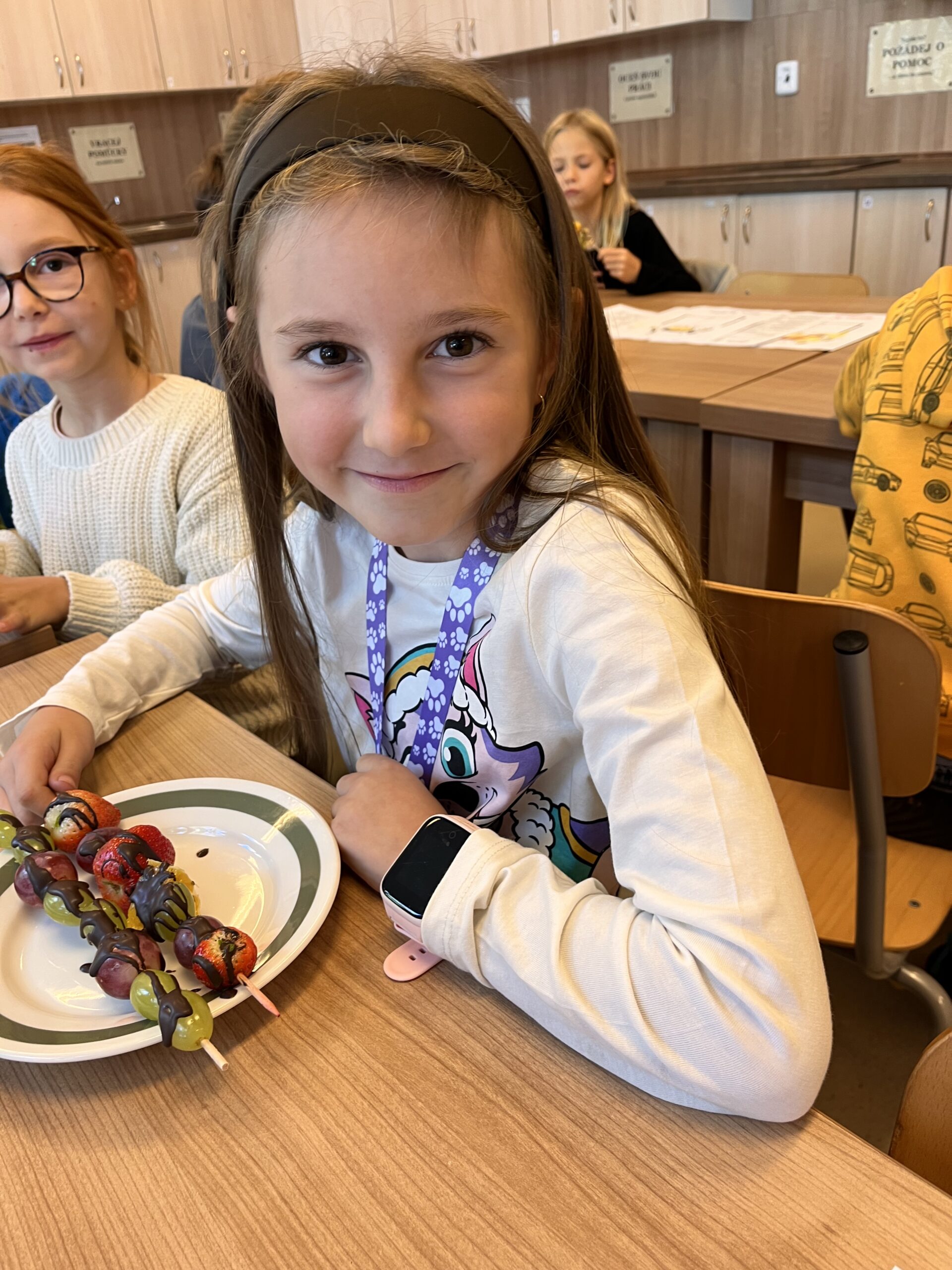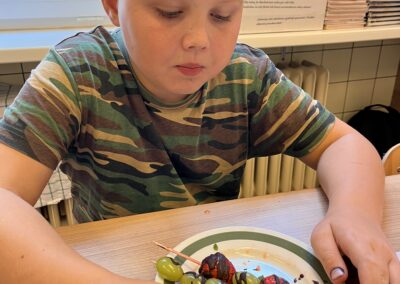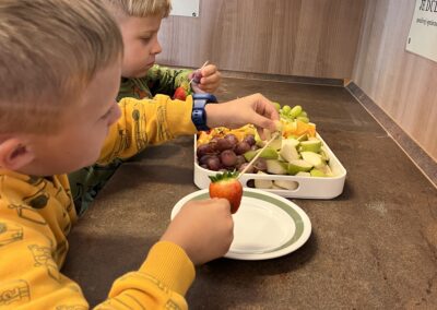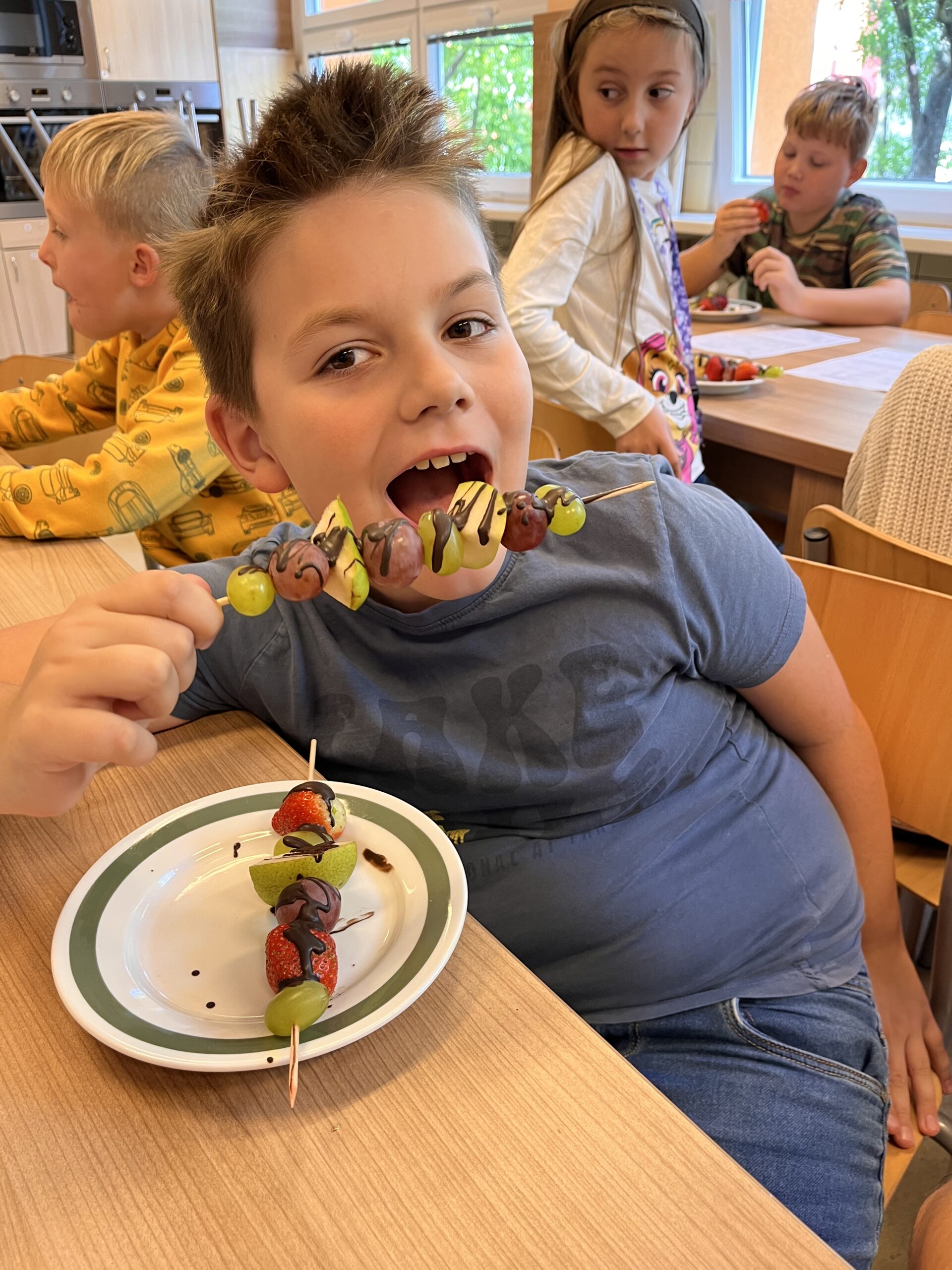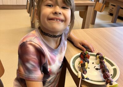 Hned při první hodině byla nálada skvělá a práce dětem šla od ruky. Na menu byly barevné ovocné špízy, které si děti samy připravily a nakonec ozdobily rozpuštěnou čokoládou. Nejen, že si při tom procvičily zručnost a fantazii, ale také si společně pochutnaly na zdravé i sladké dobrotě.