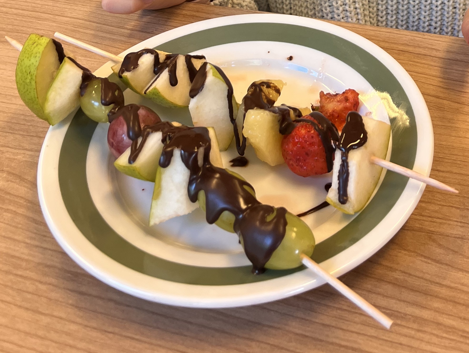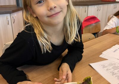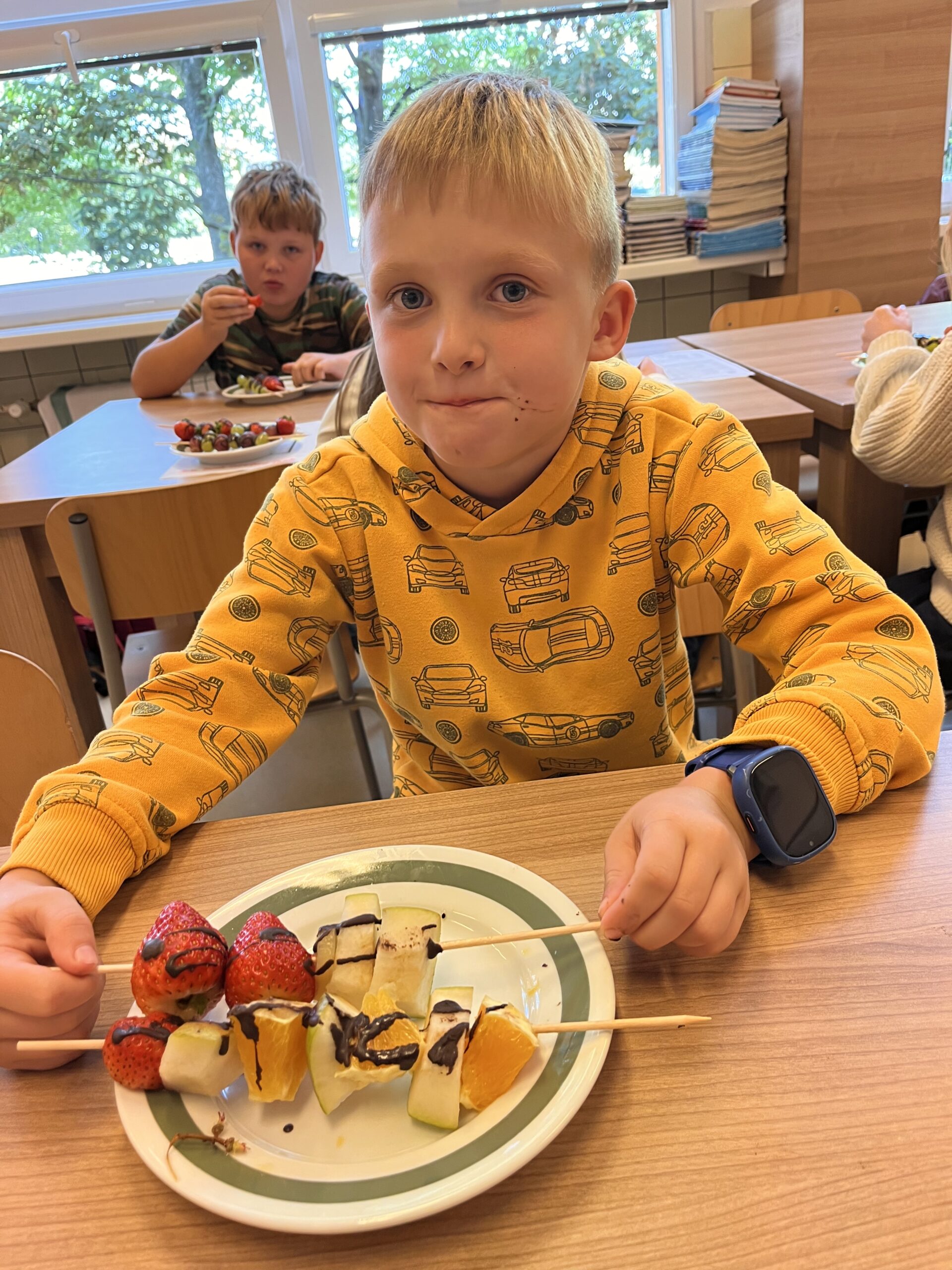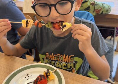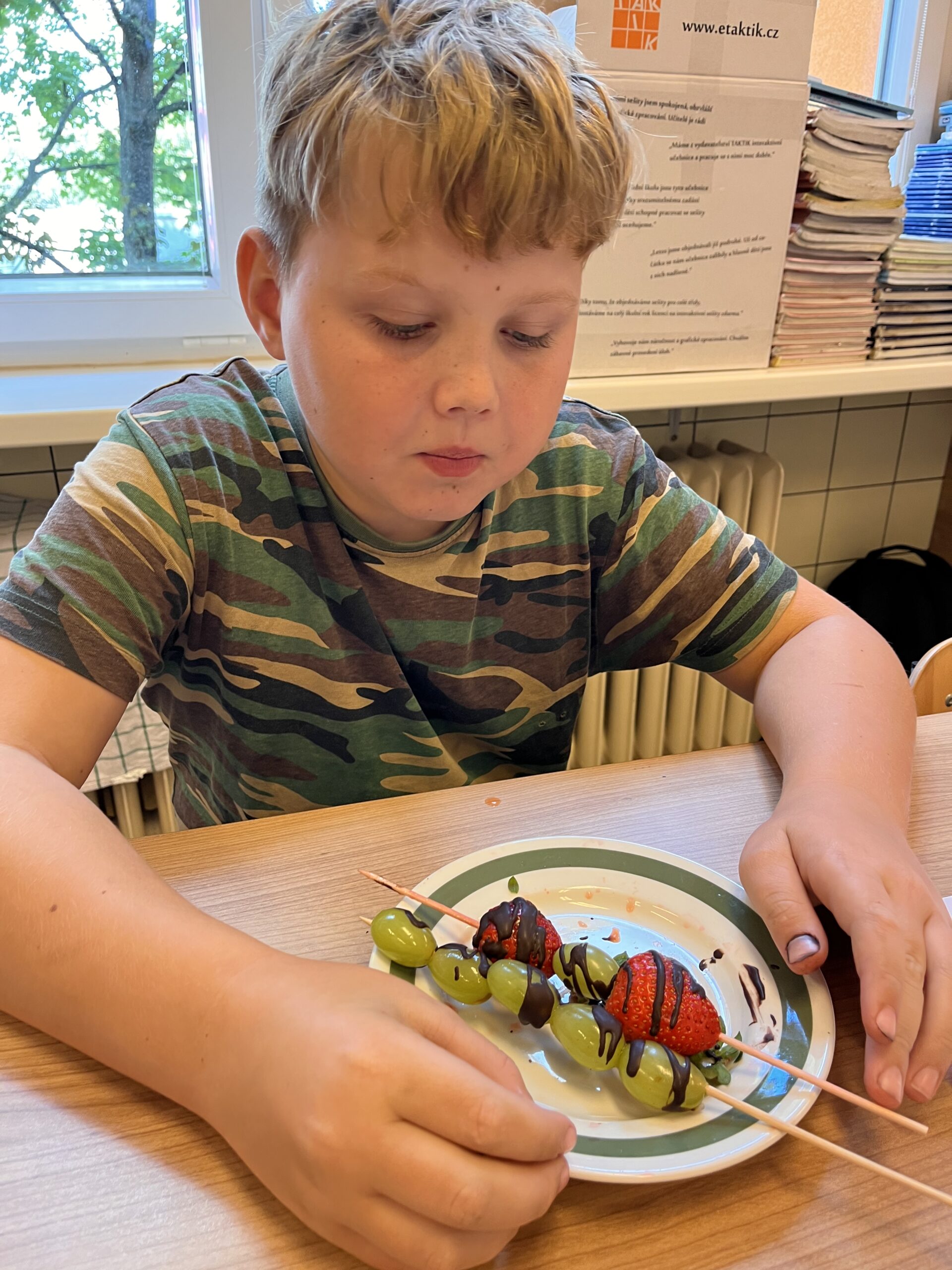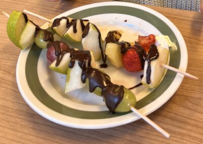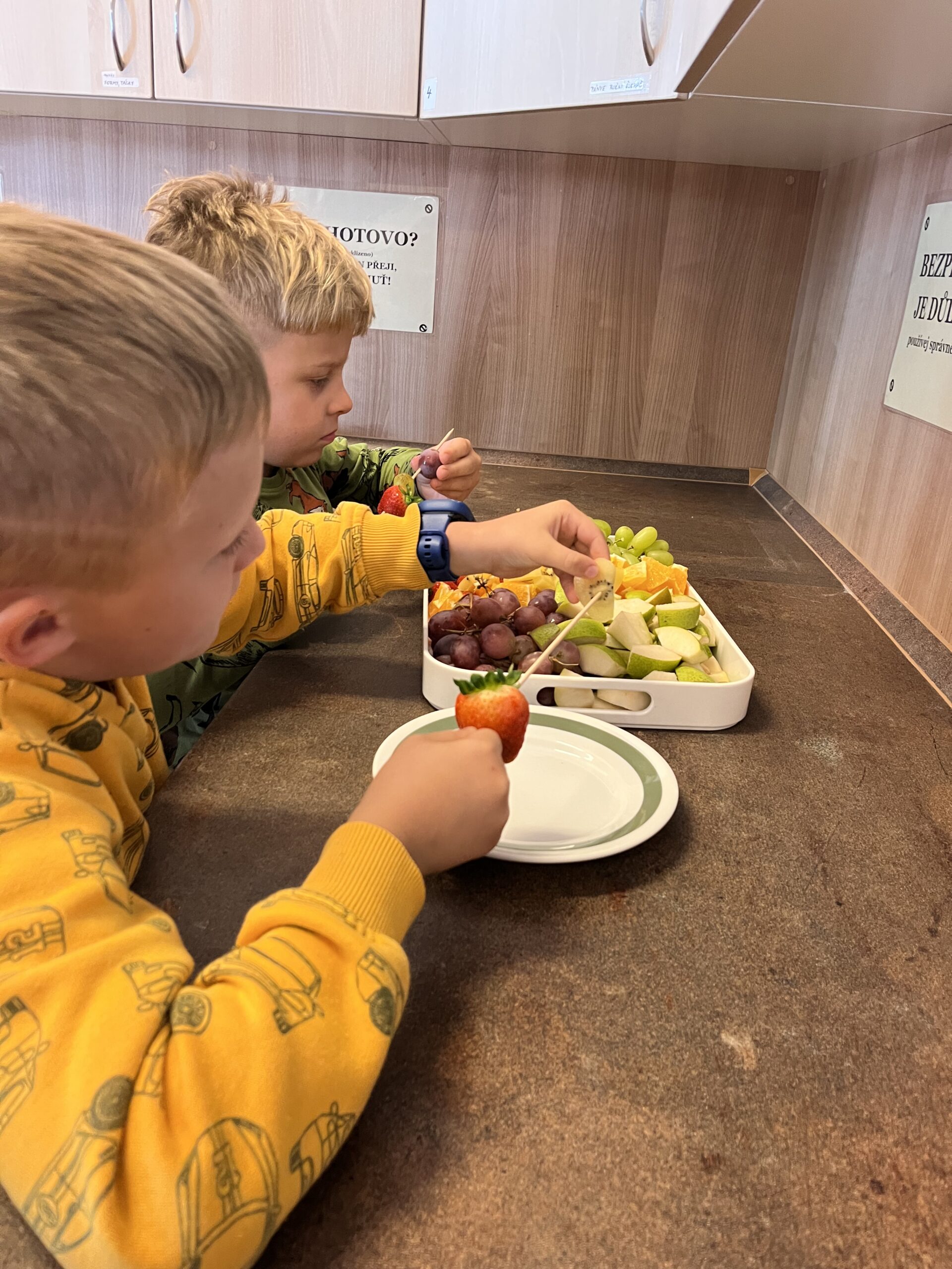 Hned při první hodině byla nálada skvělá a práce dětem šla od ruky. Na menu byly barevné ovocné špízy, které si děti samy připravily a nakonec ozdobily rozpuštěnou čokoládou. Nejen, že si při tom procvičily zručnost a fantazii, ale také si společně pochutnaly na zdravé i sladké dobrotě.
