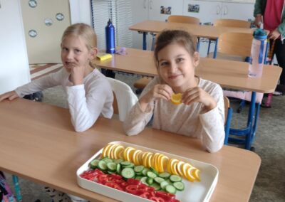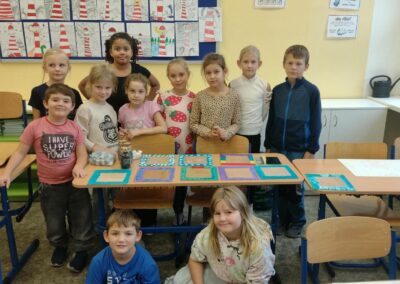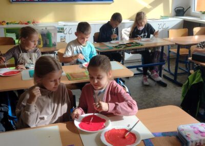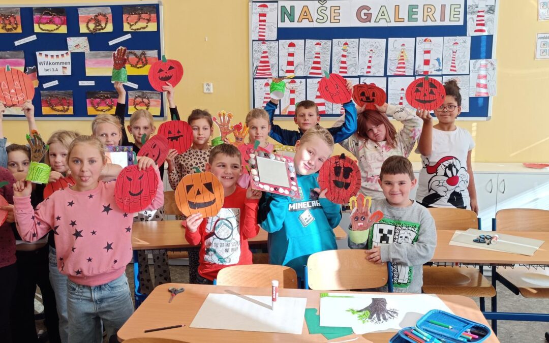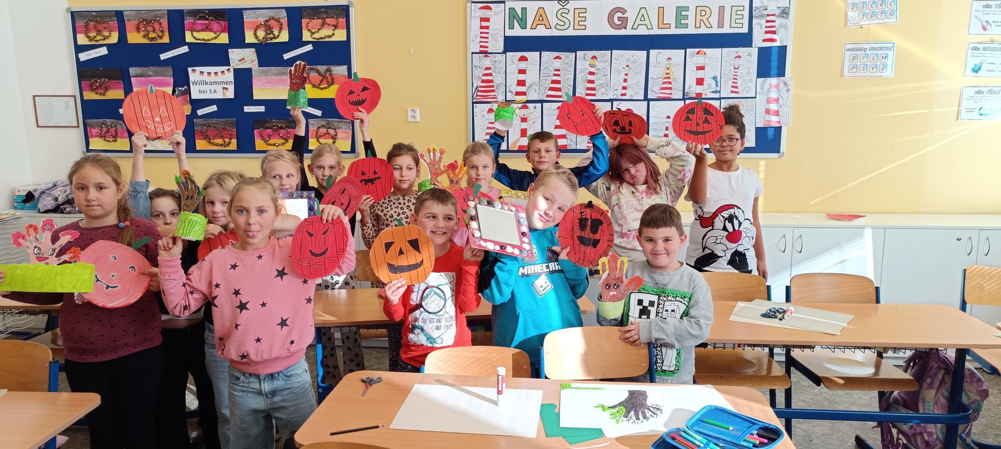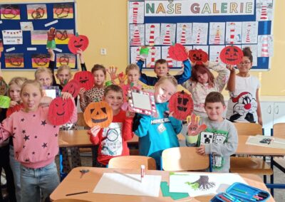 Další hodina se nesla v duchu podzimního tvoření. Žáci vyráběli veselé dýně s obličeji a barevné stromy z obkreslené ruky, které ozdobili lístečky, travou a stojánkem. Hotová díla rozzářila celou třídu a potom si je děti s radostí odnesly domů.