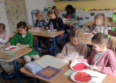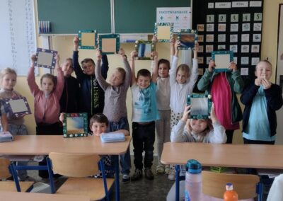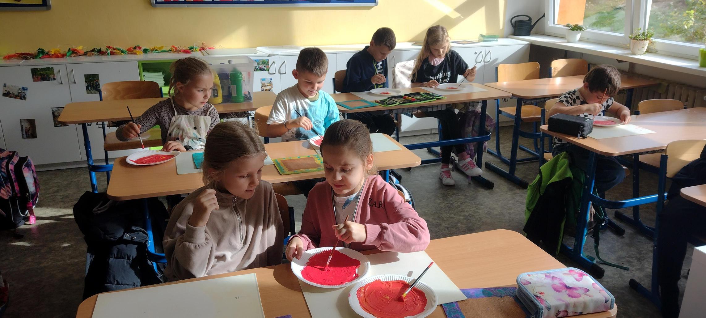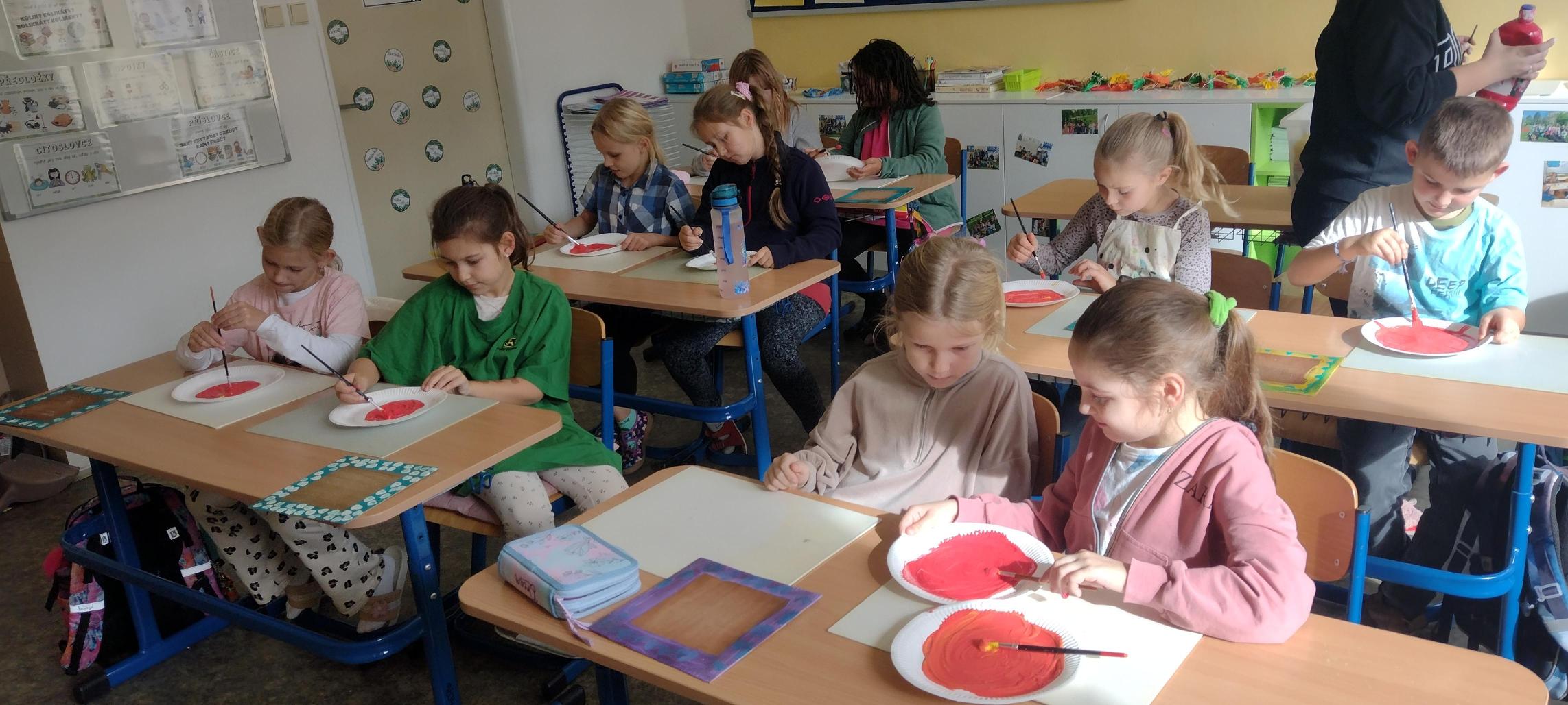 Děti mají za sebou už několik hodin, které si opravdu užívají. Na jedné z prvních hodin se děti pustily do přípravy rámů na zrcadla. Po krátkém ovocném občerstvení si každý vybral vlastní barvy a s pečlivostí natřel svůj překližkový rám. Po zaschnutí si ho děti ozdobily podle své fantazie.